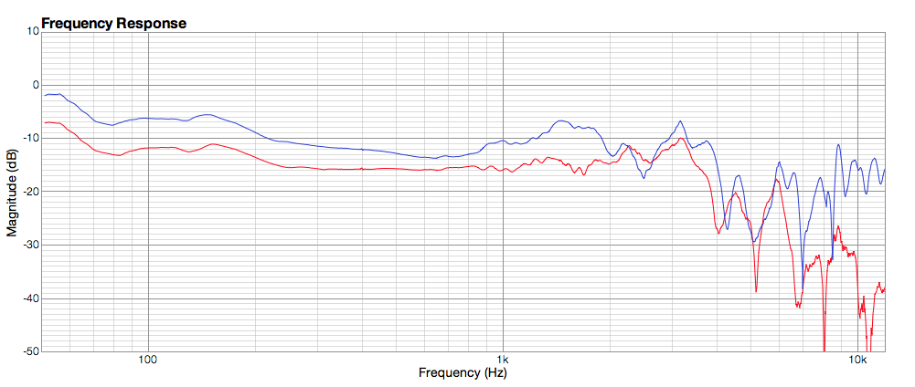 In the frequency chart above, the red line is the front or square face of the microphone, and the blue line is the sloping side or rear. The ribbon is closer to the sloping side of the microphone.