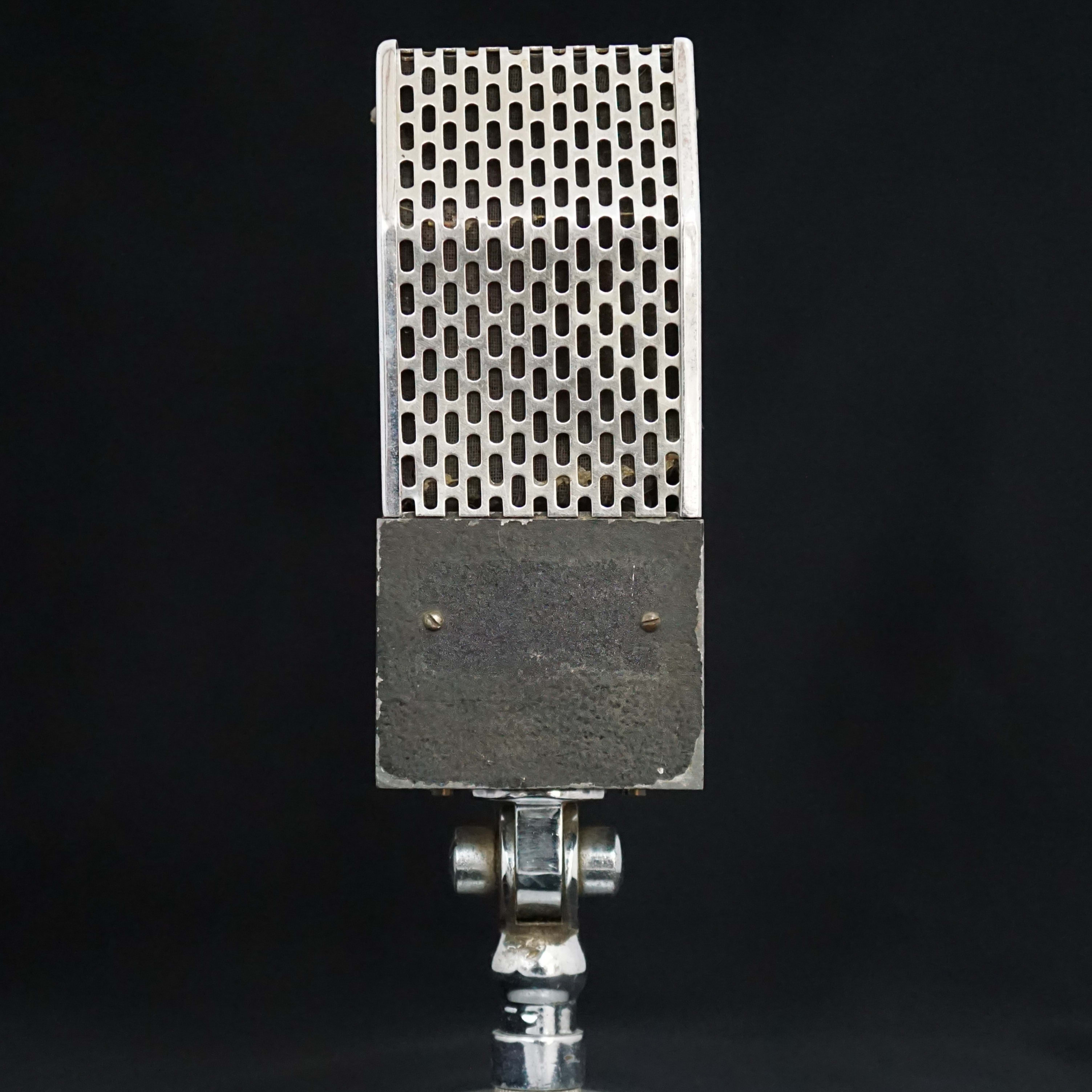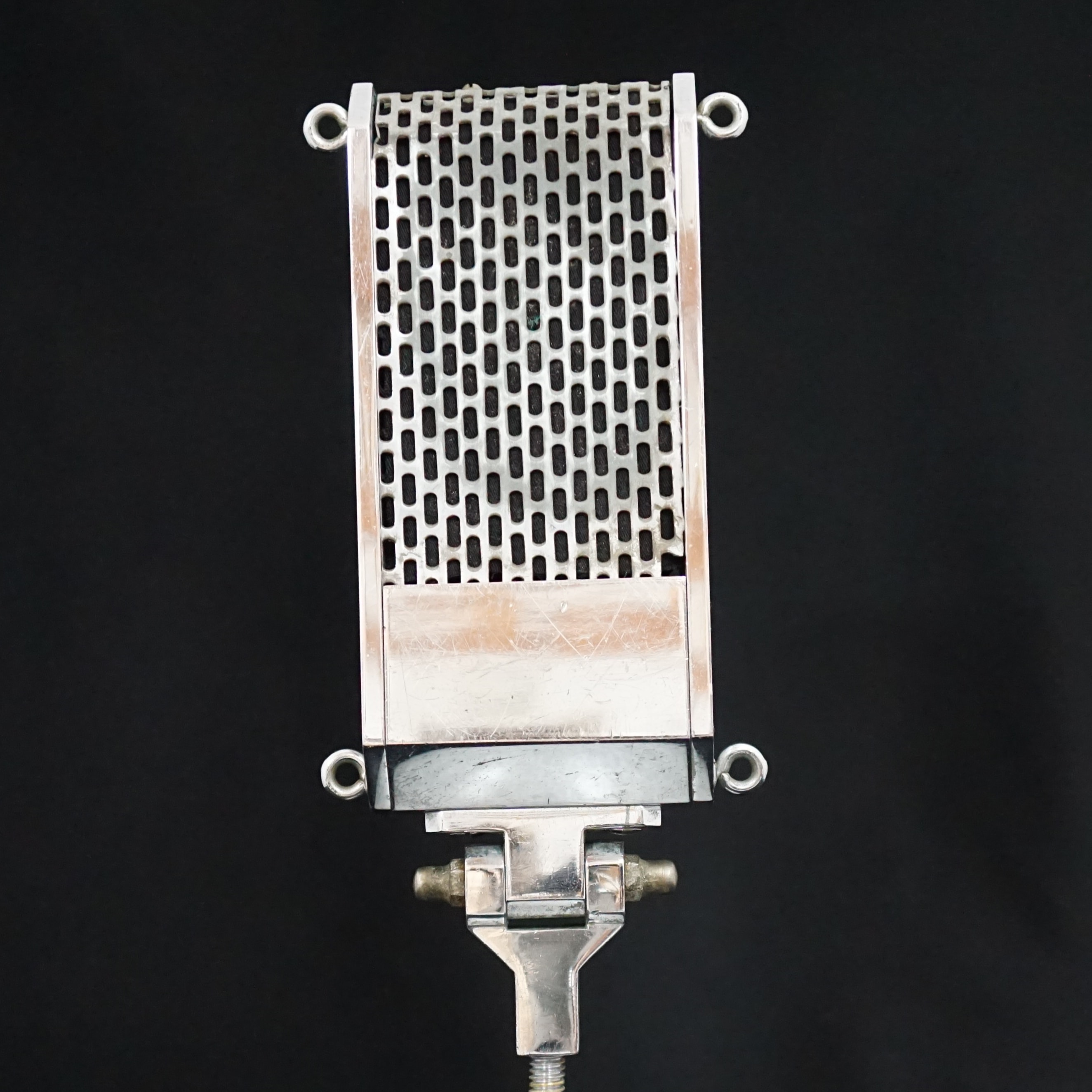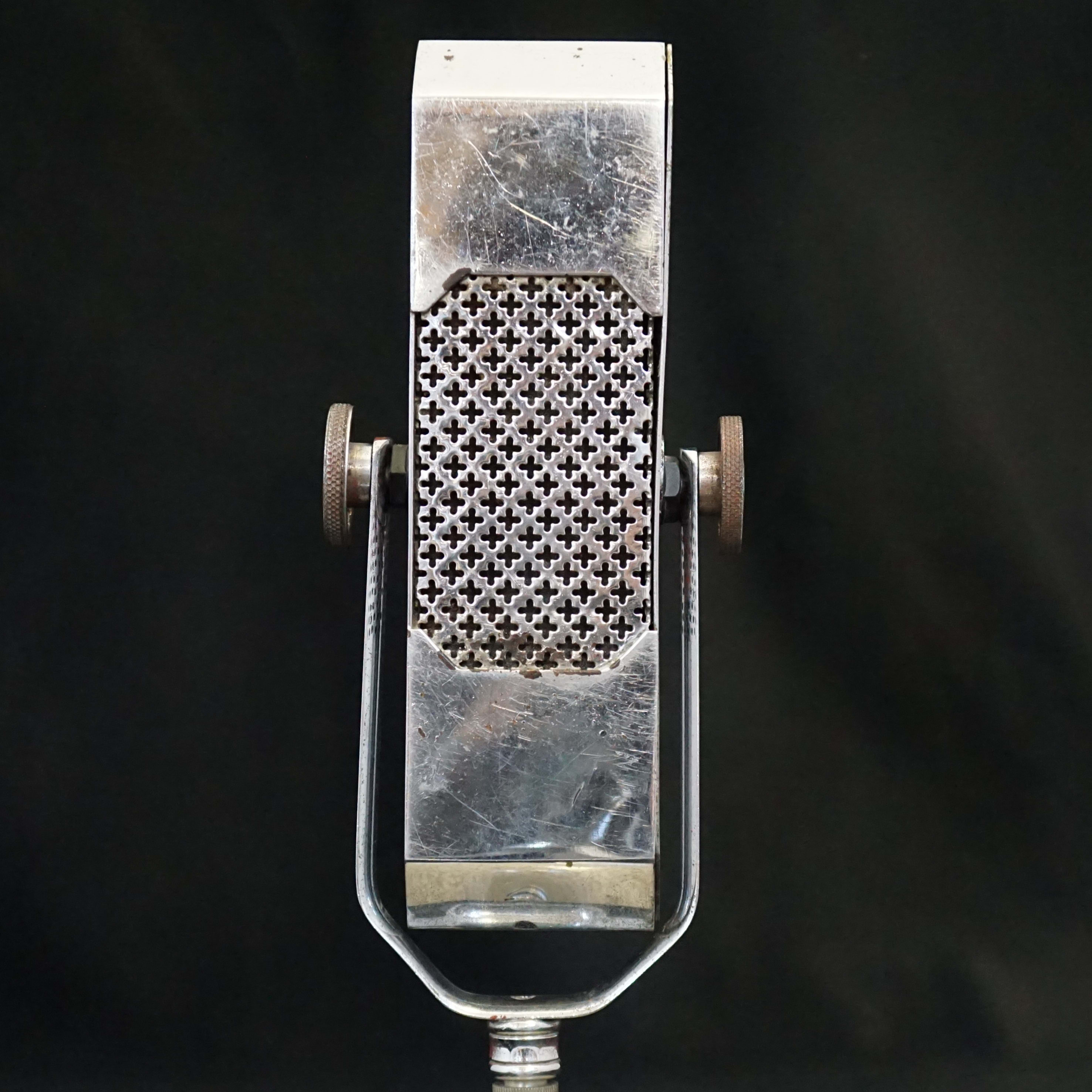 The form of the microphone indicates that it was almost certainly a ribbon transducer. Unfortunately our example is missing its motor. It shares some design features with the Shaftesbury RT ribbon microphones, including the slotted grill and tilting mount, although we are unaware of any formal relationship between the two companies.