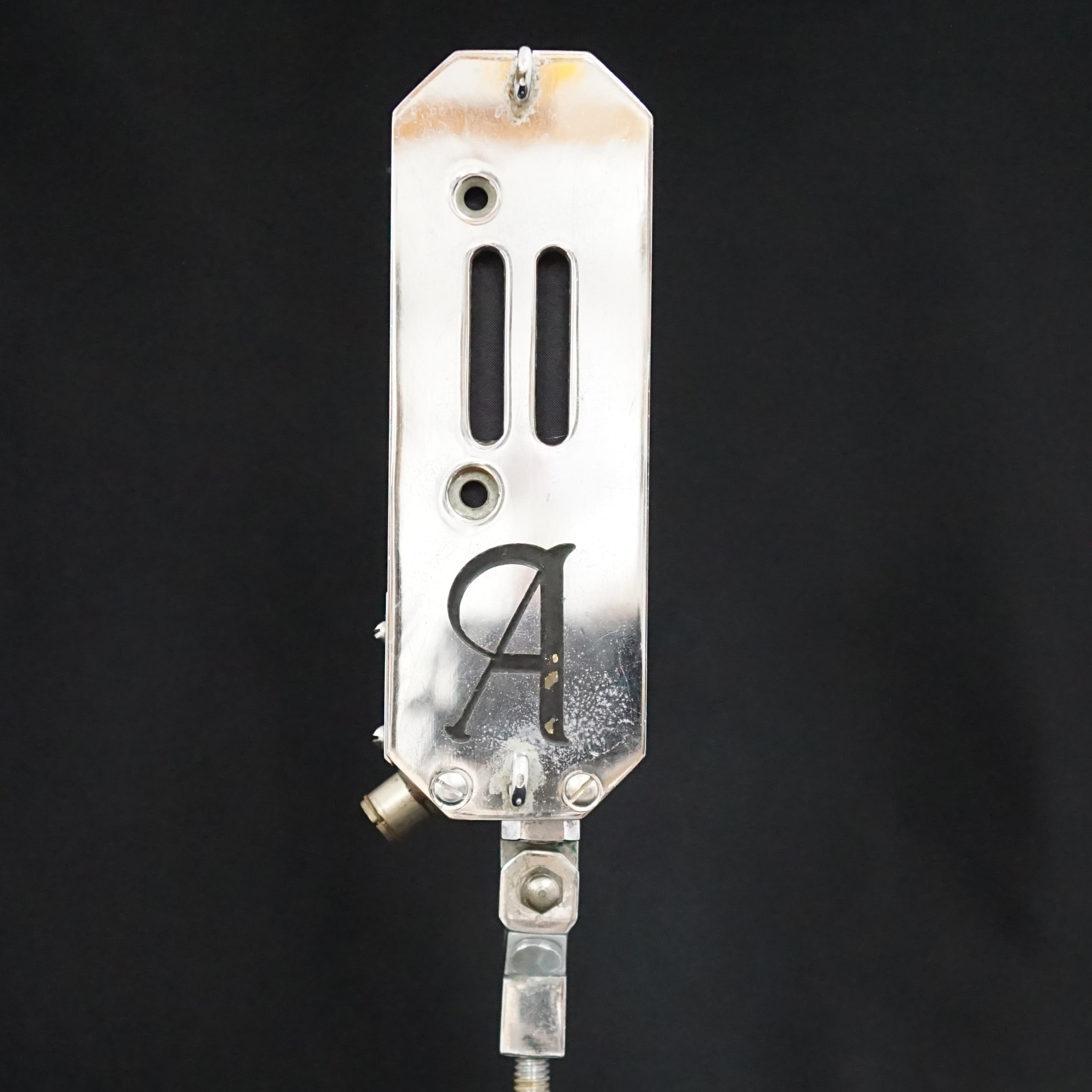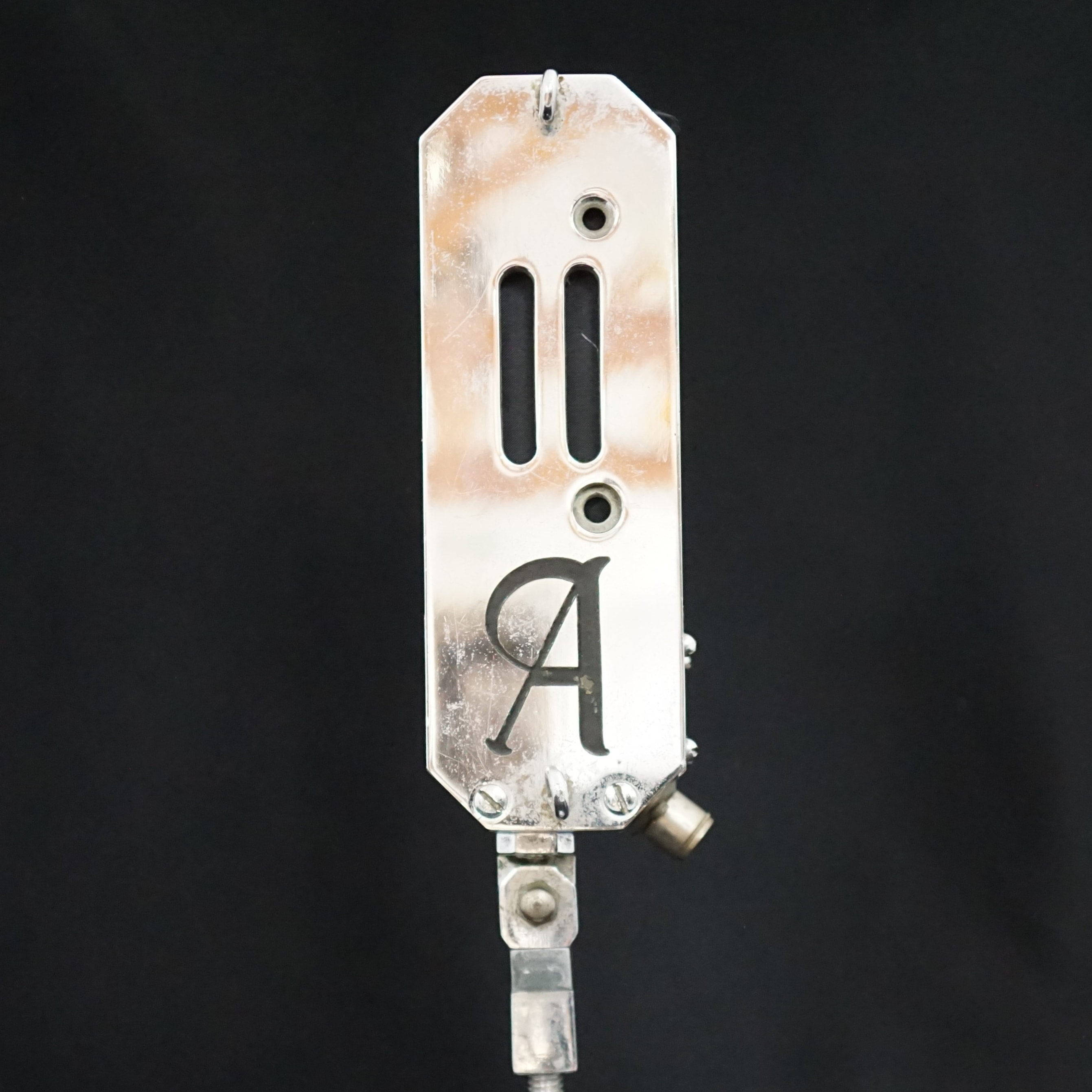 This microphone was designed to be mounted on a stand but also has hooks for use in a suspension ring. This feature suggests that it was made sometime in the 1930s. The chrome plating is excellent with a stylish design and striking logo that appears to based on the letters A and a reversed R. The aluminium slotted grill has faired less well.