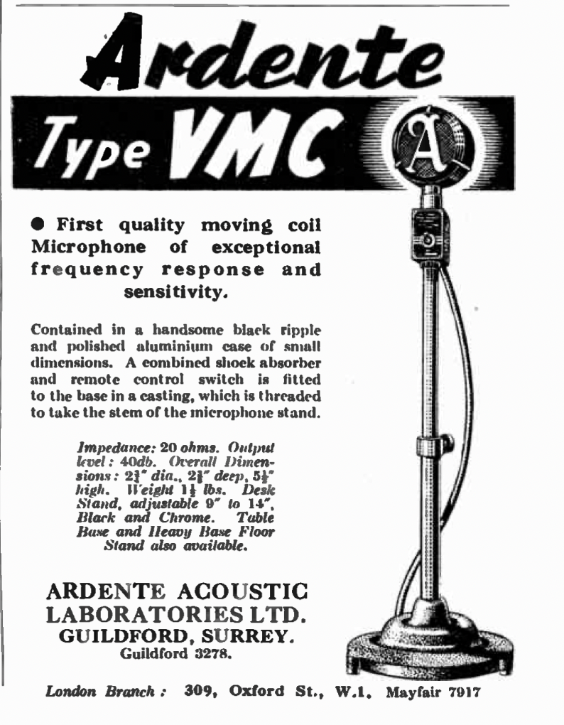 This is an early British ribbon microphone by Ardente Acoustic Laboratories, who had addresses in Oxford Street, London and Guildford in Surrey. Ardente were known for making public address equipment as well as hearing aids and speakers. The name 'Ardente' was derived from the company's founder, a Mr R H Dent.
