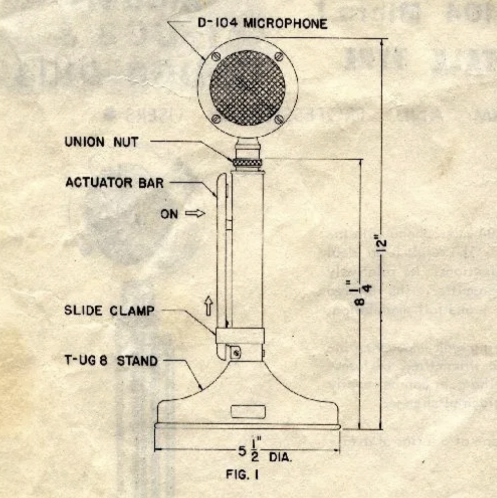 Introduced in 1933, the Astatic model D-104 became known for its high frequency response that contributed to better communications audio quality. Early D-104 mikes used a 1" thick case, a large ID tag, and holes for "ring & spring" mounts. The design was modified in April 1937 with smaller tags and reduced thickness. A black "grip" switch stand ("G" Stand) with a metal ID tag was manufactured in January 1938. A solid-state amplifier was incorporated into the "G" stand in the 1960s.