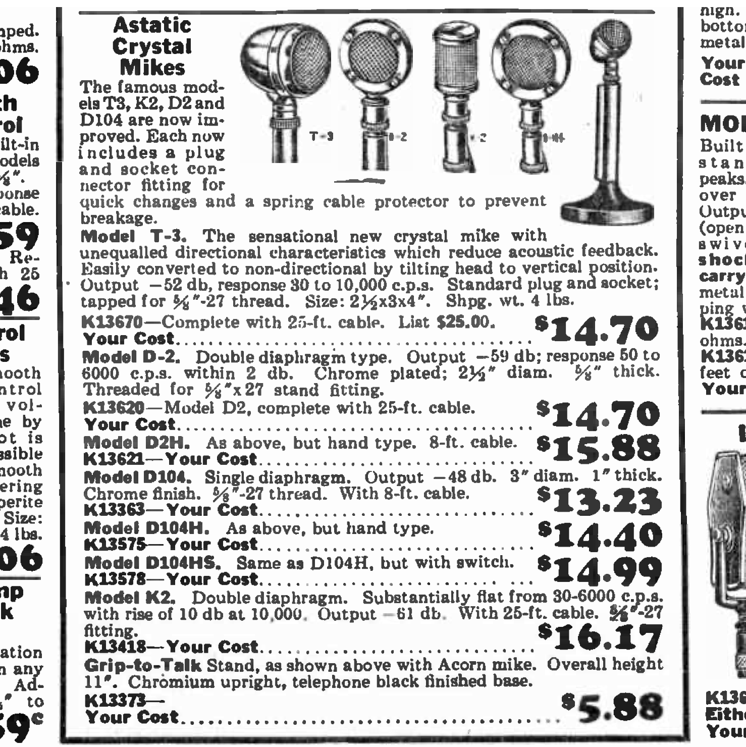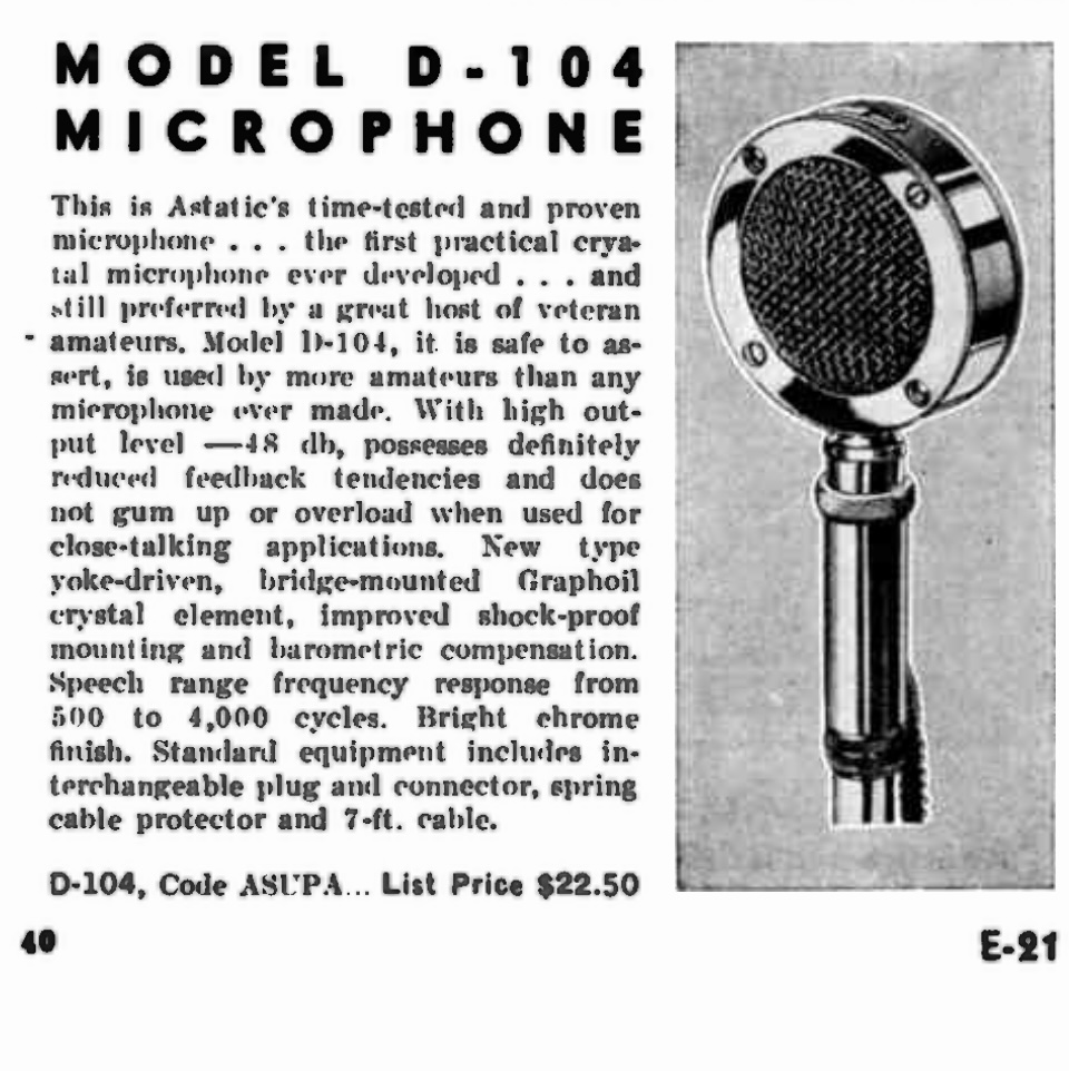 This is Astatic's time-tester and proven microphone - the first practical crystal microphone ever developed - and still preferred by a great host of veteran - amateurs. Model 1-104, it. is safe to assert, is used by more amateurs than any microphone ever made. With high output level -48 dB, possesses definitely reduced feedback tendencies and does not gum up or overload when used for close-talking applications. New type yoke-driven, bridge-mounted Graphoil crystal element, improved shock-proof mounting and barometric compensation.