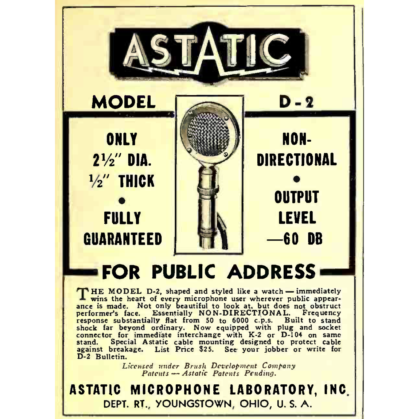The D-2 and other Astatic crystal microphones were widely available and advertised in many publications through the 1930s, including, for example, the Radio Master's Encyclopaedia of 1936, and the Hughs-Peters Radio Buying Guide in 1937.