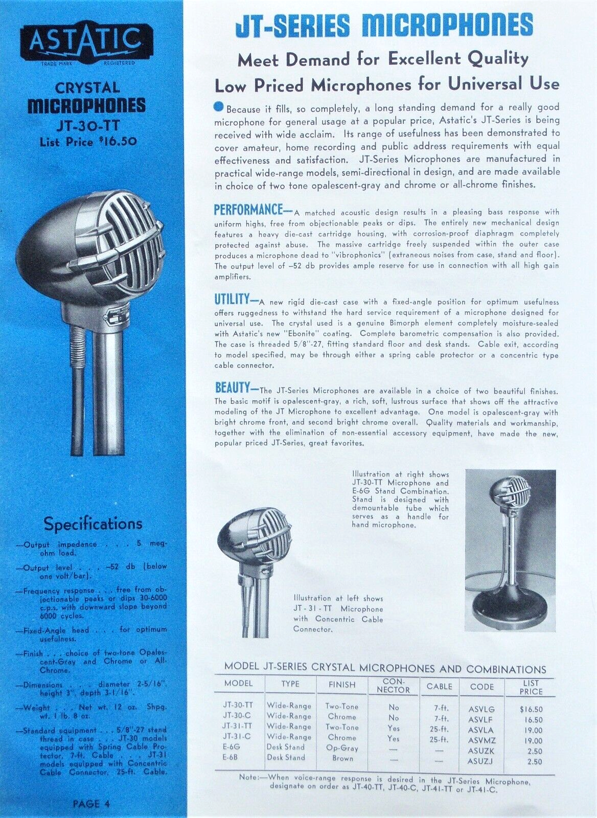 Because it fills, so completely, a long standing demand for a really good microphone for general usage at a popular price, Astatic's JT-Series is being received with wide acclaim. Its range of usefulness has been demonstrated to cover amateur, home recording and public address requirements with equal effectiveness and satisfaction. JT-Series Microphones are manufactured in practical wide-range models, semi-directional in design, and are made available in choice of two tone opalescent gray and chrome or all-chrome finishes.