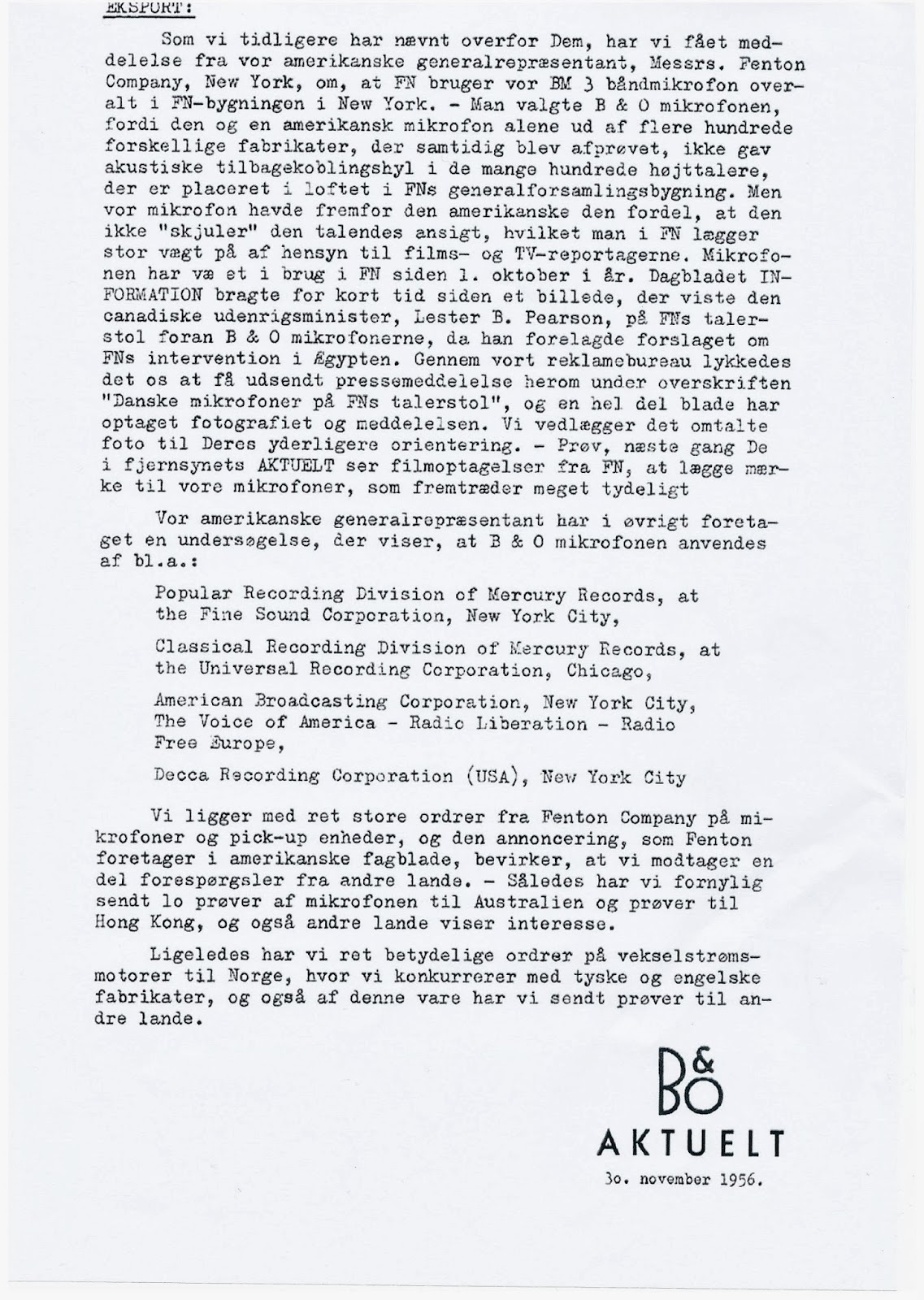 "Our American representative has also undertaken an investigation that shows B&O microphones are used at, amongst others: Mercury, ABC and Decca. We have large orders from Fenton company for microphones and pick-up units, and the advertising that Fenton performs in the American technical journals has the effect that we receive requests from other countries. This has resulted in that we have recently sent 10 samples to Australia and samples to Hong Kong, and other countries are also showing interest.
