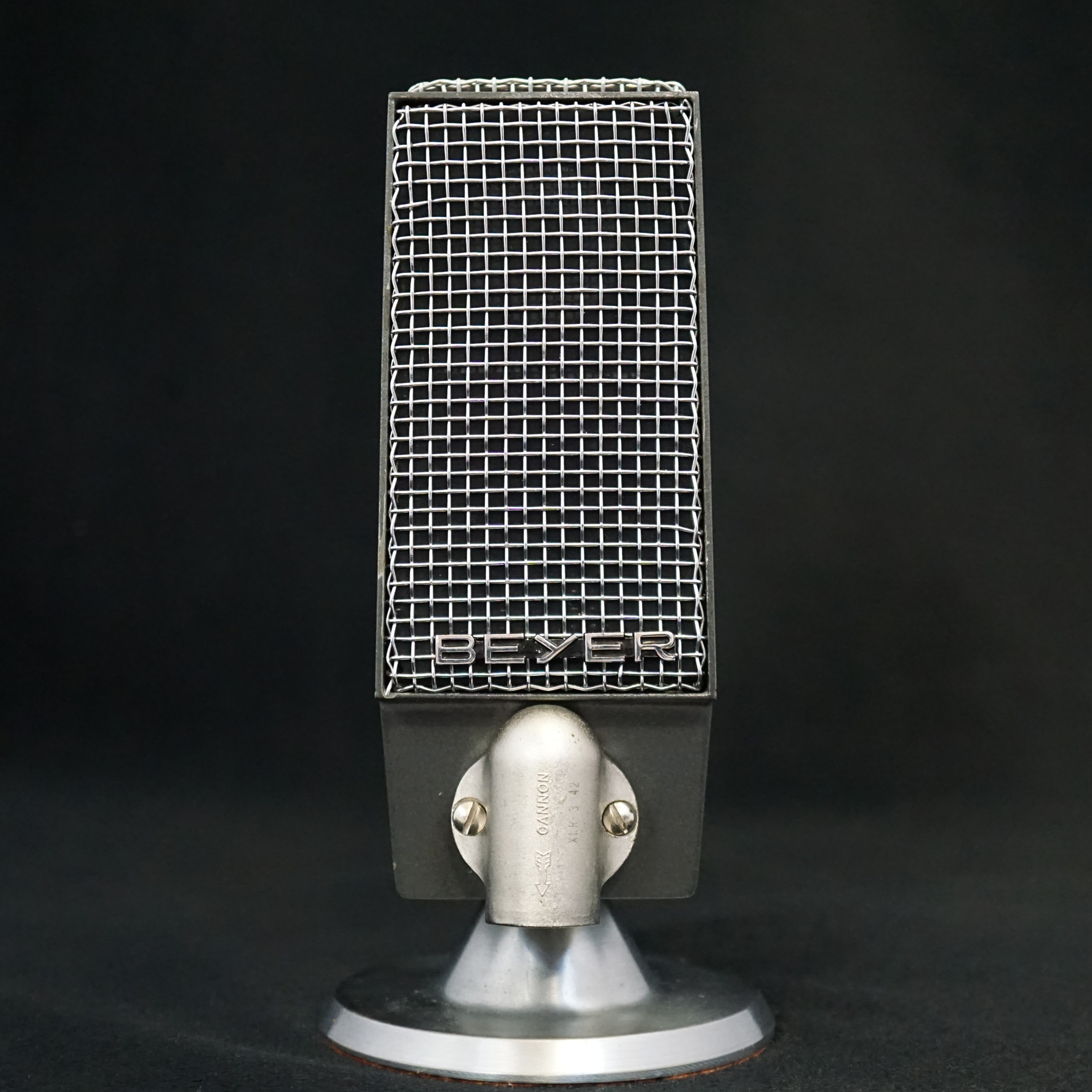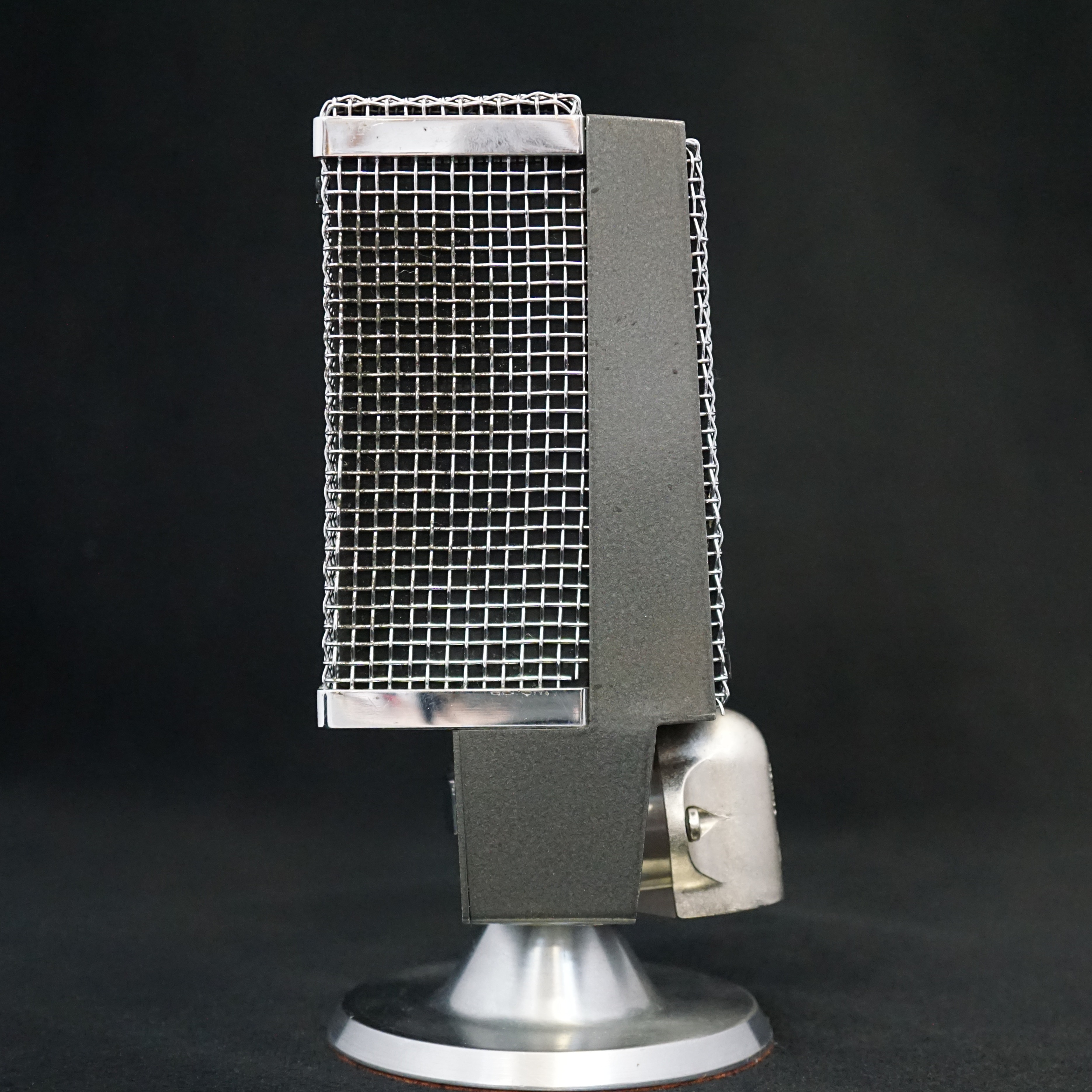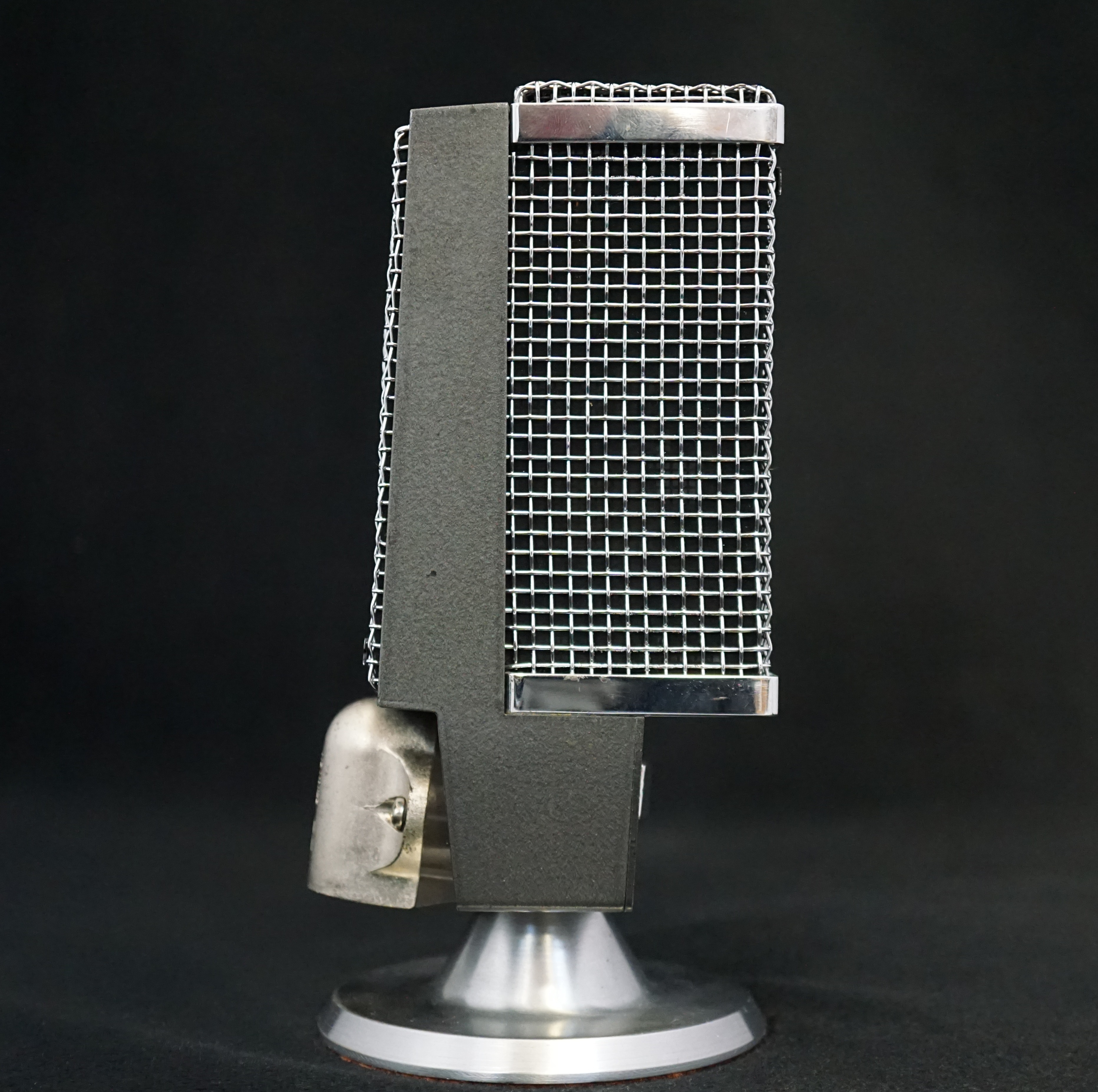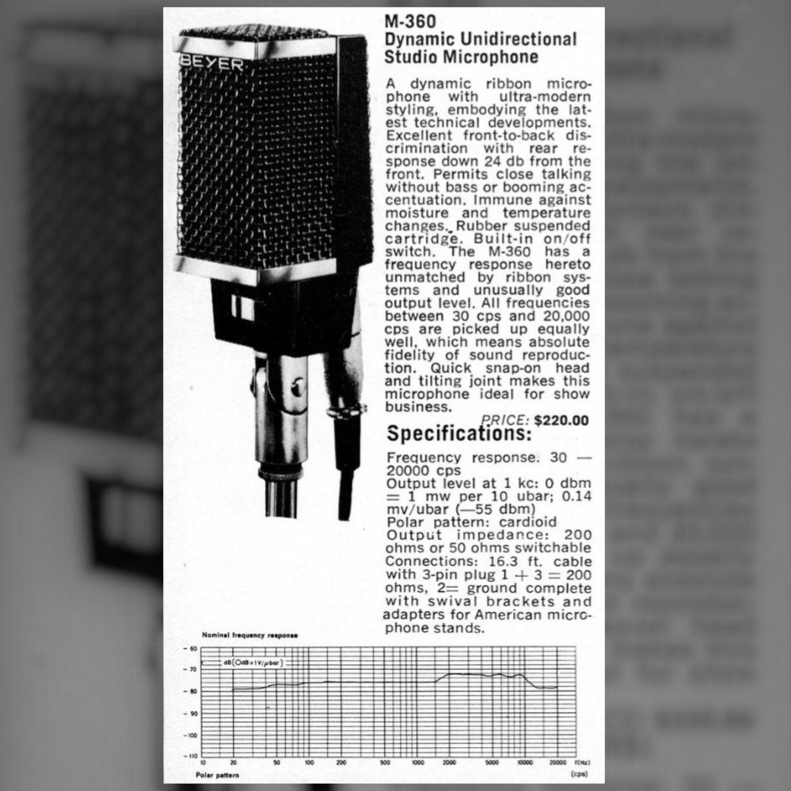 "A dynamic ribbon microphone with ultra-modern styling, embodying the latest technical developments. Excellent front-to-back discrimination with rear response down 24 db from the front. Permits close talking without bass or booming accentuation. Immune against moisture and temperature changes. Rubber suspended cartridge. Built-in on/off switch. The M-360 has a frequency response hitherto unmatched by ribbon systems and unusually good output level. All frequencies between 30 cps and 20,000 cps are picked up equally well, which means absolute fidelity of sound reproduction. Quick snap-on head and tilting joint makes this microphone ideal for show business."