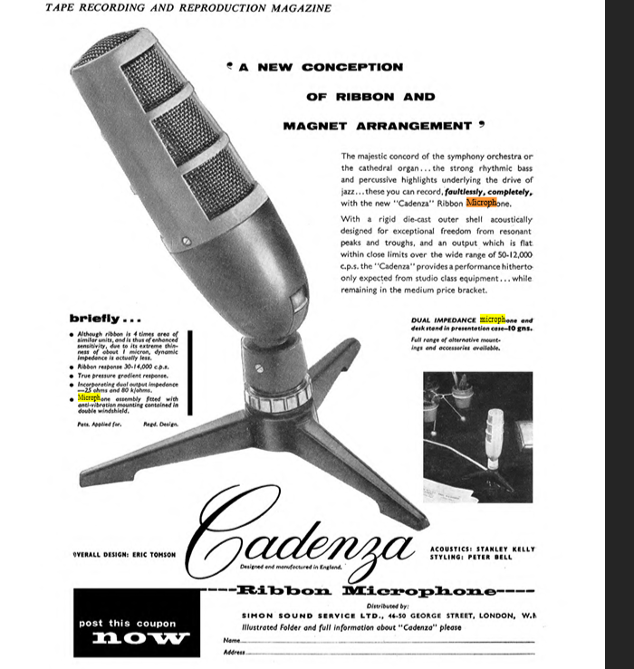 A patent for the Cadenza microphone was applied for in May 1957 and granted to Simon Equipment Ltd. in March 1959. Their claimed innovation was to glue the mid point of the ribbon to an insulated centre block and then clamp and tension each end of the ribbon separately, with the tuning frequencies slightly apart. From the patent: