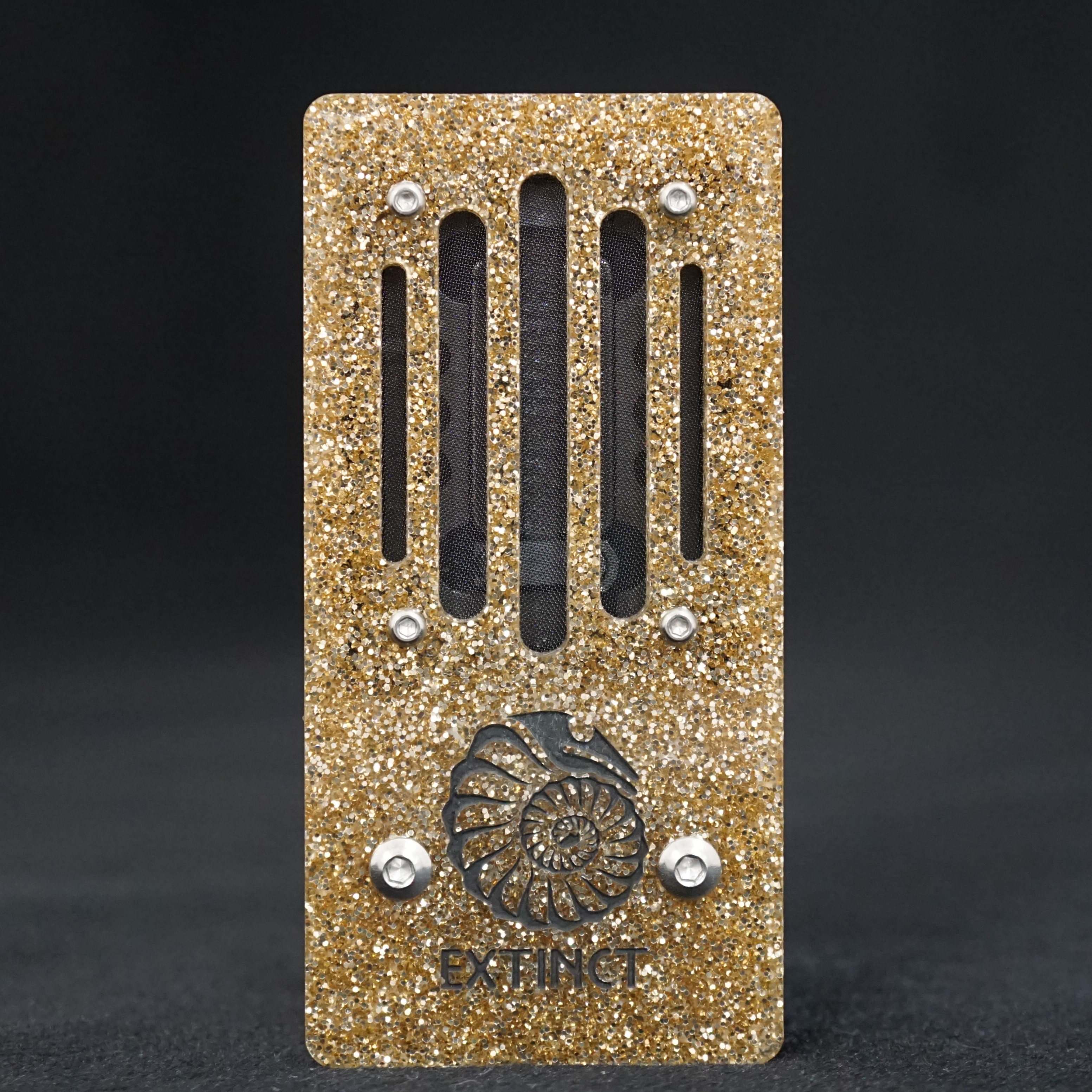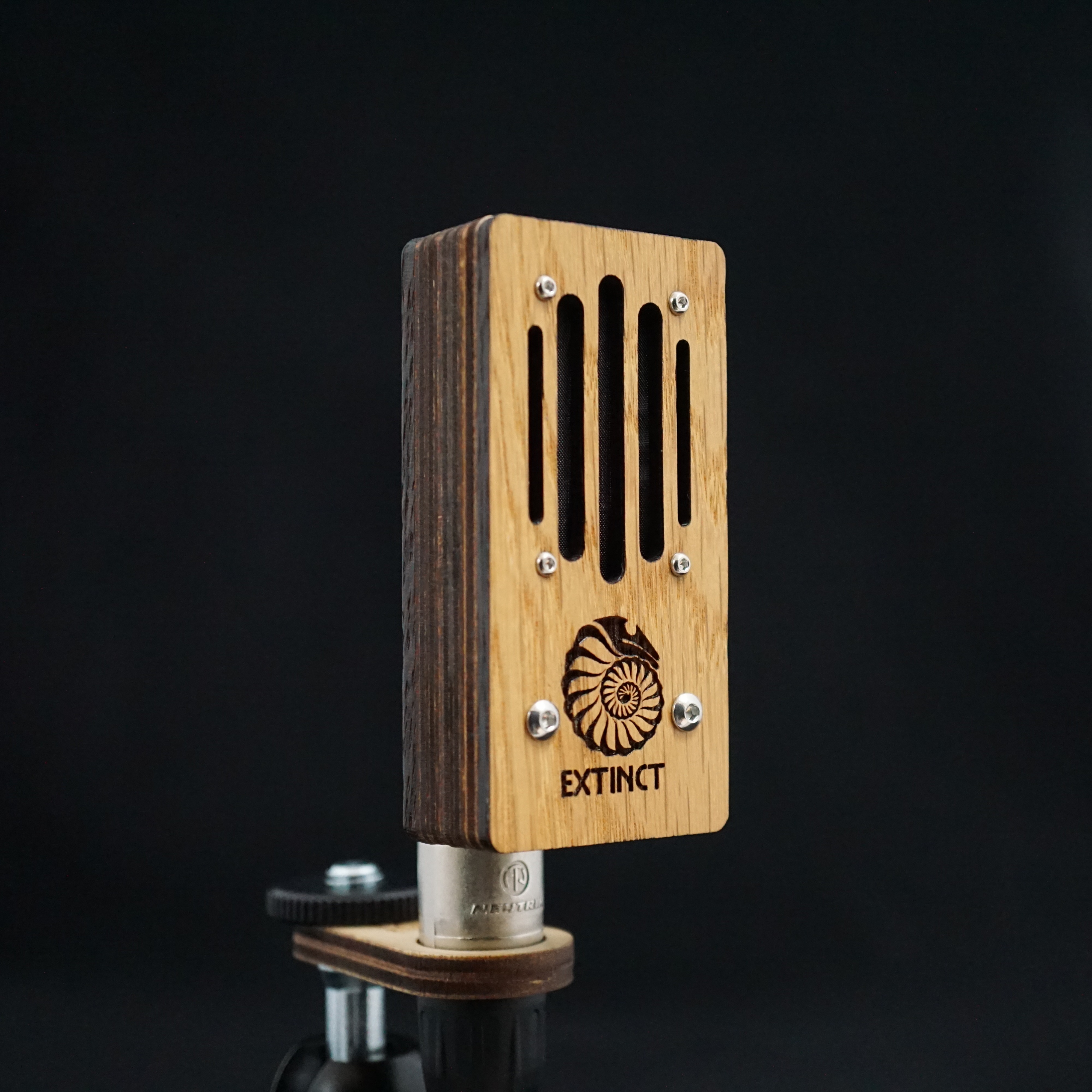 The design lends itself to variation - simply by swapping the material for the front and rear plates, we have made a range of different colours including tortoiseshell, gold sparkle and real walnut and oak woods. The latest mics were clear acrylic, which lets you see right inside the microphone."