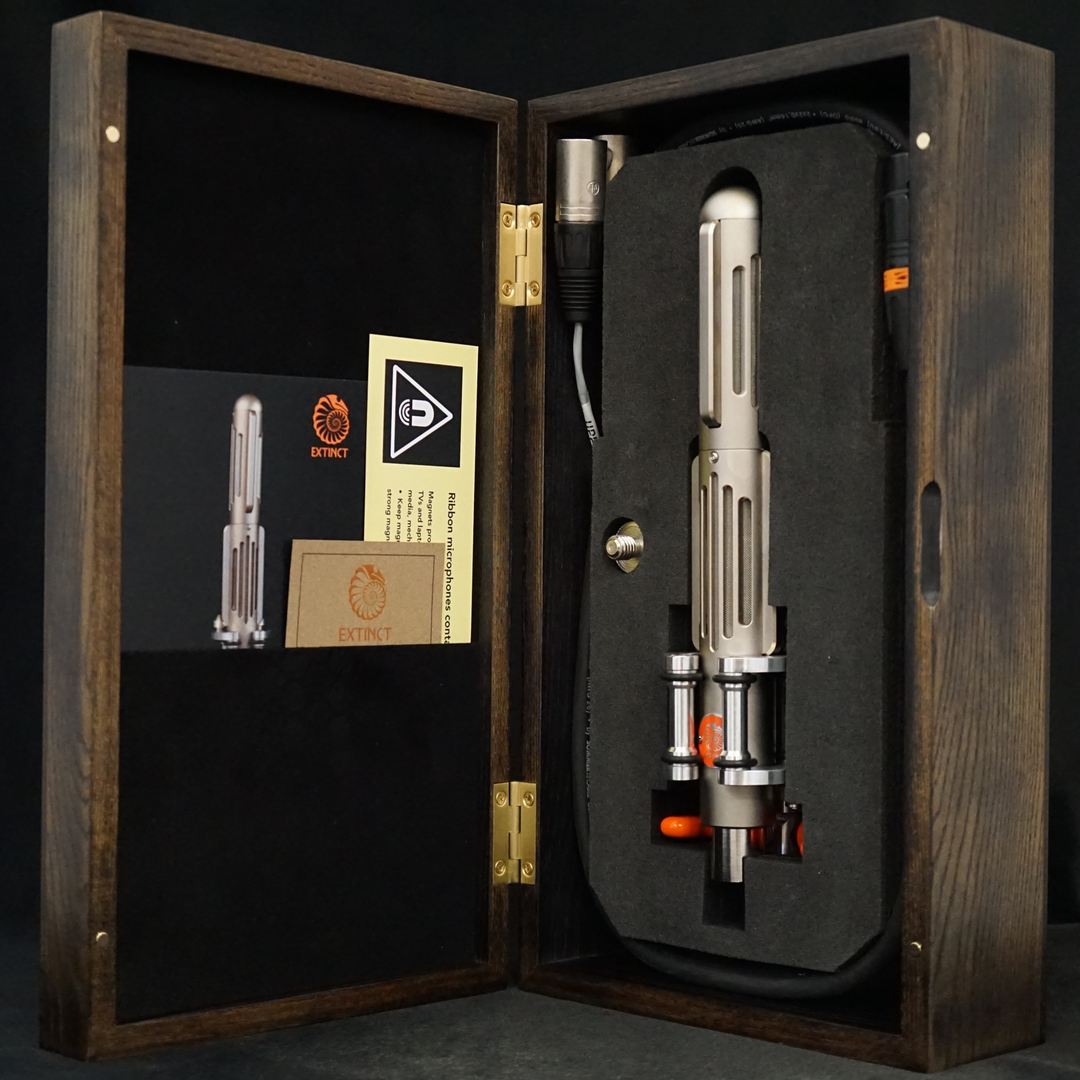 Early models were supplied with a robust plastic carry case, a 5 pin XLR cable and a breakout box to split the stereo signal into two mono channels. Current Valkyr microphones come in an elegant wooden box and a stereo cable that terminates in two mono XLR plugs. An optional Mid-Side decoder box is also avaliable on request, although most engineers would use a software plug in or an extra channel on their console to achieve the same result.