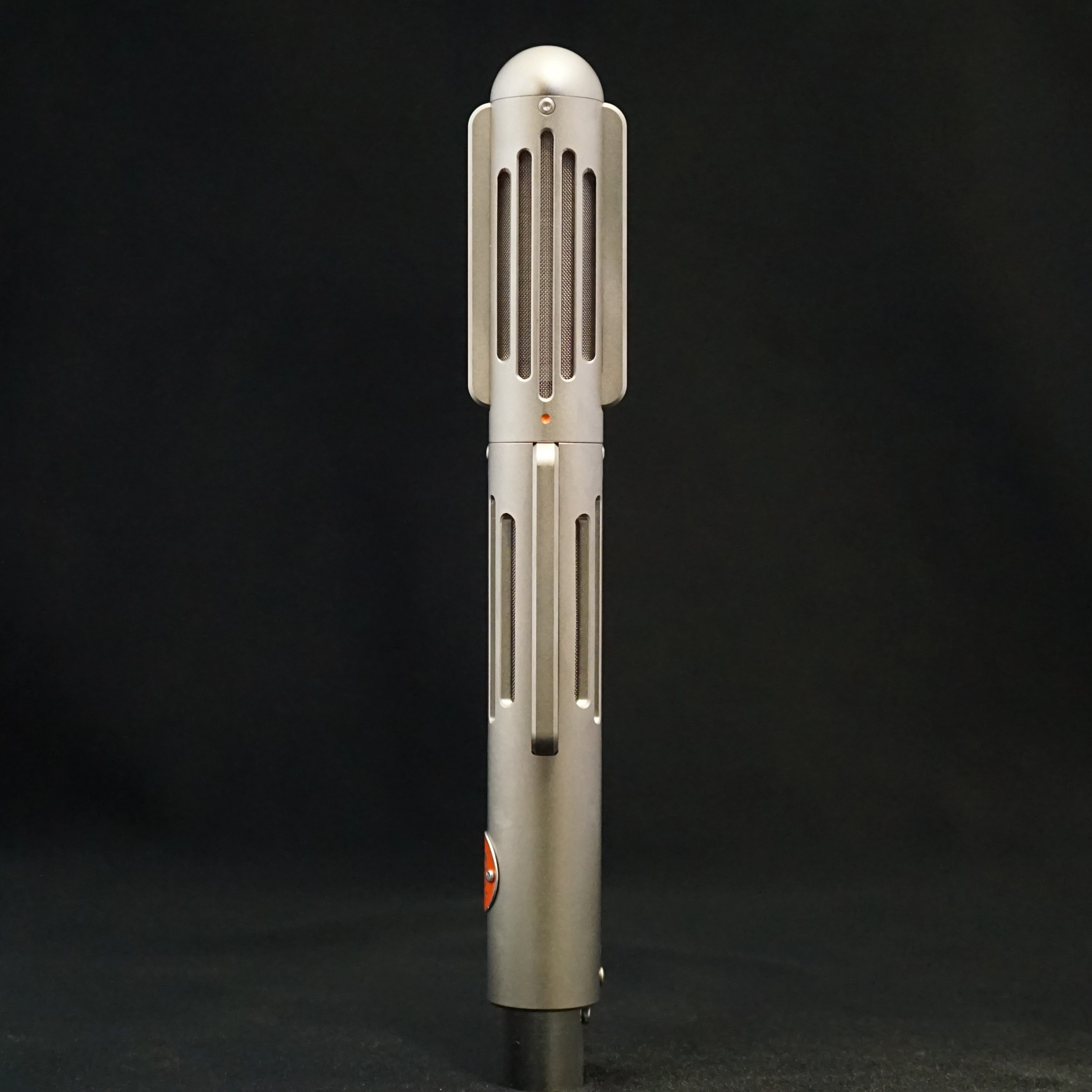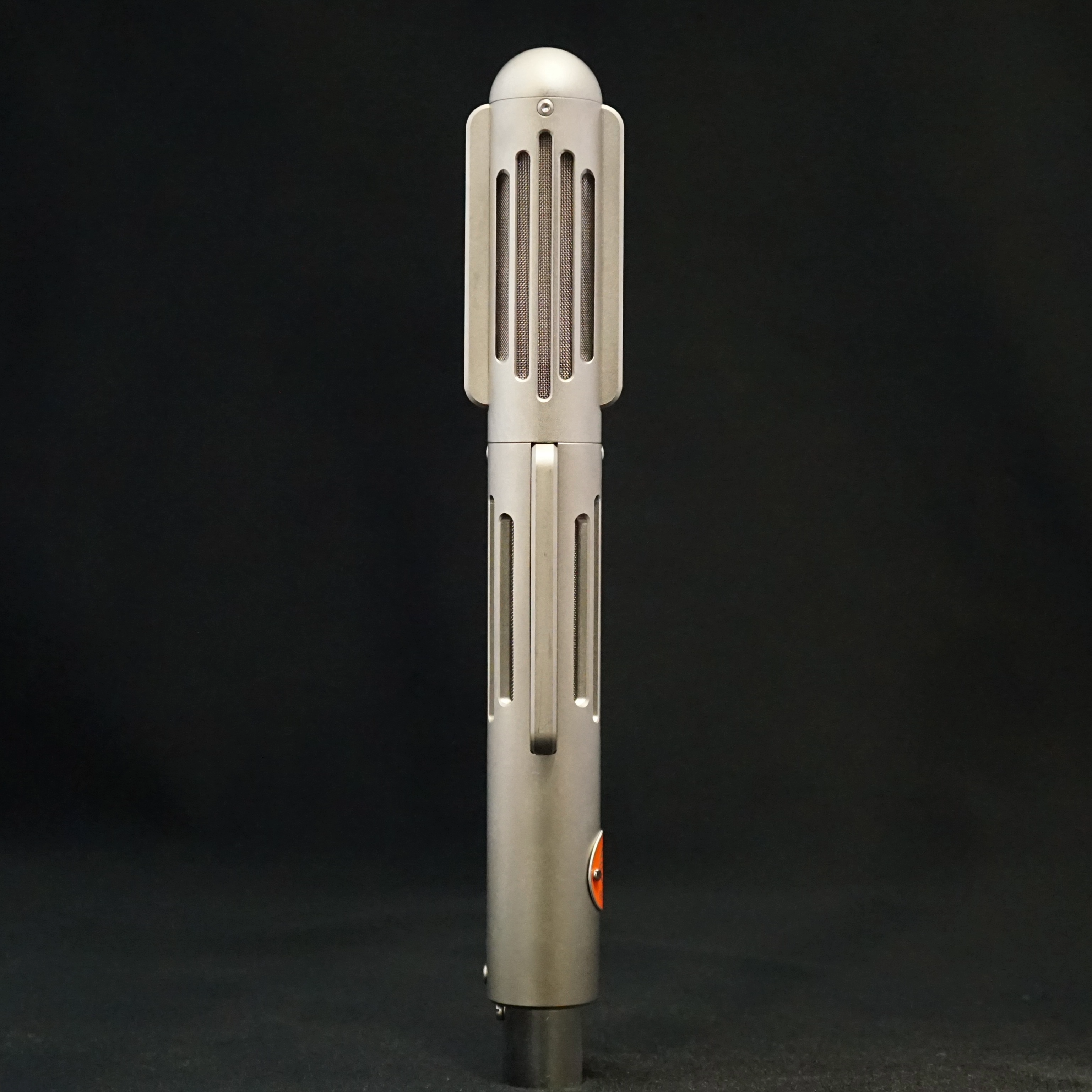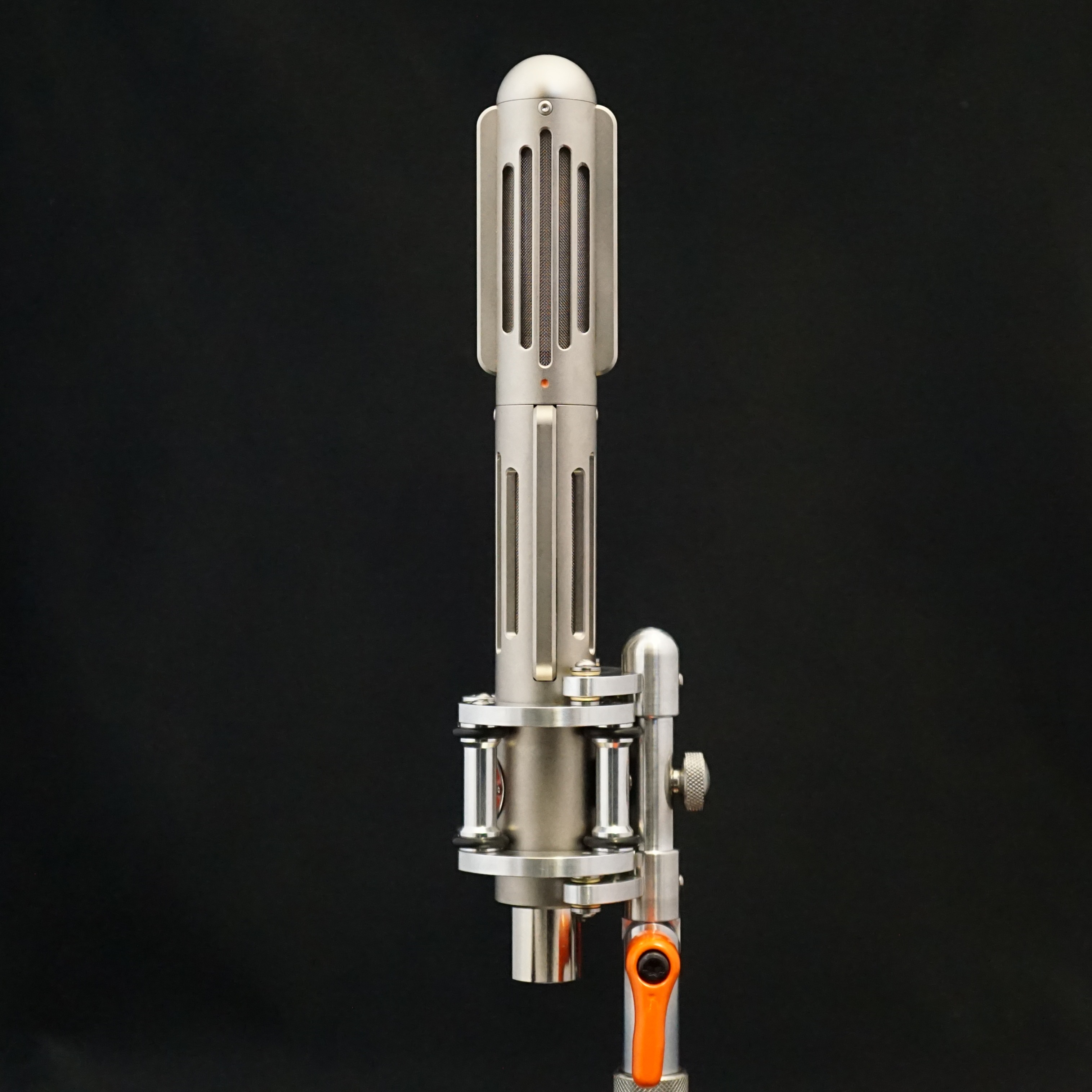 The Valkyr was launched in 2018 as a stereo version of the already popular BM9 ribbon microphone. The Valkyr uses two identical matched ribbons that are fixed at 90 degrees, making it ideal for Blumlein recordings or Mid-Side stereo. It is designed to be quick to set up and record. The front (i.e. positive lobe) of the lower channel is identified by the orange badge and the front of the top channel is marked with a small indent that is (usually) infilled with orange paint.