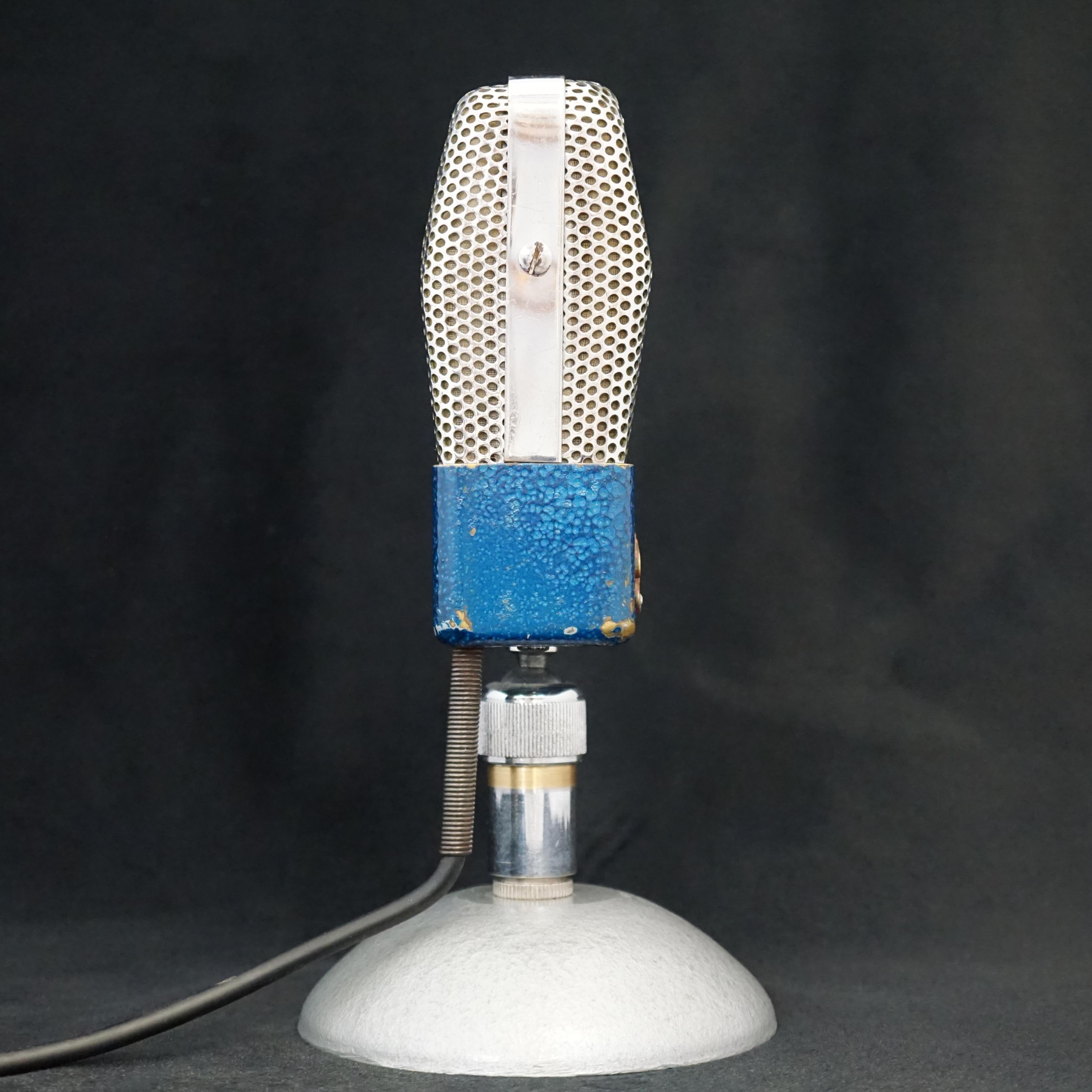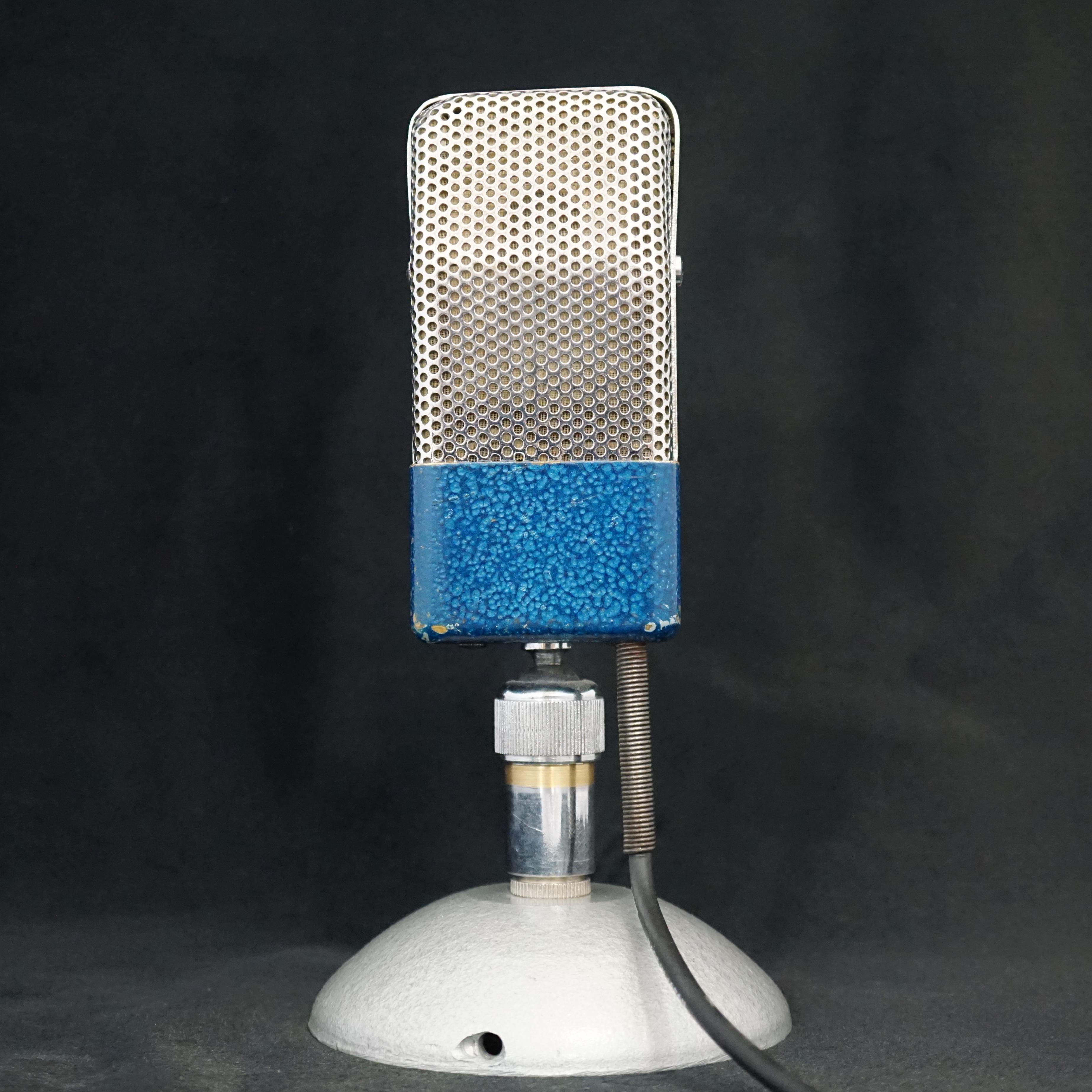 This small ribbon microphone has a beautiful metallic blue hammertone finish to the lower body, and nice chrome grills that are reminiscent of the RCA 74B.