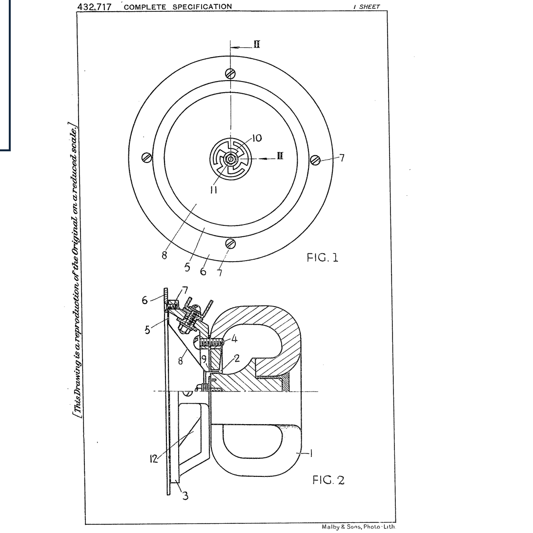 The microphone is covered by British patent number GB432717A, which is dated 1st February 1935 and was filed by Donald McMillan of North Harrow in Middlesex. Interestingly the patent was not filed by GEC, so perhaps they licensed or bought the intellection property from the inventor. The patent claims the following:
