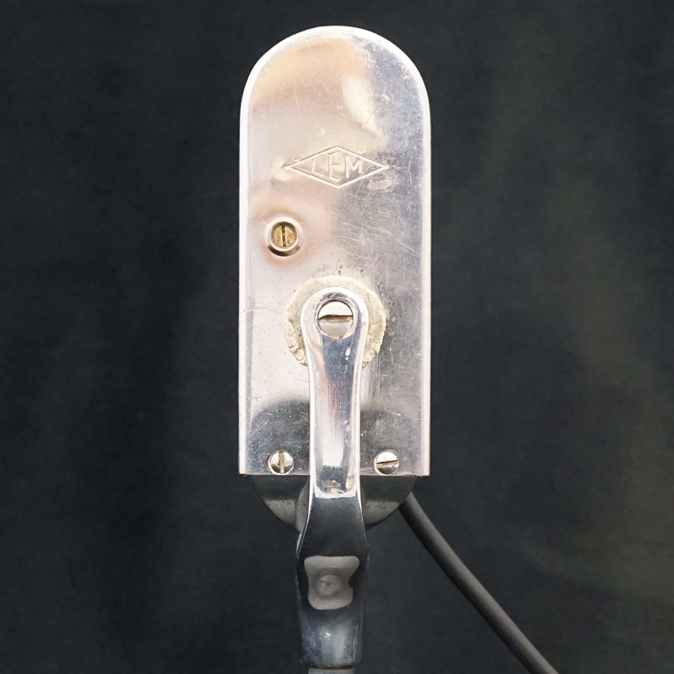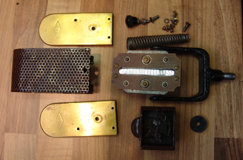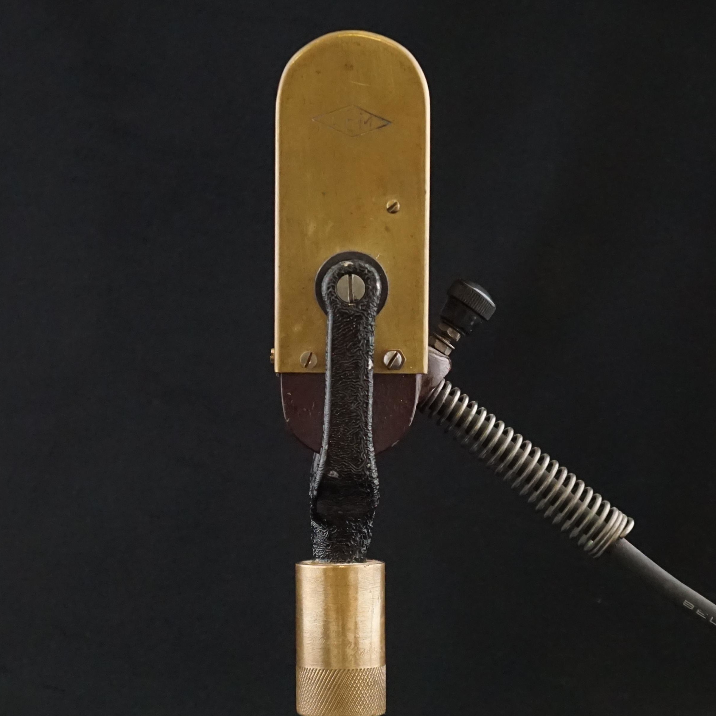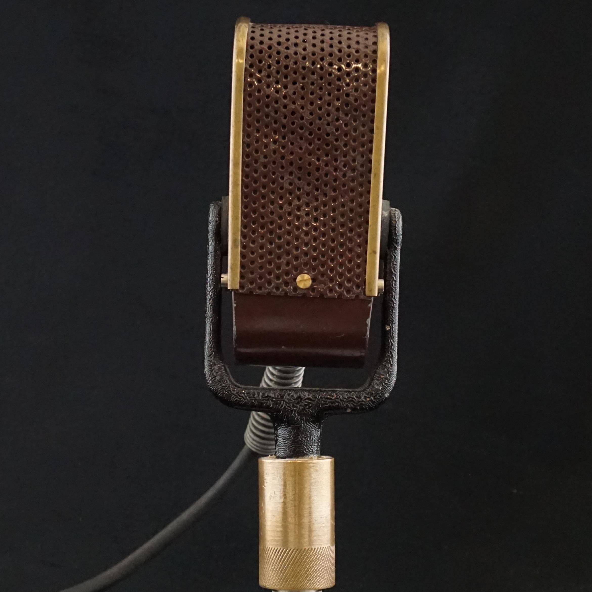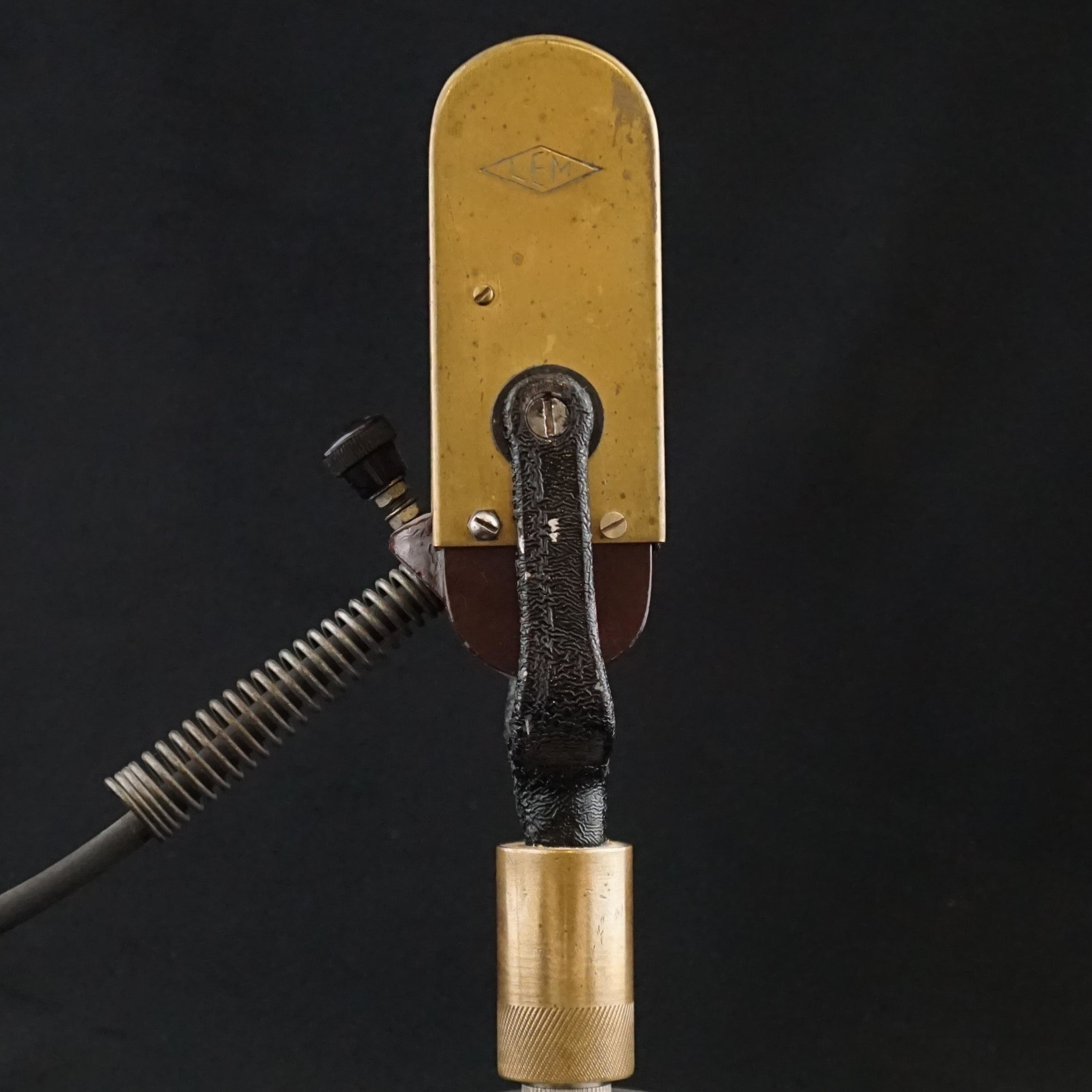 This beautiful and very old French LEM ribbon mic is probably from the late 1930s. Inside, it is very similar to the smaller Amperite ribbon mics, with a large fibreboard frame supporting the ribbon, and a pair of (rather weak) magnets behind.