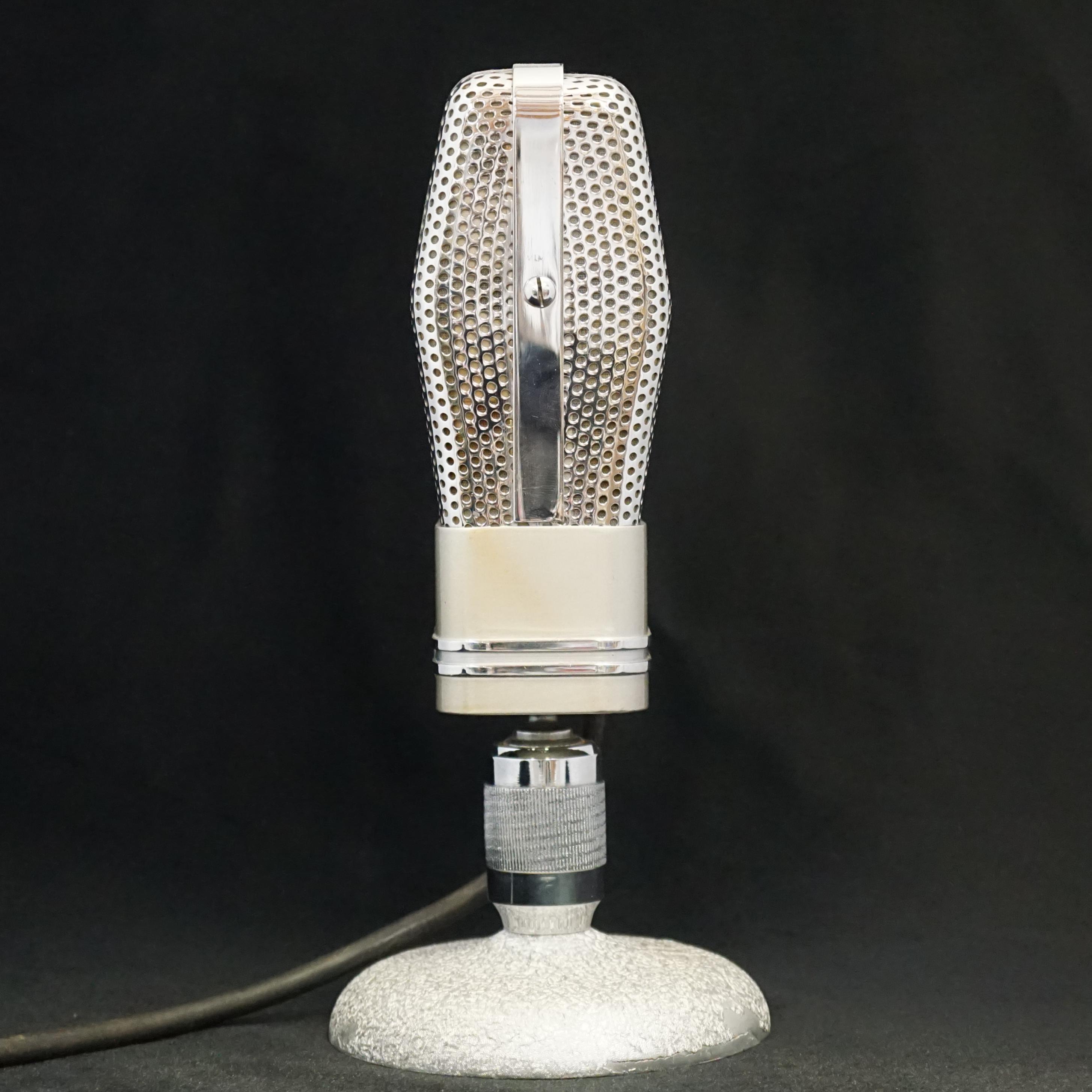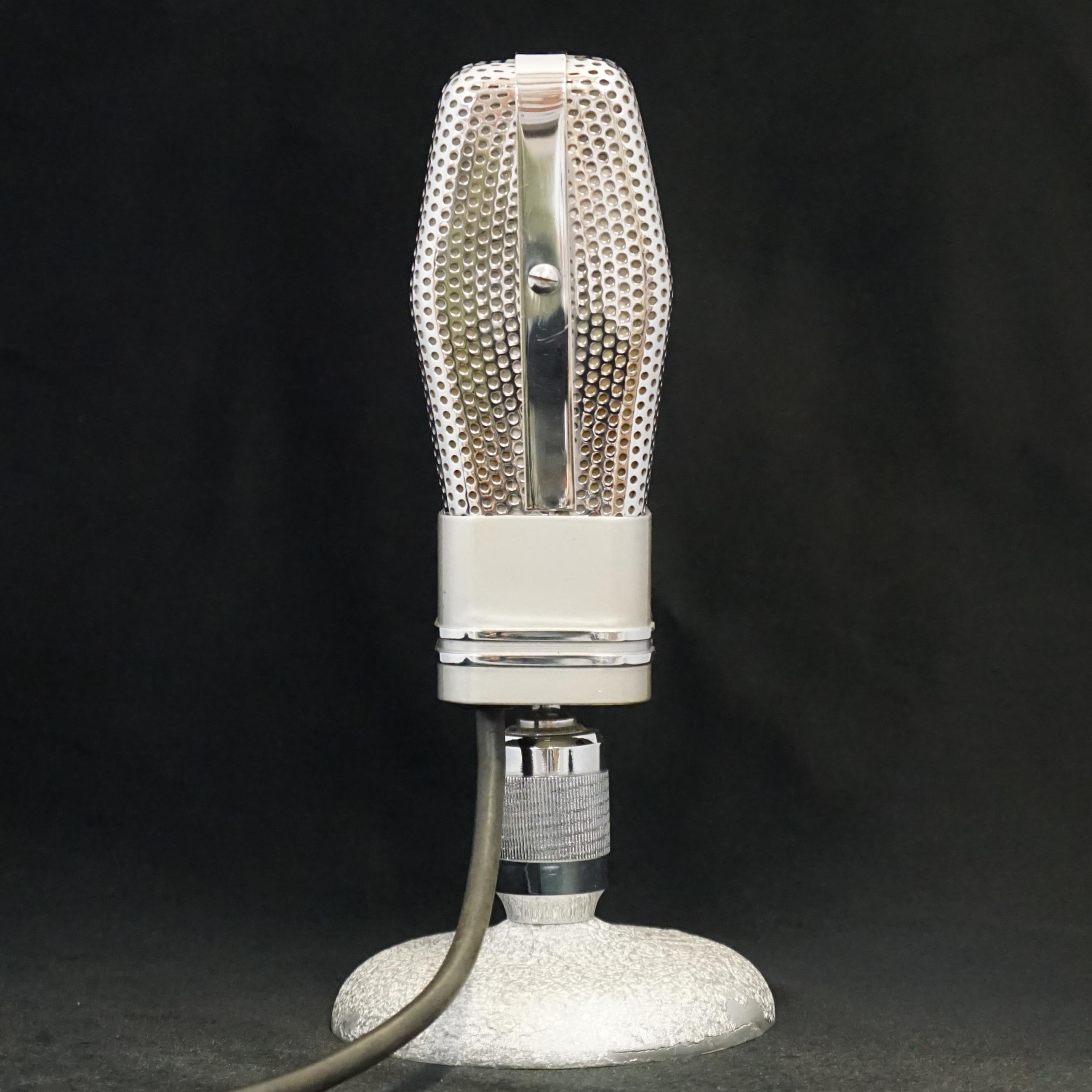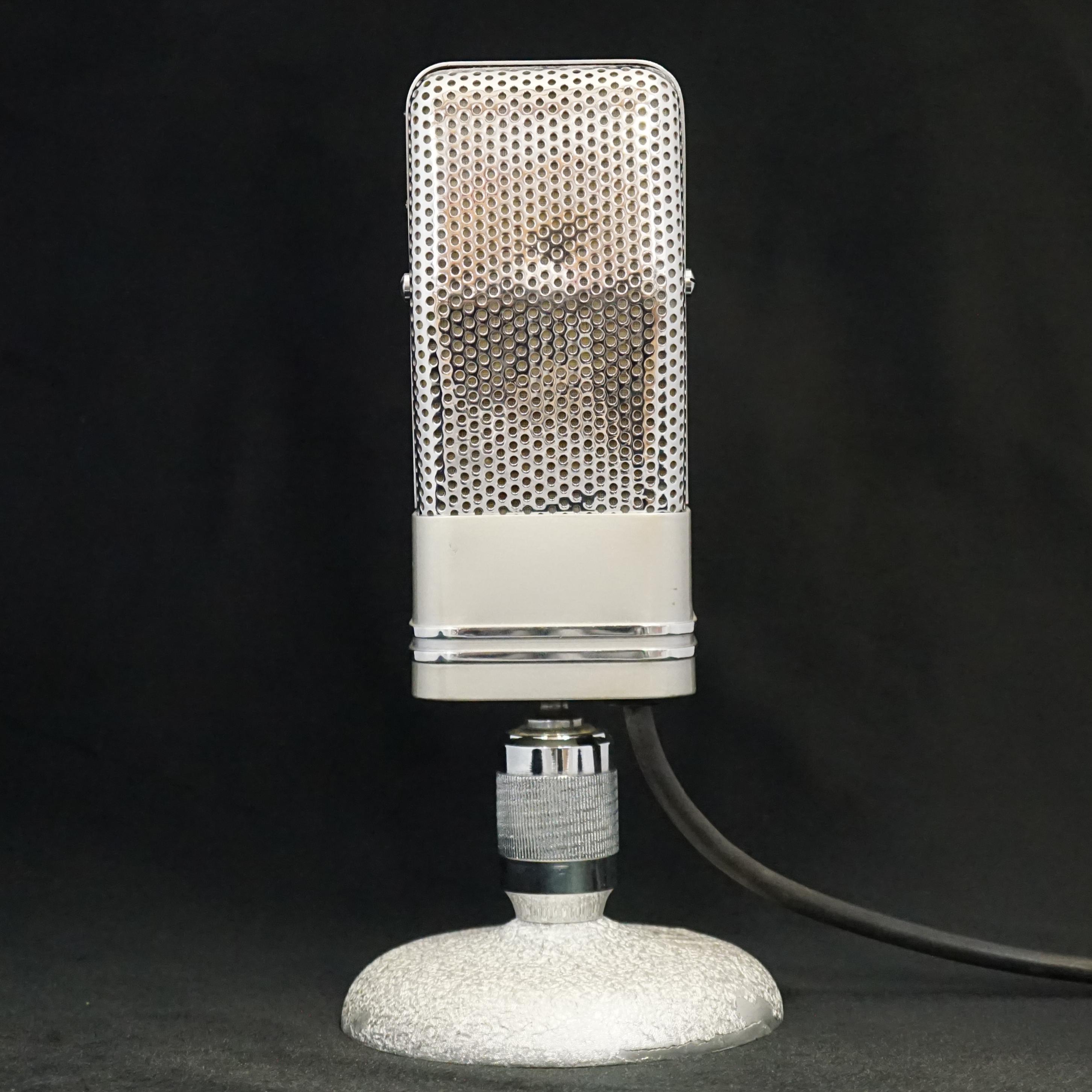 Our LESA microphone is a beautiful example that is clearly inspired by the RCA 74-B and 44 BX microphones. It is about the same size as a 74 with bright chrome grills and bands around the lower body. The swivel mount utilises a ball joint hidden inside the base of the microphone. The output transformer has two taps which can be selected by changing the wiring inside the microphone, to give a choice of either 600 ohm or 60,000 ohm output impedance.