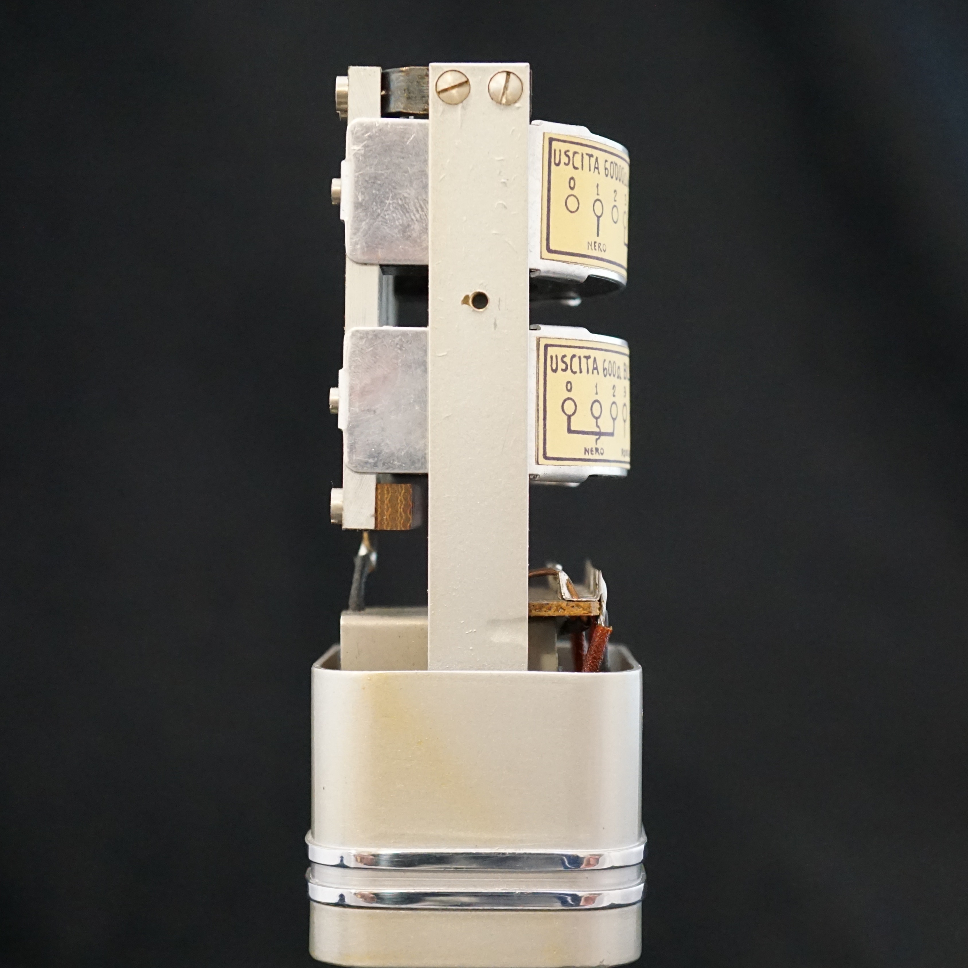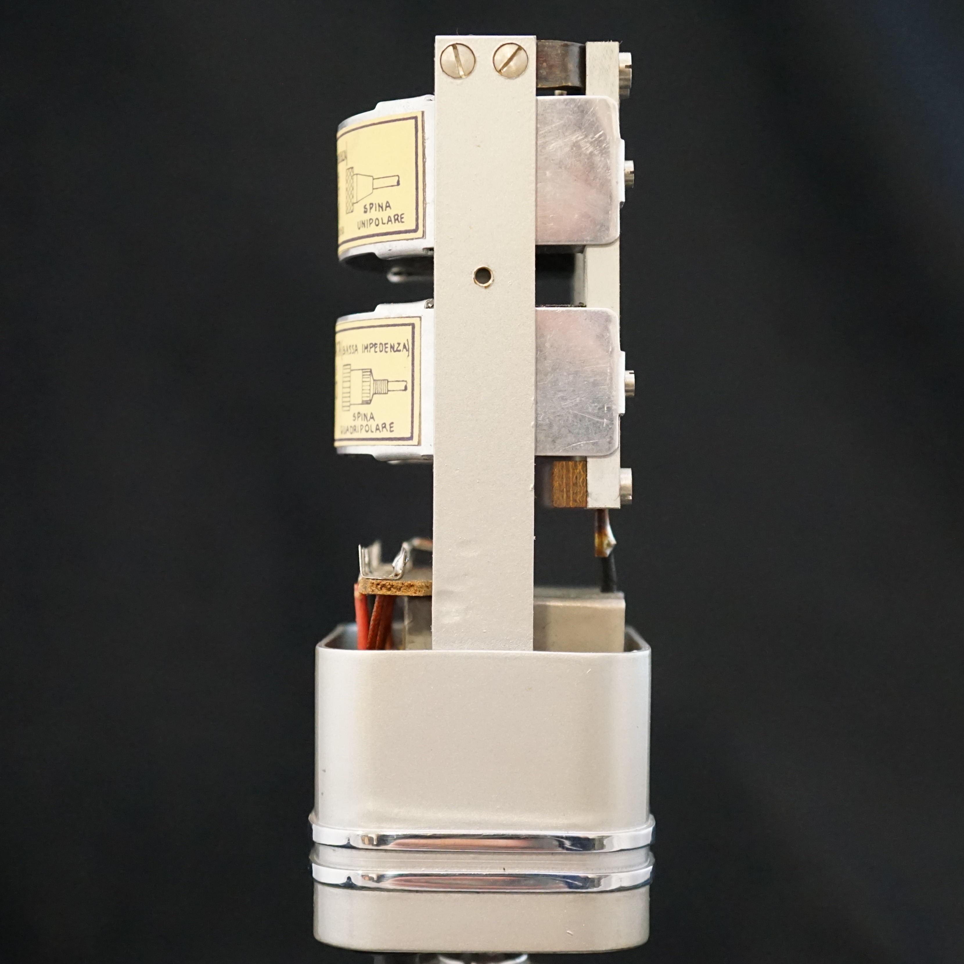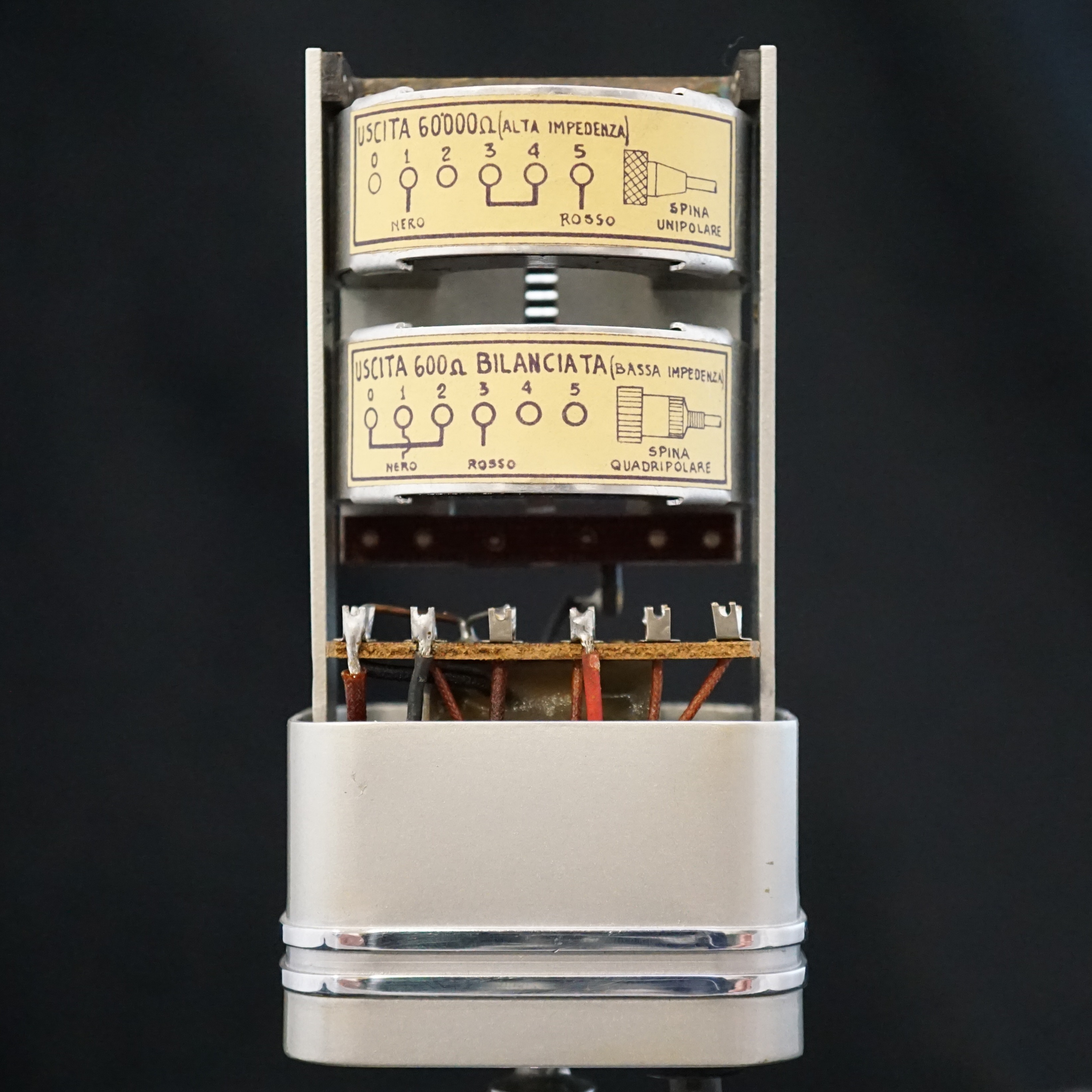 Our LESA microphone is a beautiful example that is clearly inspired by the RCA 74-B and 44 BX microphones. It is about the same size as a 74 with bright chrome grills and bands around the lower body. The swivel mount utilises a ball joint hidden inside the base of the microphone. The output transformer has two taps which can be selected by changing the wiring inside the microphone, to give a choice of either 600 ohm or 60,000 ohm output impedance.