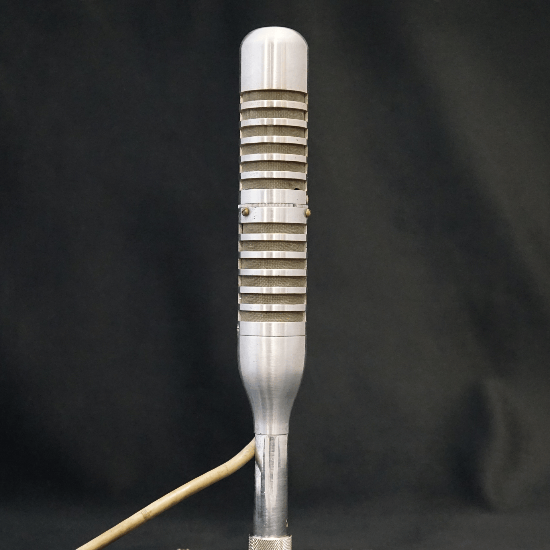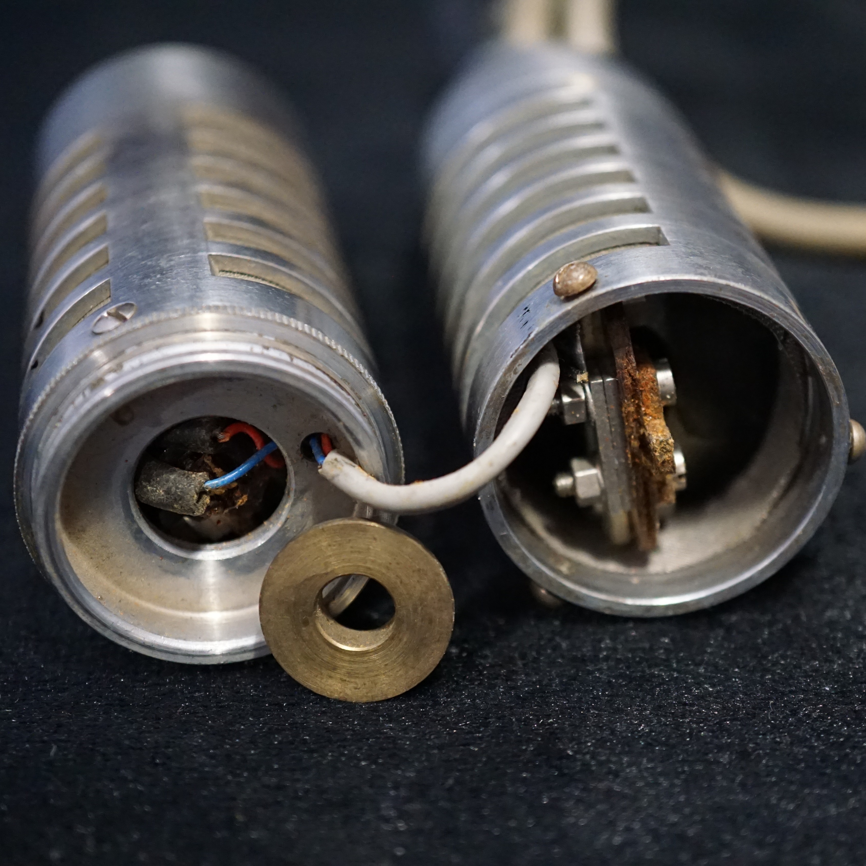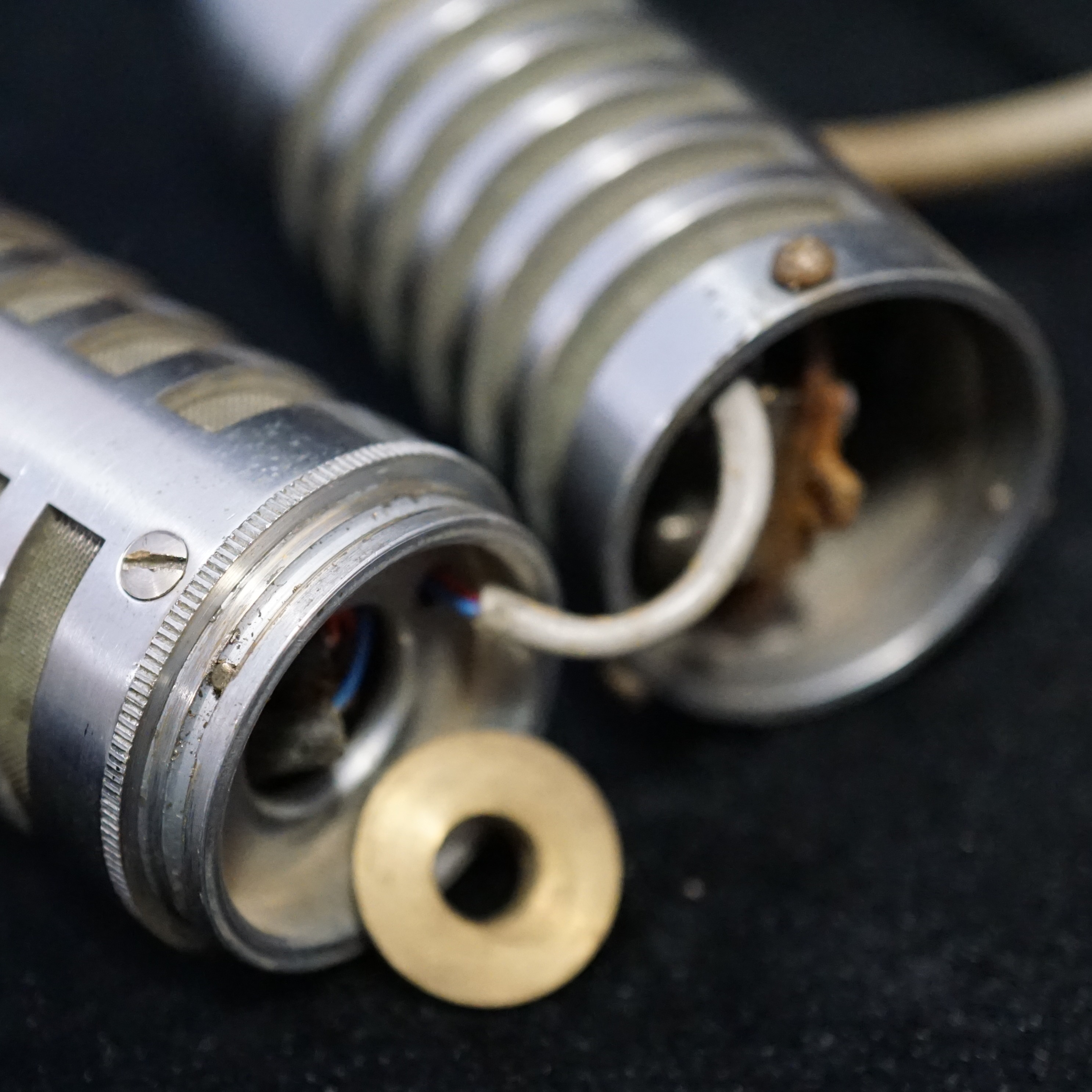 The VR65 stereo ribbon microphone is thought to be the first all-in-one stereo ribbon microphone in production, pre-dating B&O's SM5 by about three years. The ribbon, motor assembly and transformers in the VR65 are the same as those found in the mono VR64 and the two halves of the microphone are joined together with a simple but effective grooved brass ring. Three small screws push through the upper body into the groove, allowing the top half of the microphone to rotate.