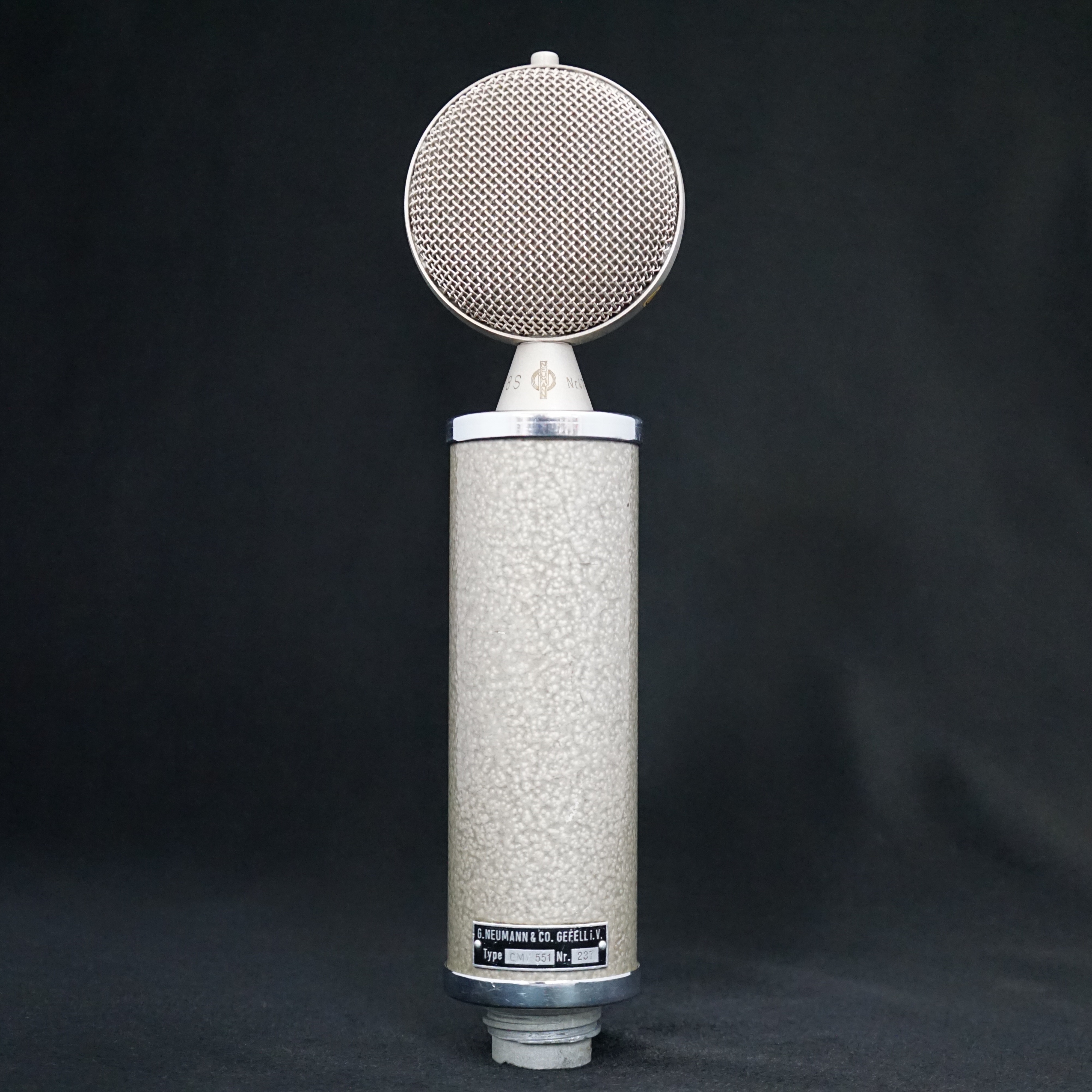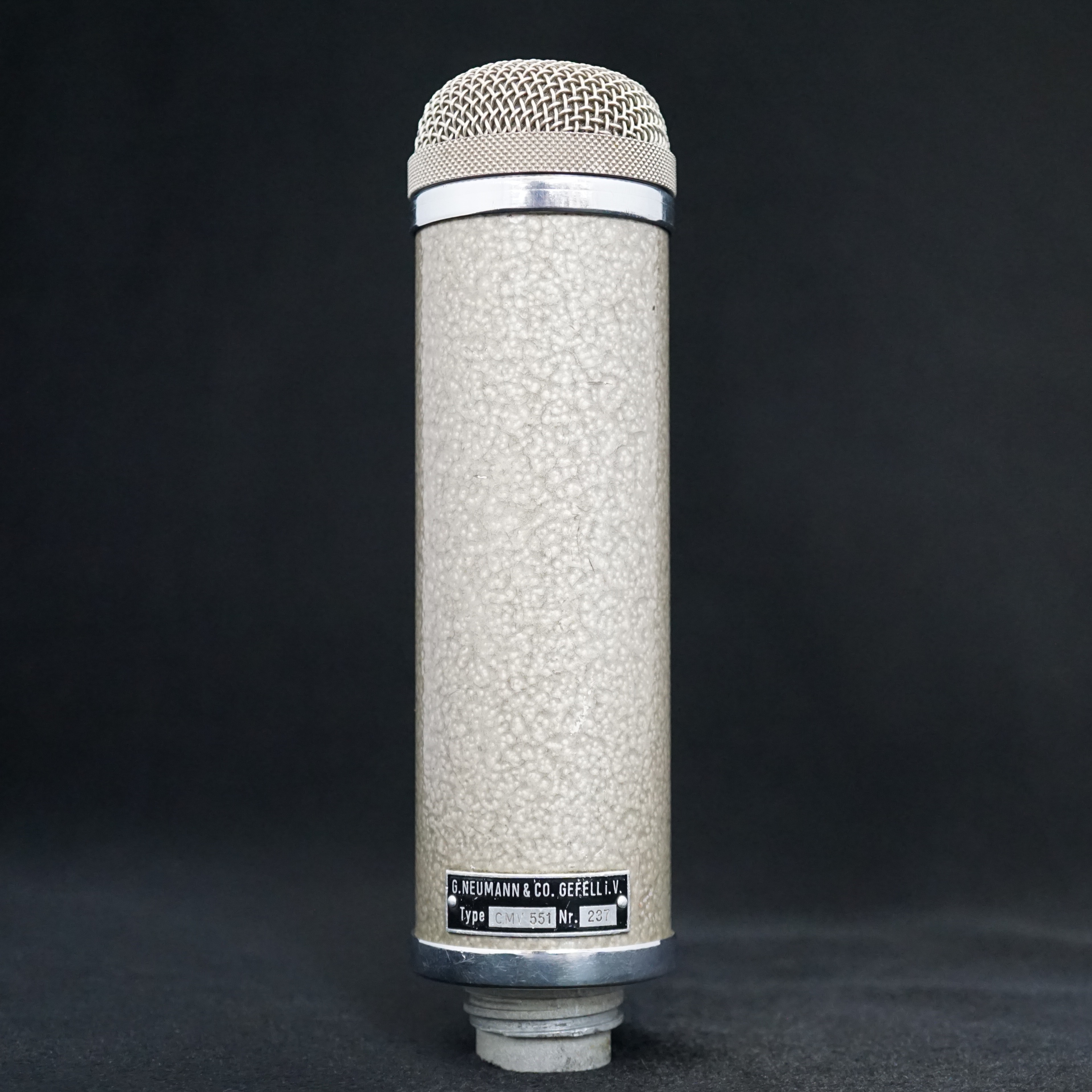 The CMV 551 was the first new microphone to be designed and built at the Neumann & Co. Gefell. factory in East Germany after WW2. This new model used an EC92 triode tube which allowed the body of the microphone to be much smaller and lighter than the large and imposing CMV3.