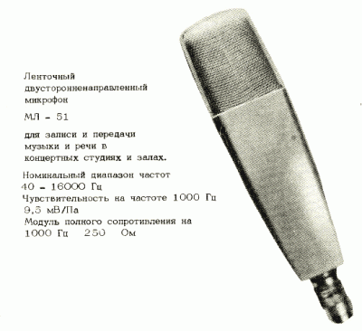 ML-51 bidirectional ribbon microphone for recording and broadcasting music and speech in concert studios and halls.