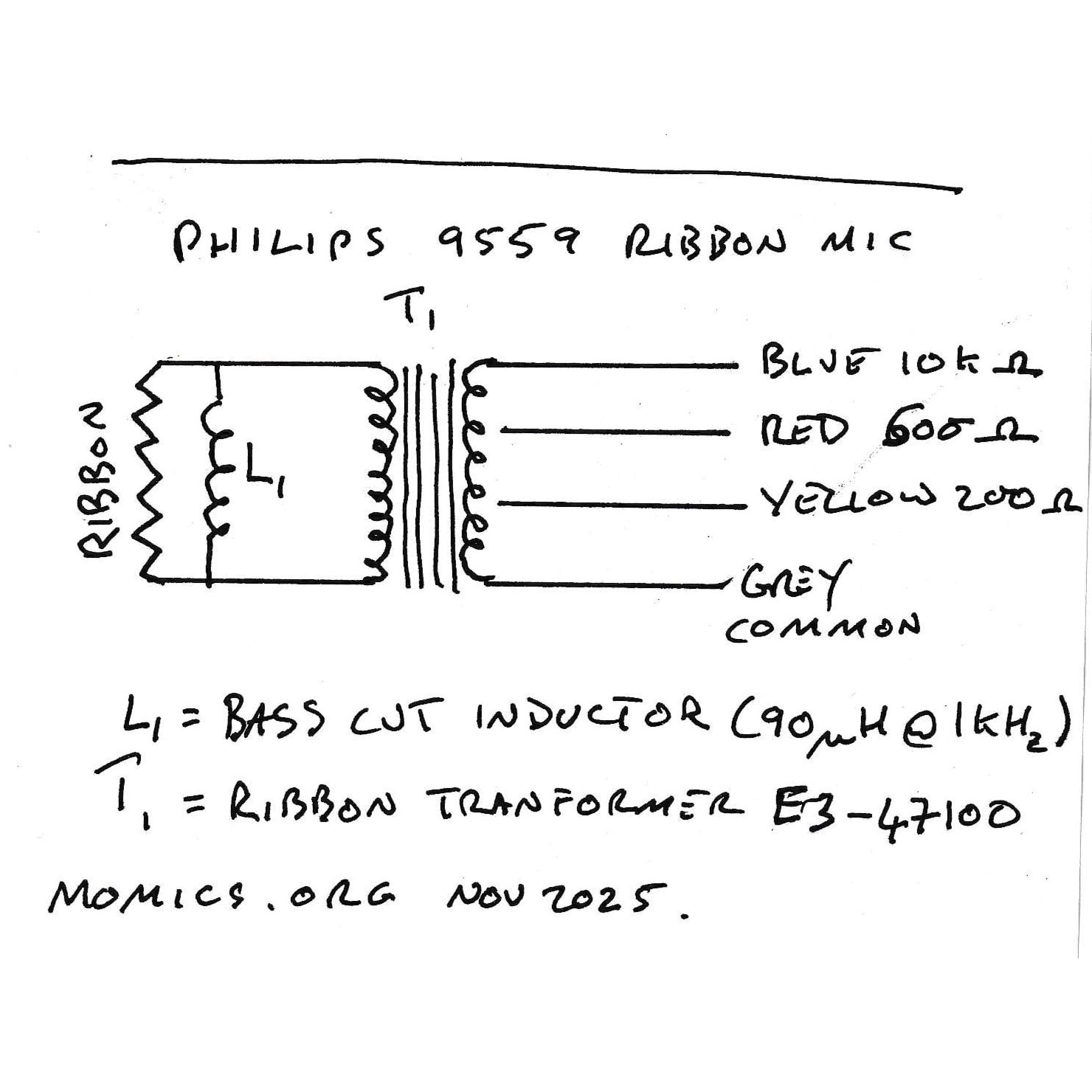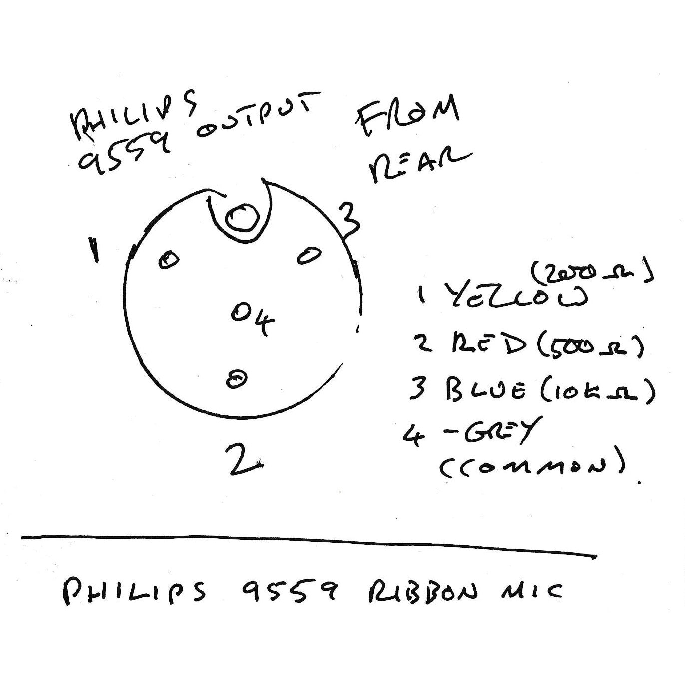 Philips model 9559 has a long wide ribbon. Three different output impedances may be selected simply by rotating the custom 4-pin plug to the correct position. These outputs are 200, 500 and 10,000 ohms respectively.
