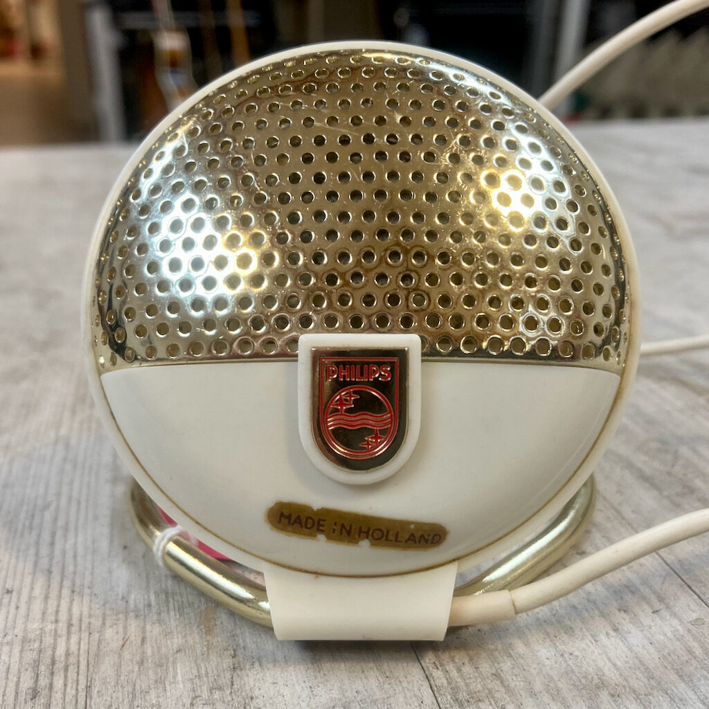 These stylish but small plastic bodied dynamic microphones were made in large quantities for home tape recording. They have a metal grill, fixed cable and an integrated fold-down loop of metal that acts as a desk stand. The construction is very elegant and well thought out - the two halves of the microphone body are held together with a single screw.