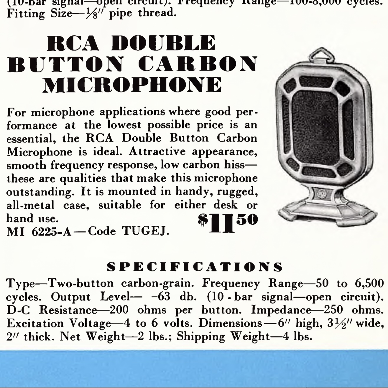 This carbon microphone appears in the RCA catalogue in 1936 but not in 1939.