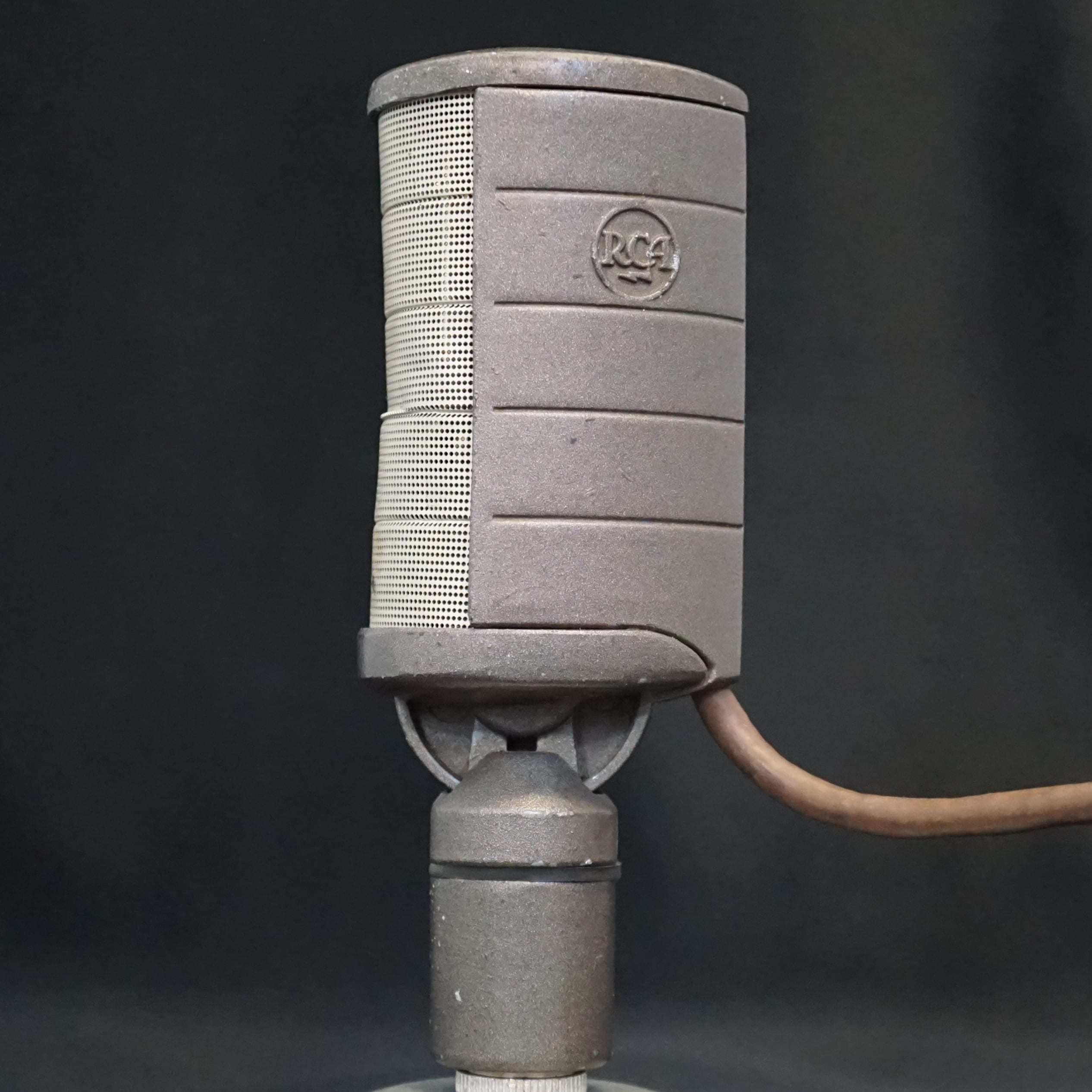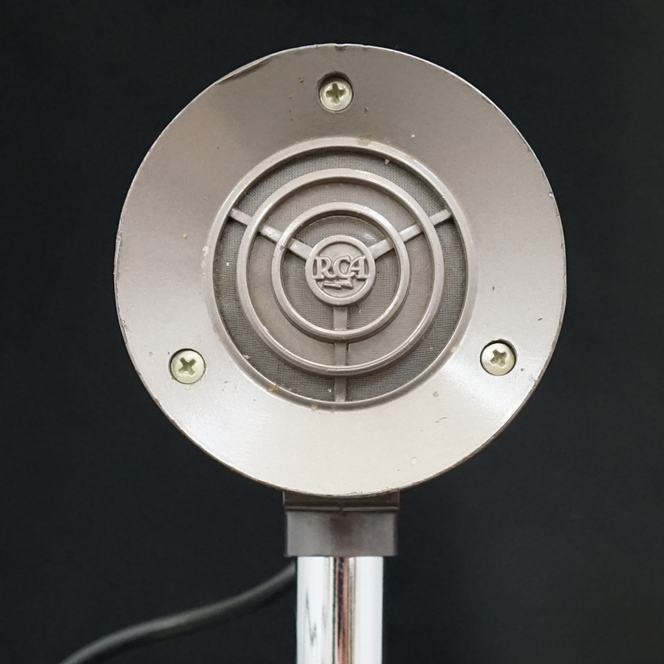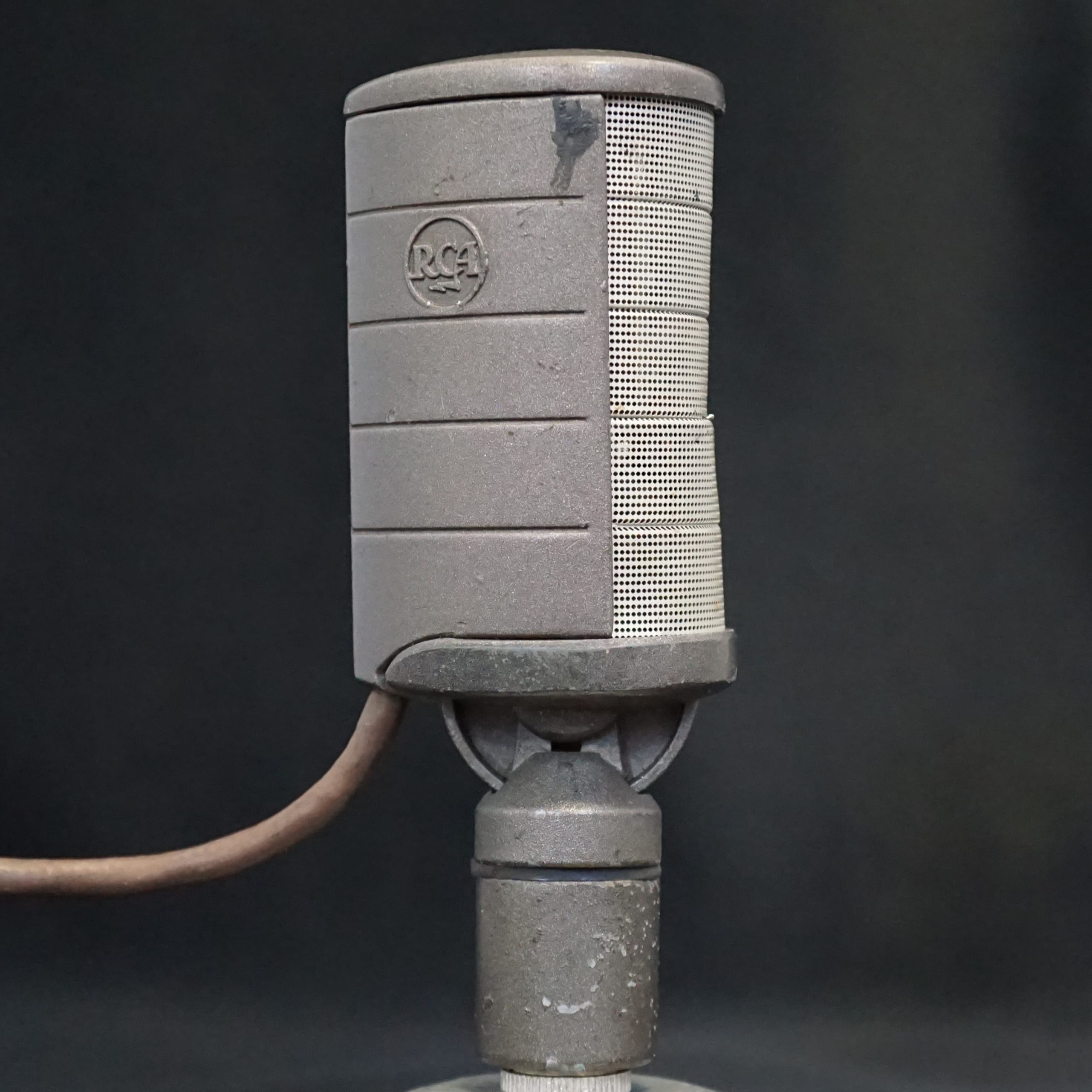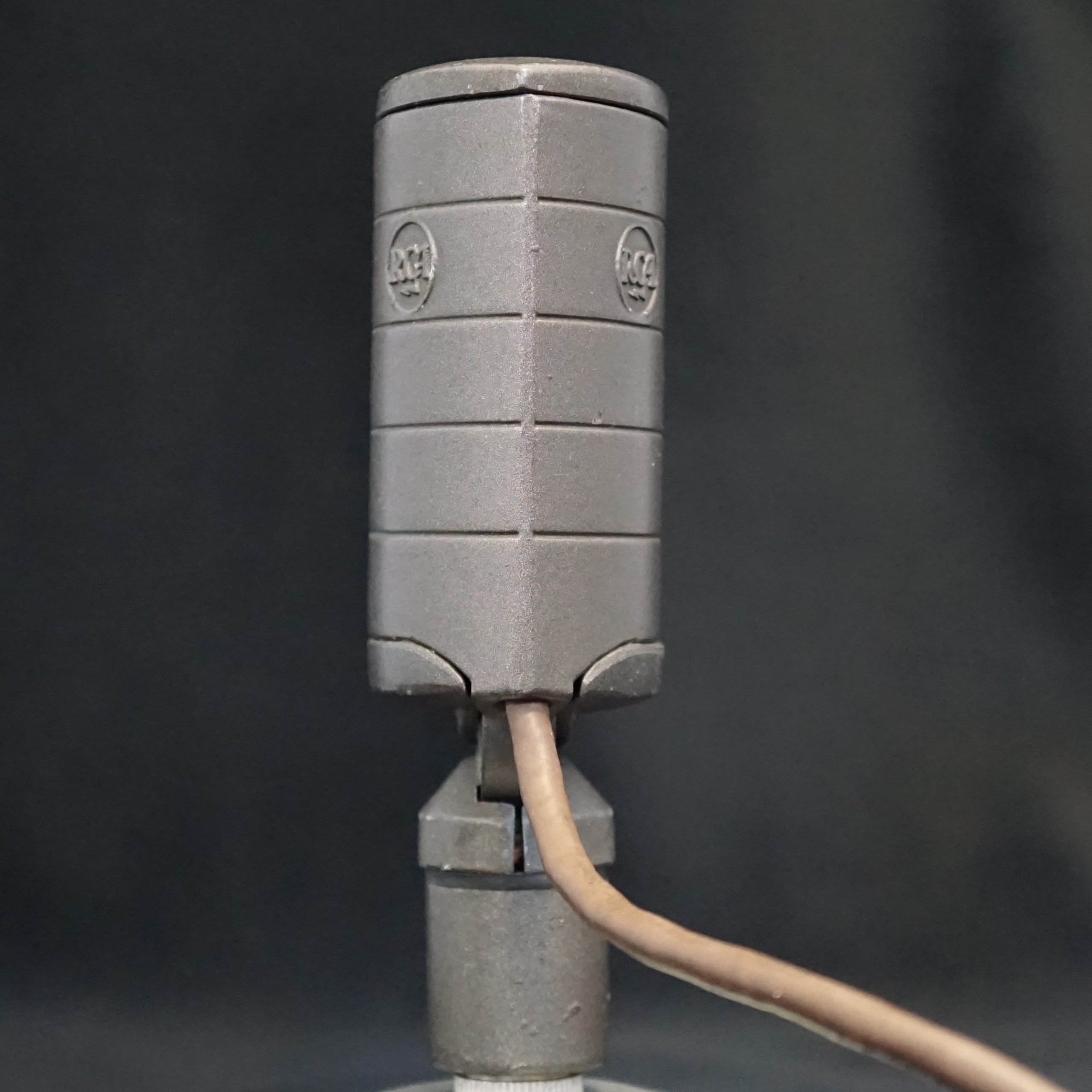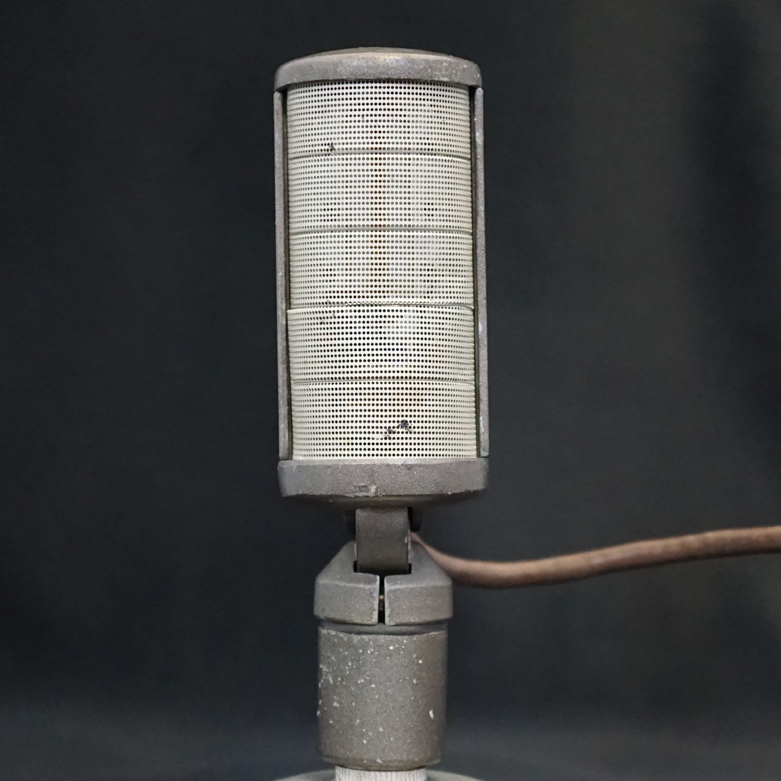 MIC NOTES: Designed to be visually less obtrusive than some of its contemporaries, RCA's SK-45B microphone was physically smaller and had simpler lines than mics such as the Type 77 or Type 44. It was intended essentially for talkback, cue, and public address purposes, where clean sight lines were becoming more of an issue with television broadcasts. Its sibling - the SK-45 - had a somewhat more limited frequency response of 80 to 8,000 Hz. The SK-45B's appearance is very similar to RCA's KN-1A and KN-1B microphones. The KN-models featured an integral desk stand with a compartment in the shank of the stand to hide the connecting cable's XLR connector, whereas the SK-45B could be mounted on any floor or desk stand with a standard 5/8-inch, 27-threaded fixture. The SK-45B was also identified by RCA as the MI-12045-B.