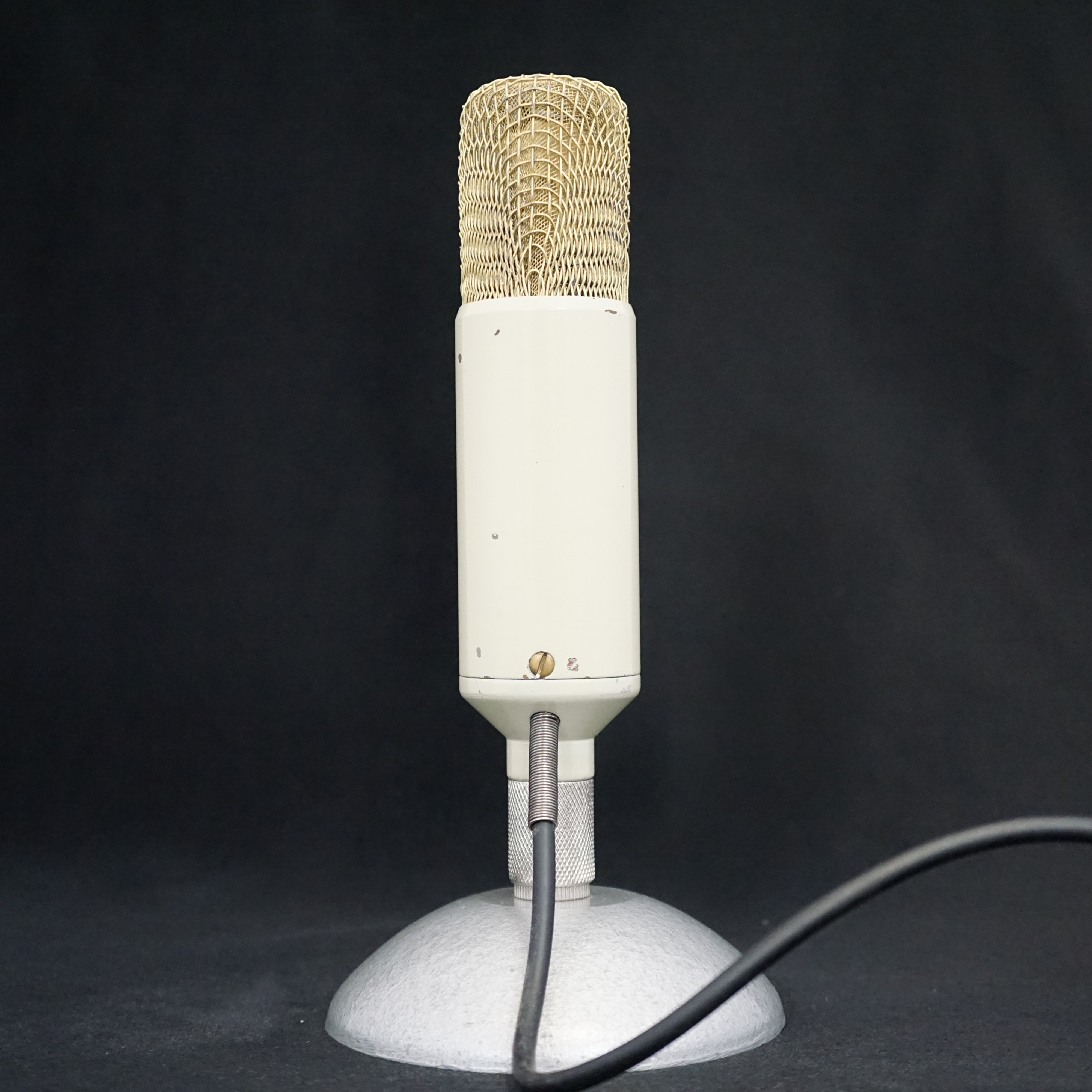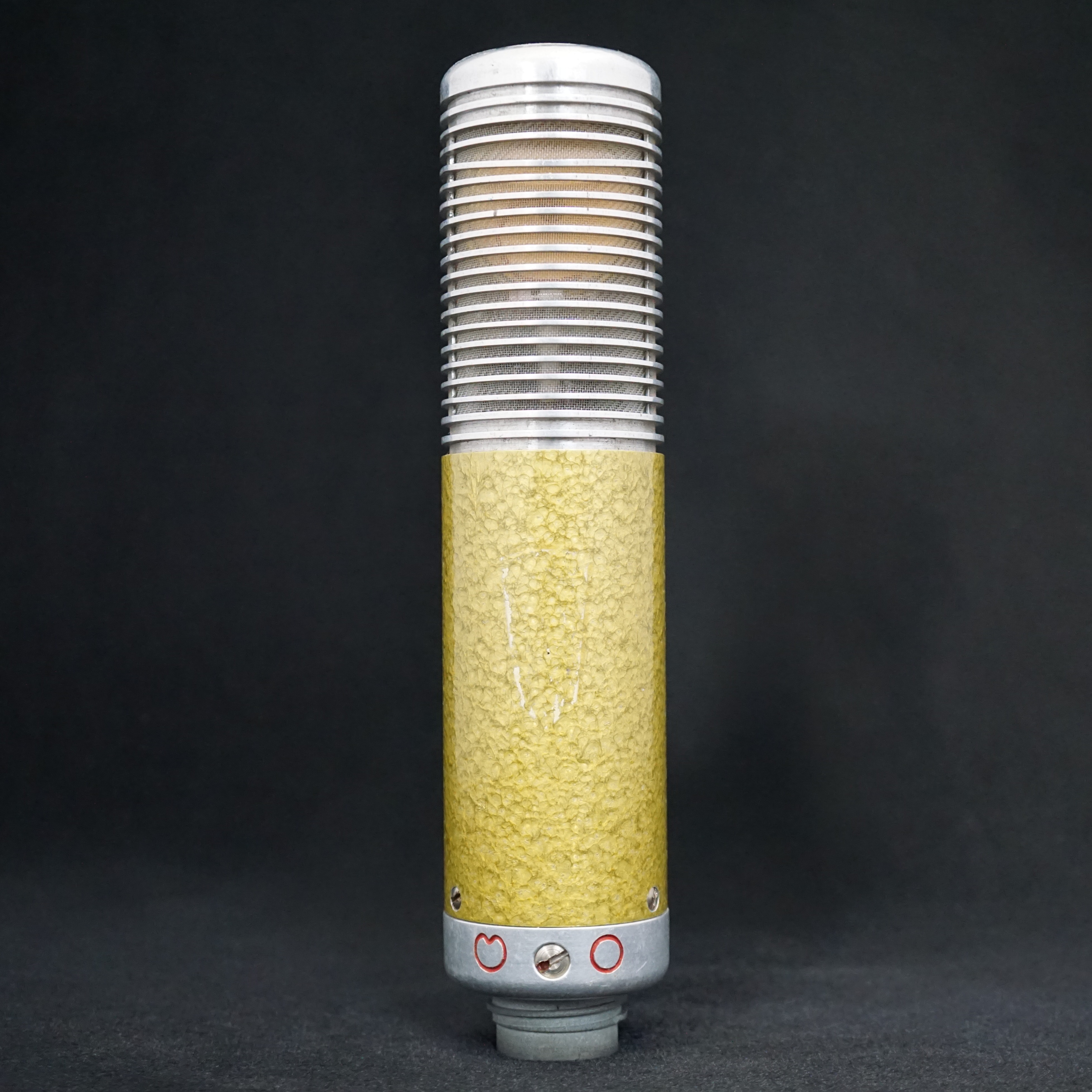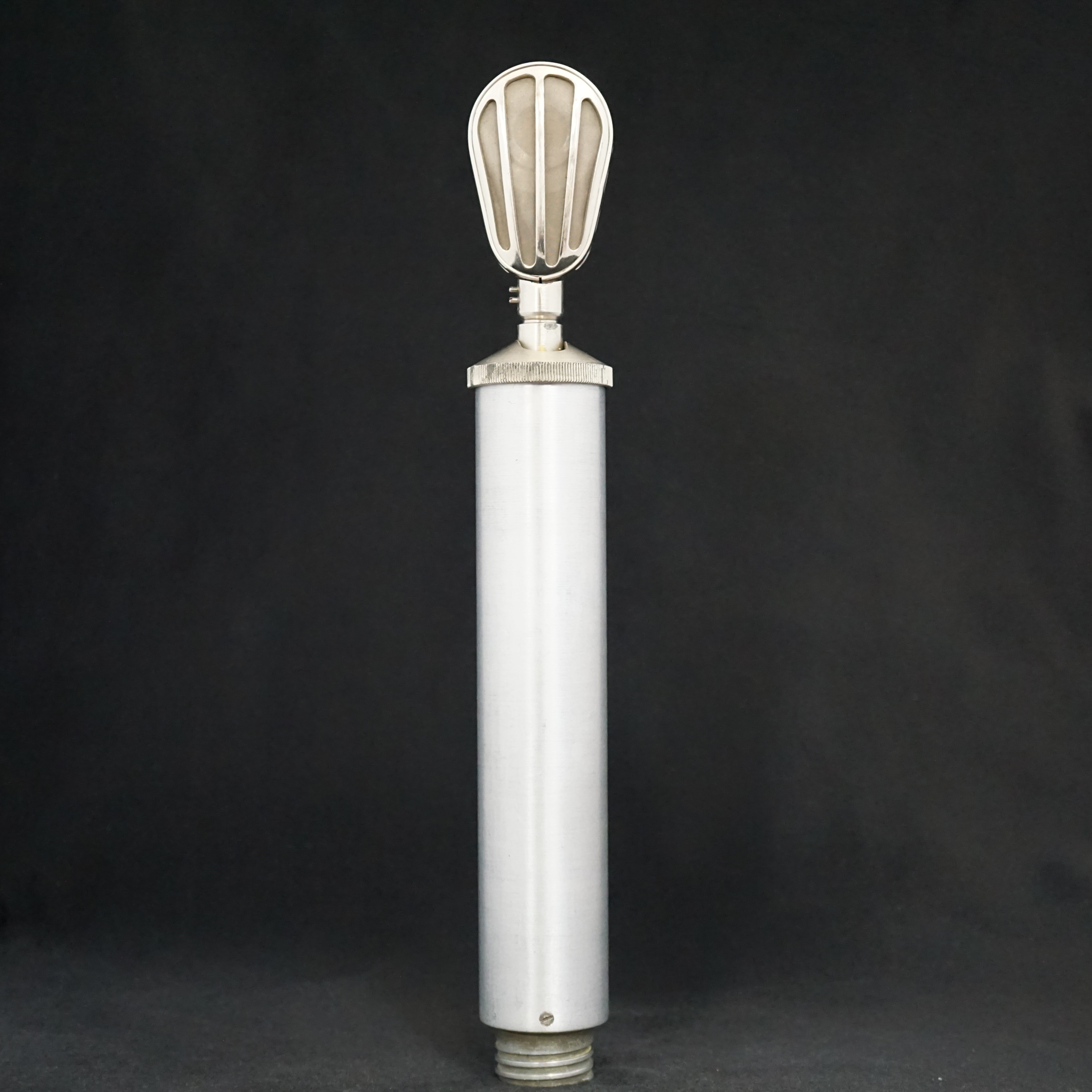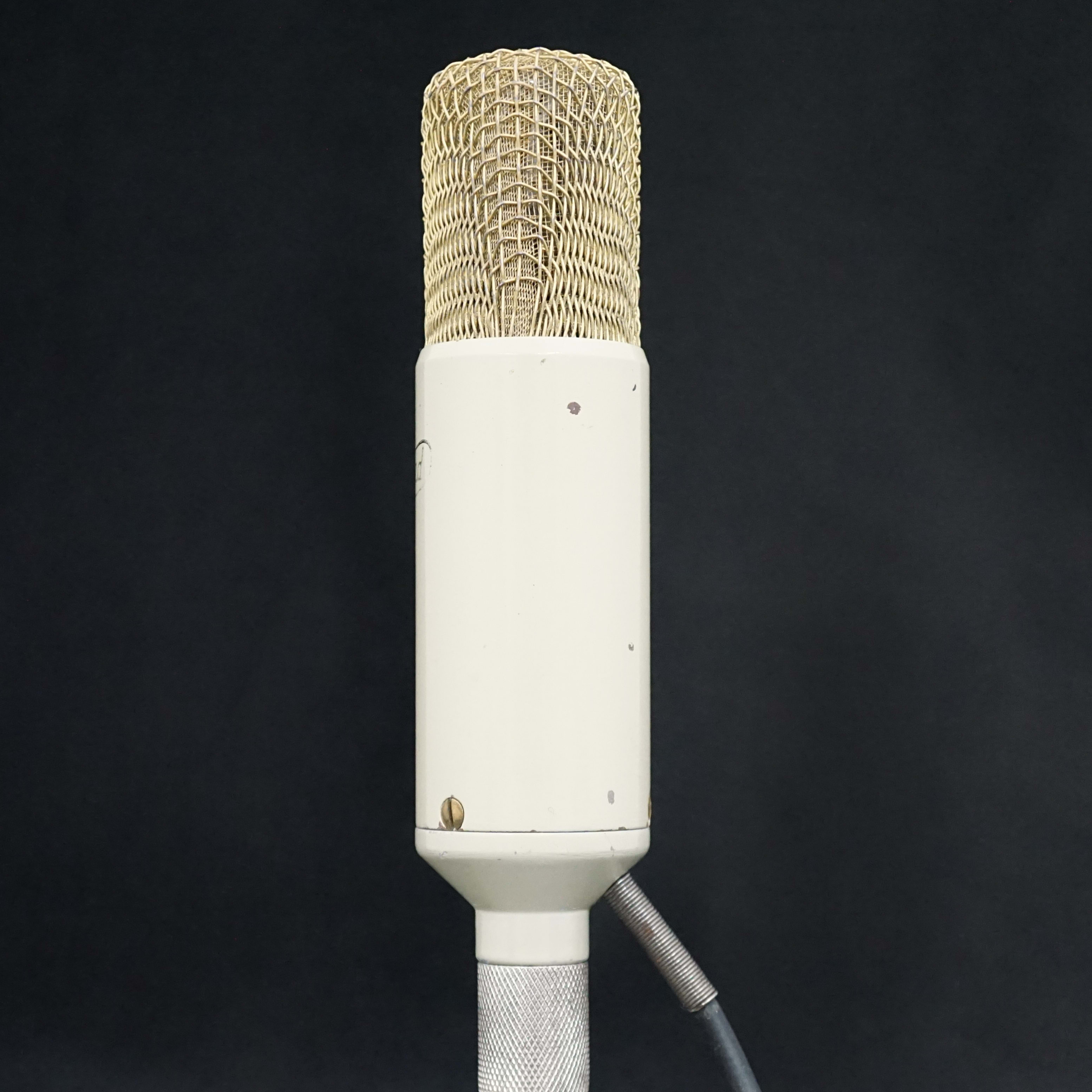 We have not been able to identify the origin of this microphone. However, its capsule shows design similarities to early German tube condenser microphones from the 1950s, such as the Thiele models. It was acquired from a French seller in 2008.