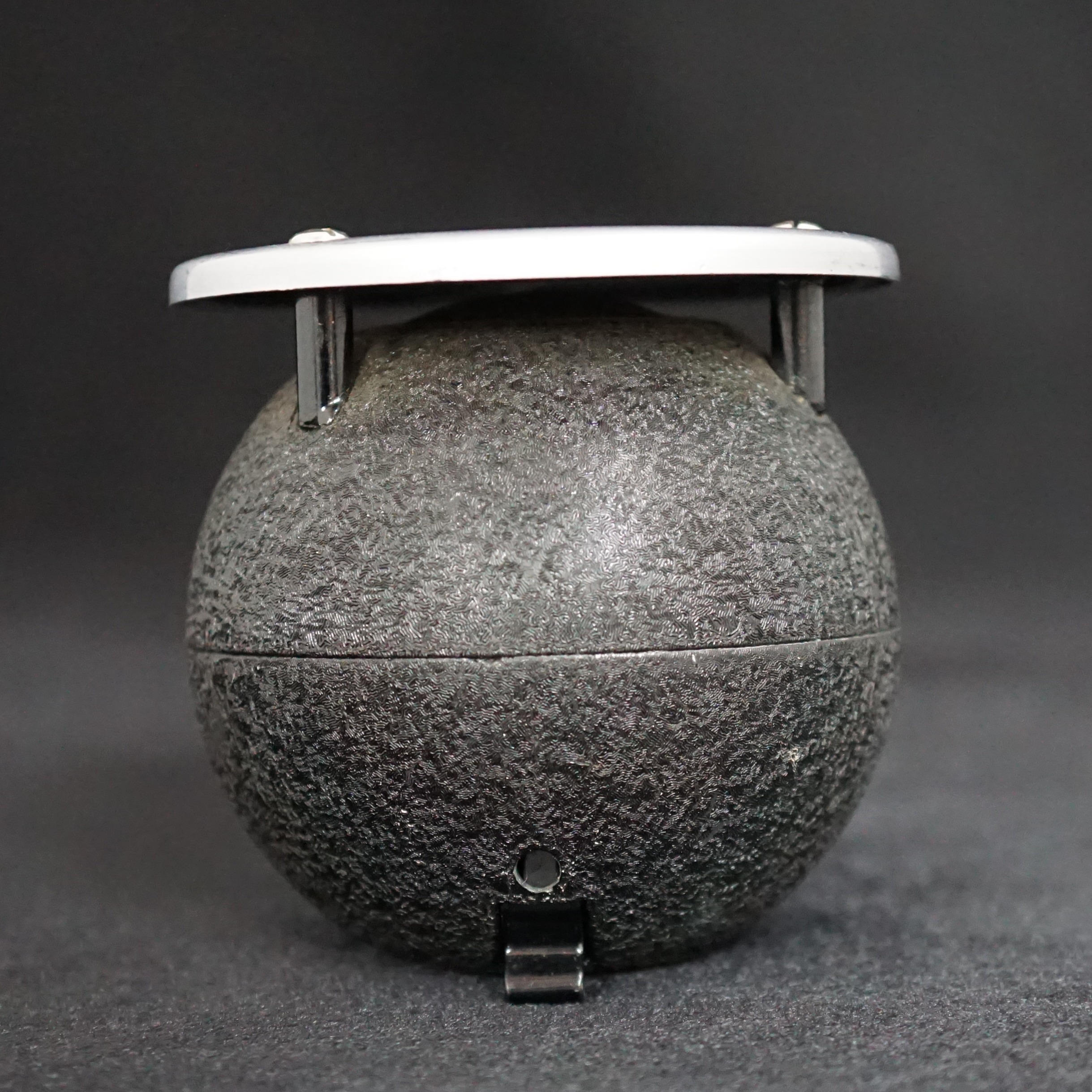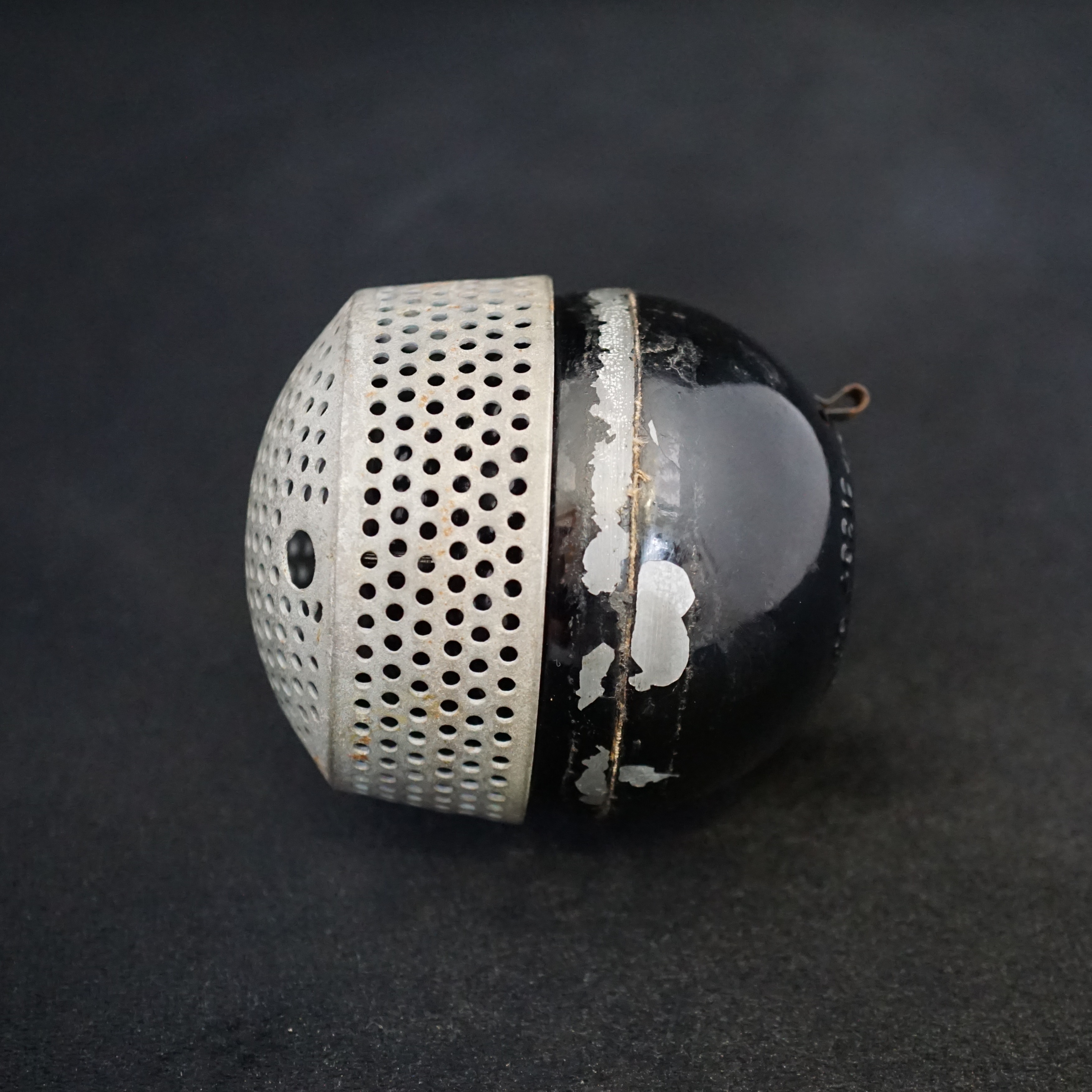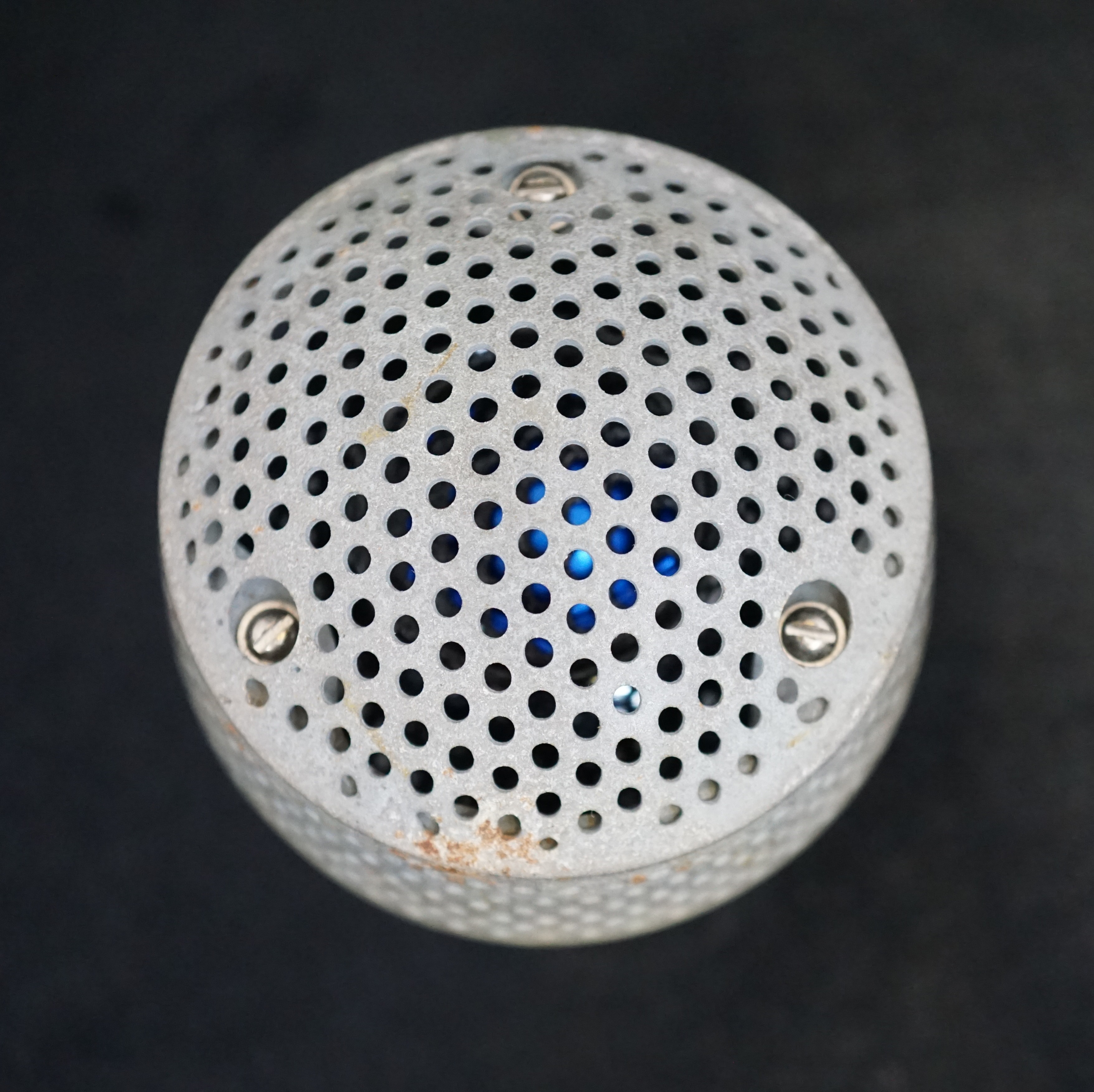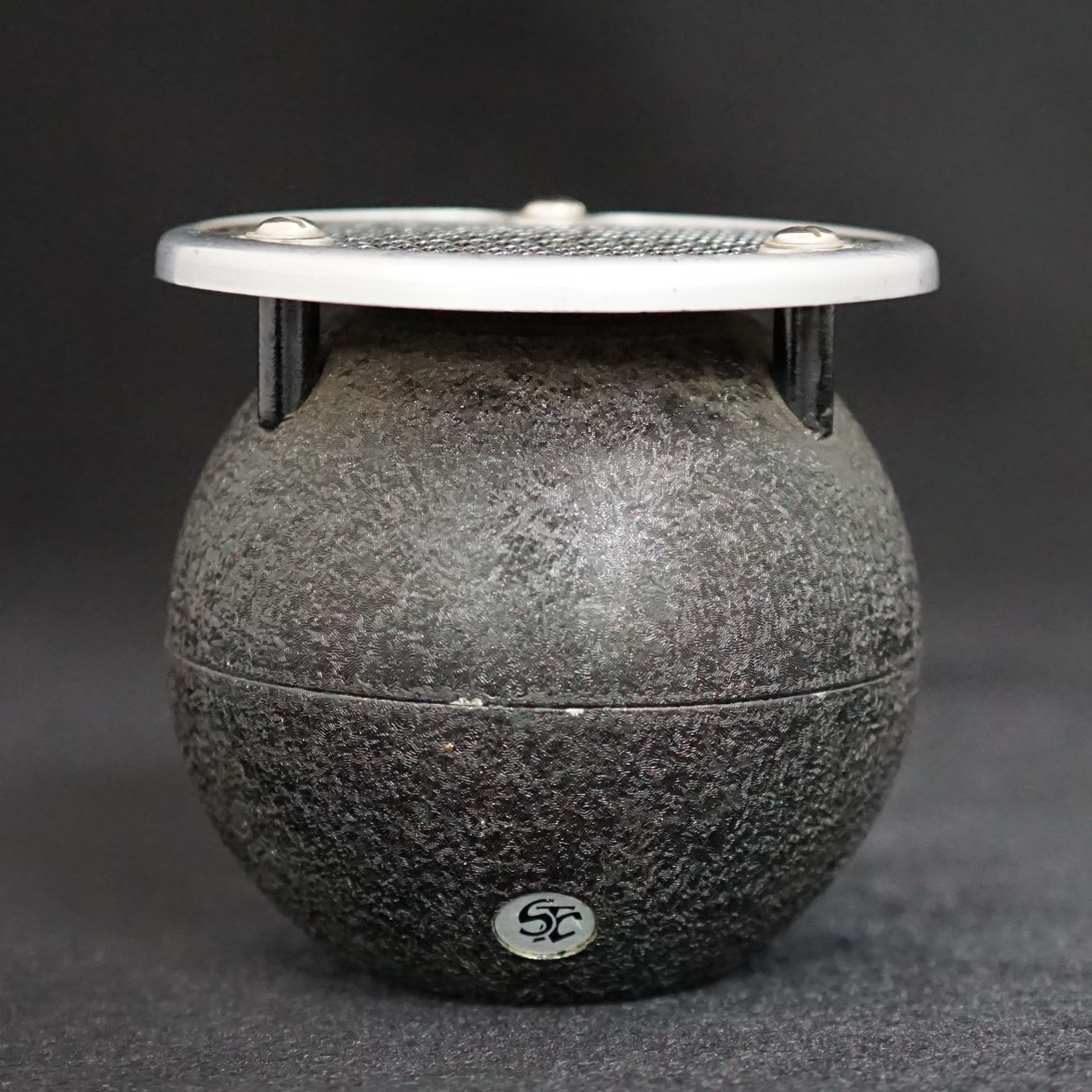 The STC 4021 was introduced by the Standard Telephone Company in 1935. The most famous version has a flat circular screen in front of the diaphragm, which gives it a very uniform omnidirectional pickup pattern, suitable for recording groups of speakers or musicians. The spherical body and circular screen gave rise to the name 'ball and biscuit' or 'apple and biscuit'.