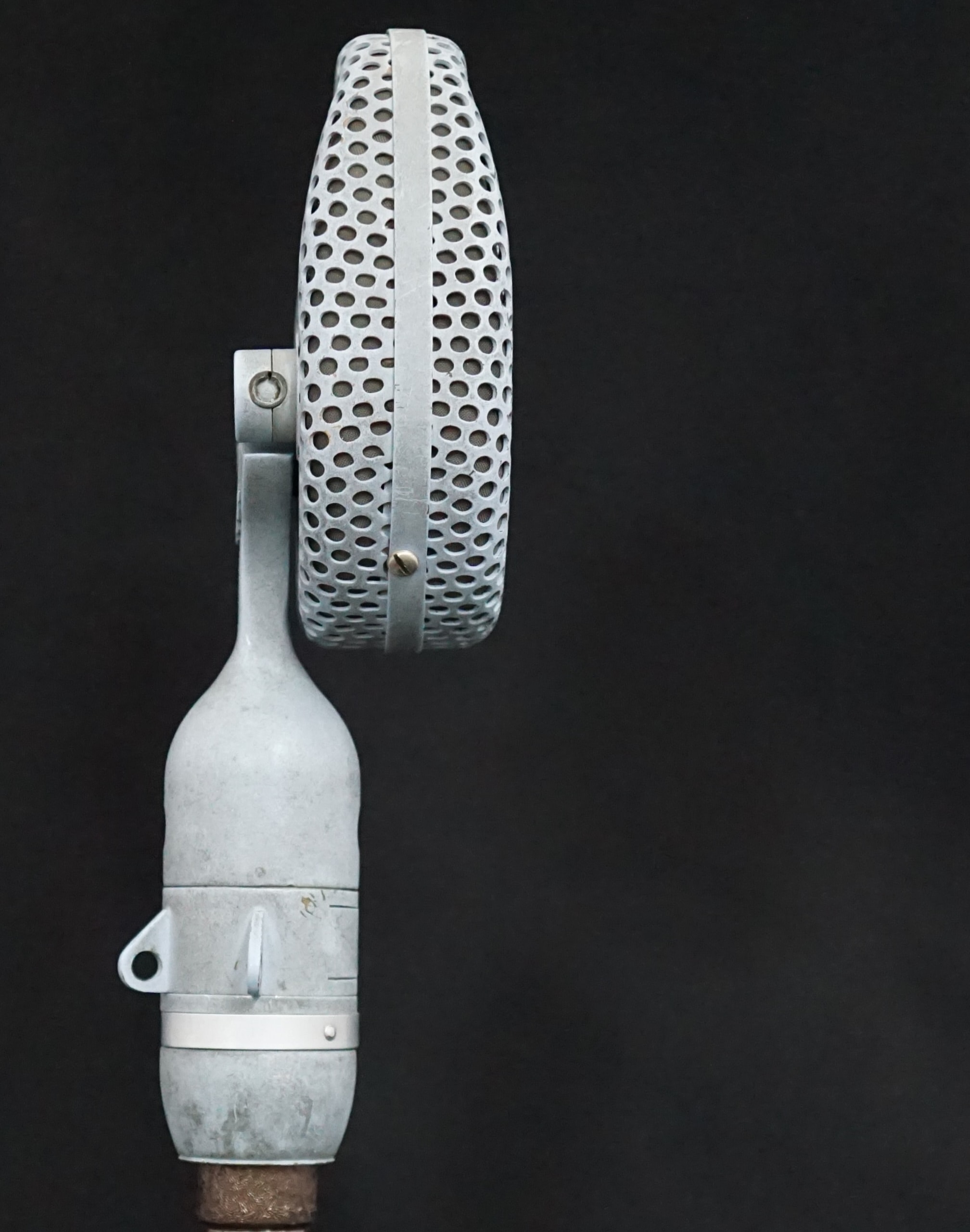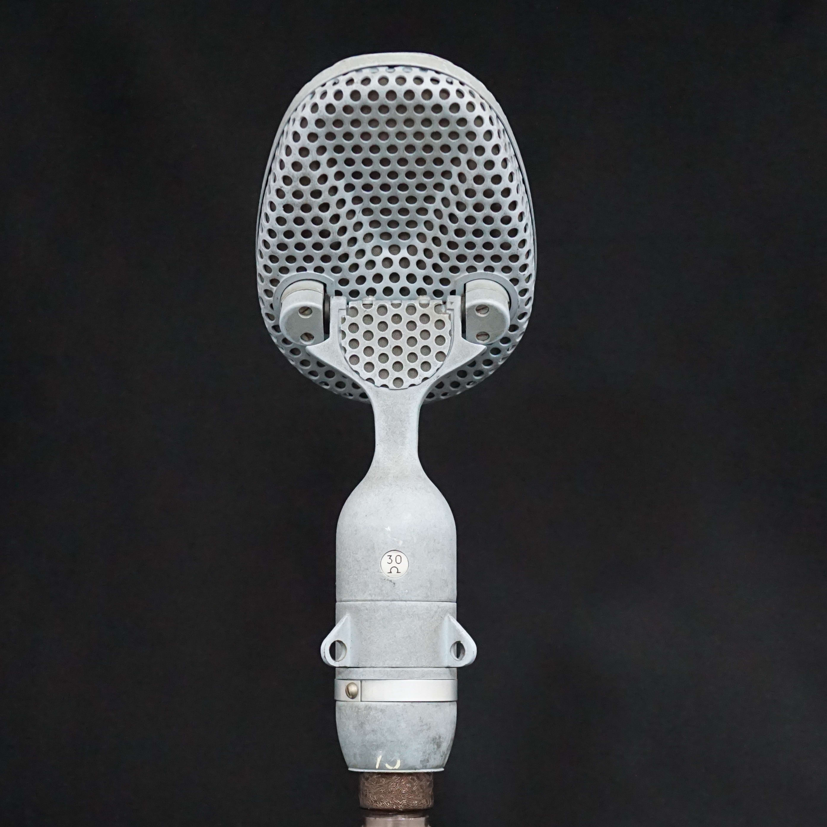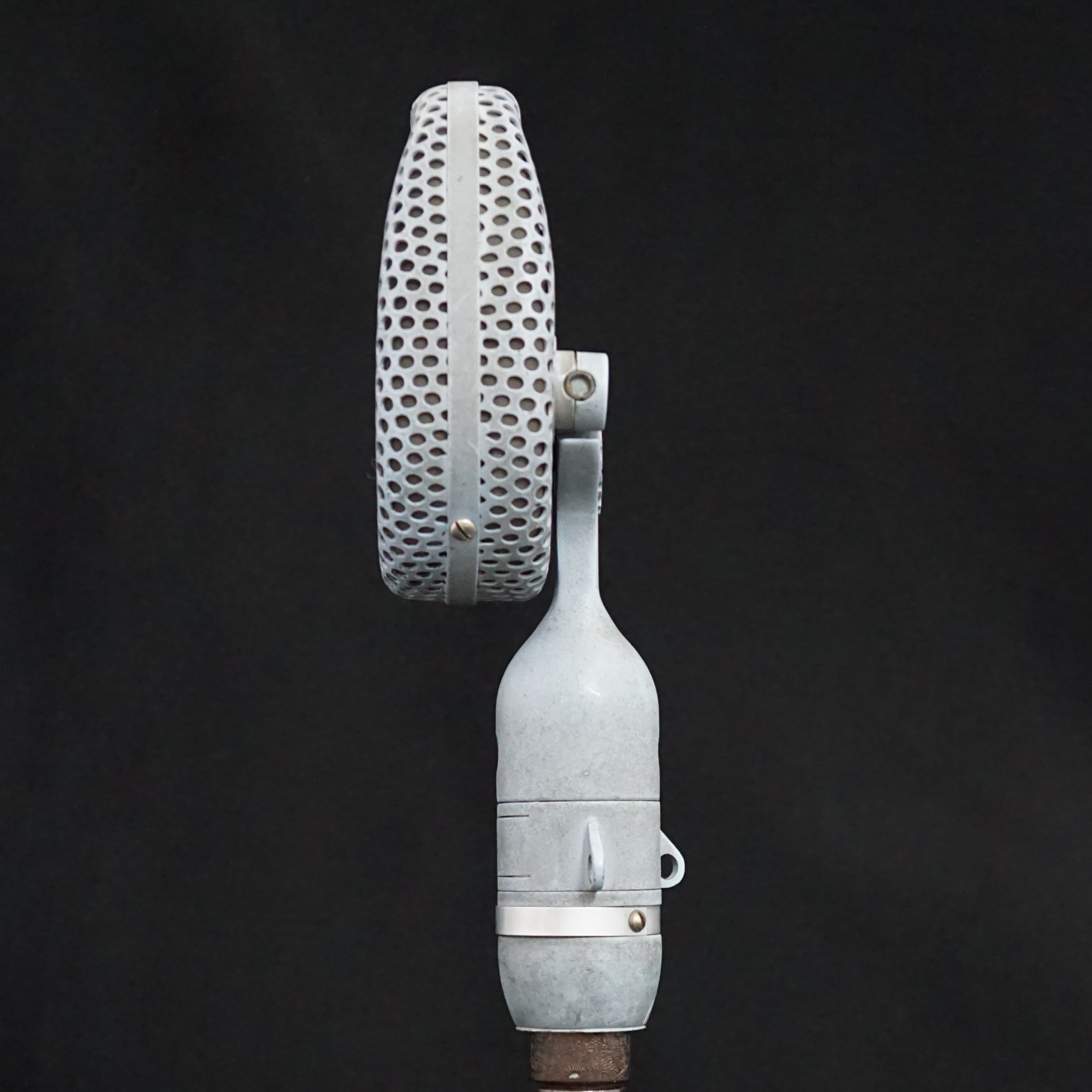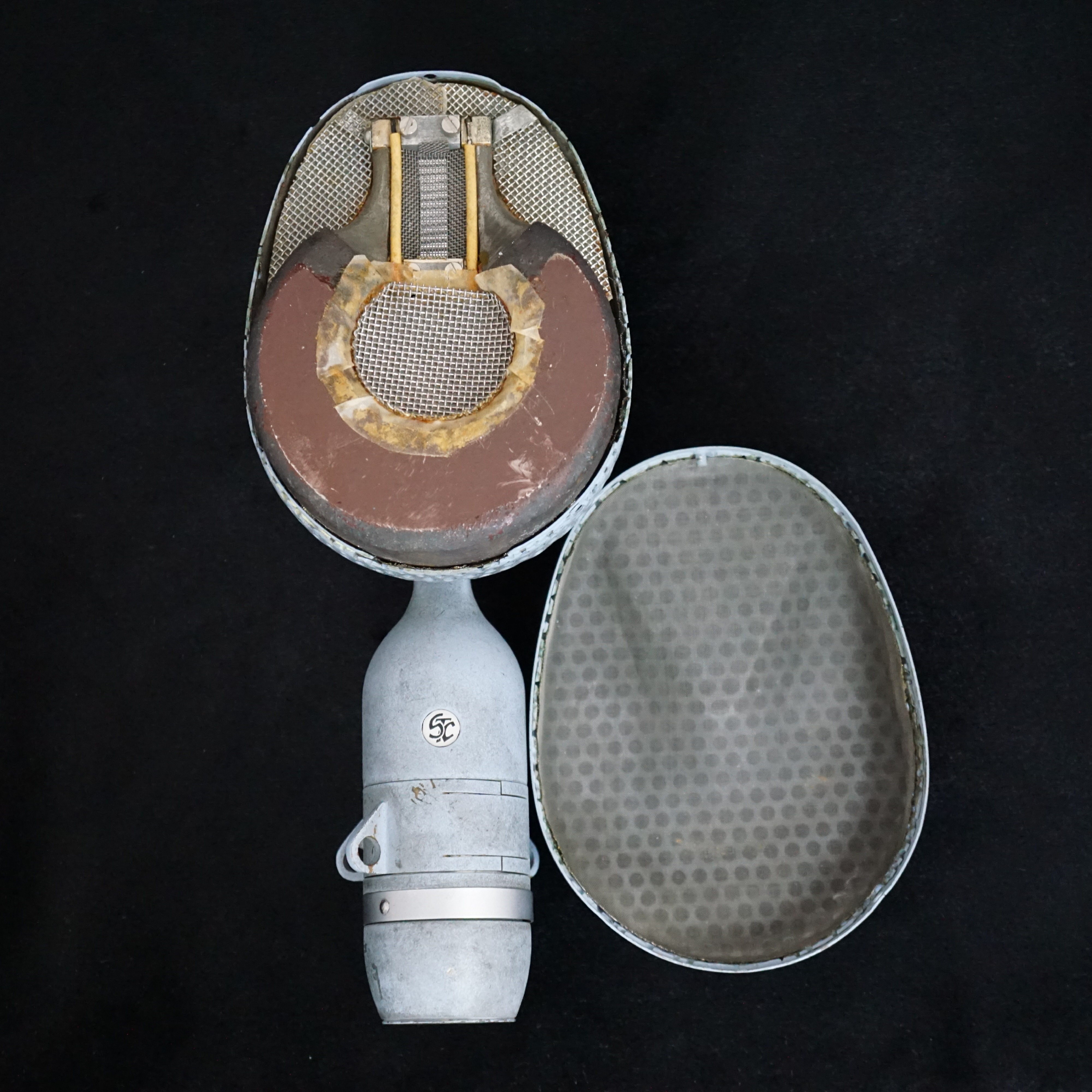 Most of the early STC branded 4038s were either finished in a bronze plating, or a textured black paint. However, ours is pale blue and appears to have been so since it was made - there is no sign of overspray inside the microphone, the paint goes down to the base metal, and it was painted before the inner grills were fitted. We have had two plausible theories, one being that it was a Naval edition, or, more likely, it was for a film or TV set where it needed to be positioned, unseen, against a pale background. Perhaps we will never know the whole story.