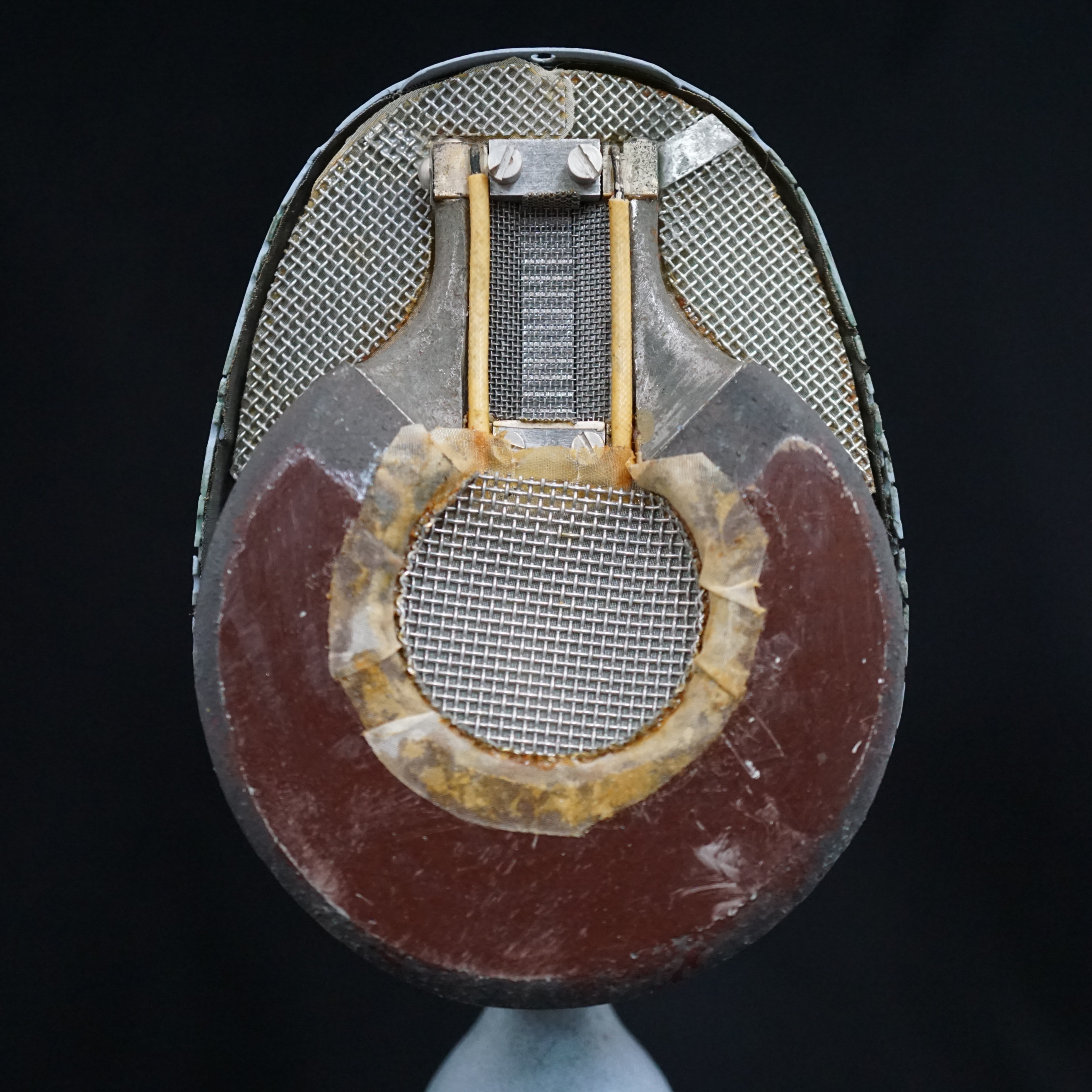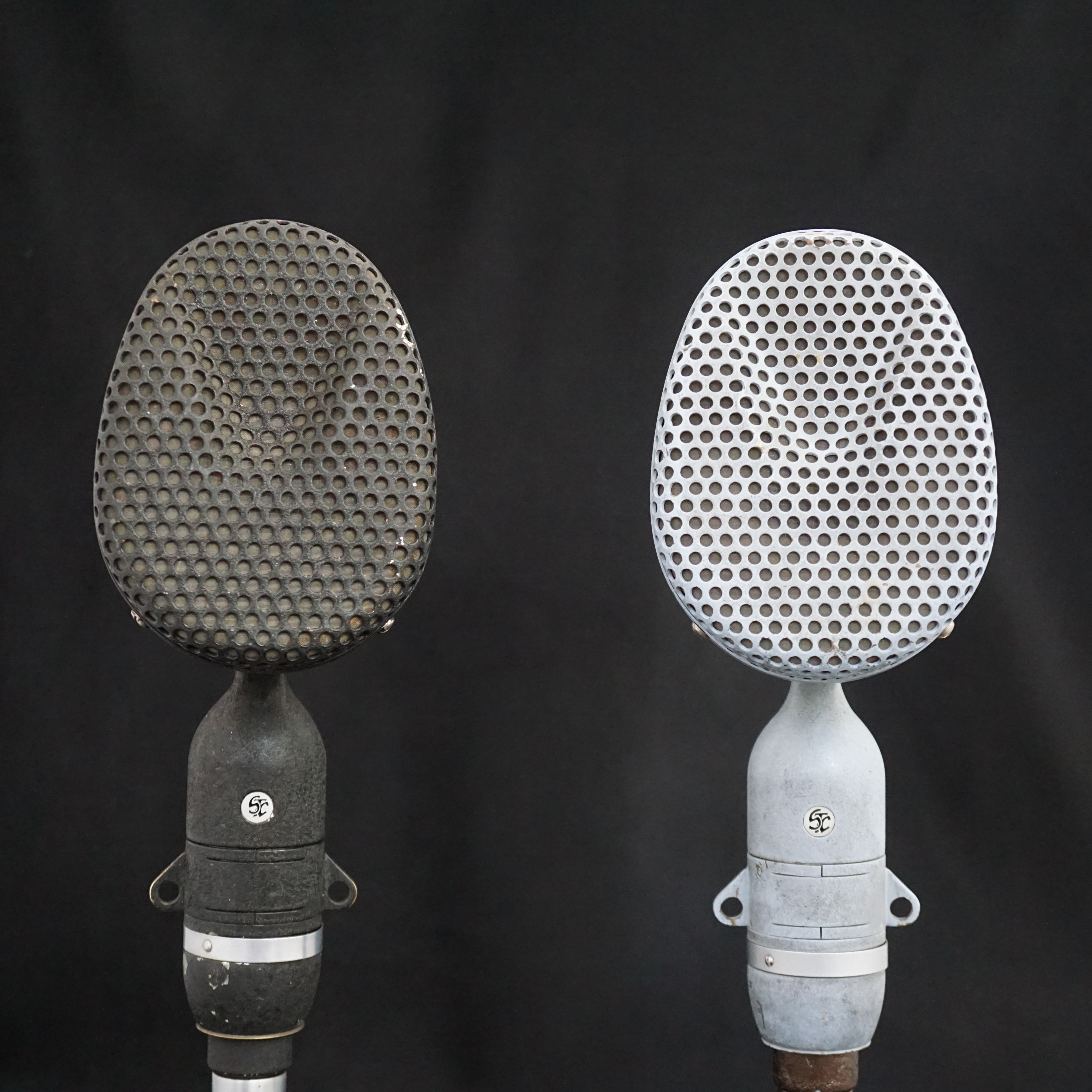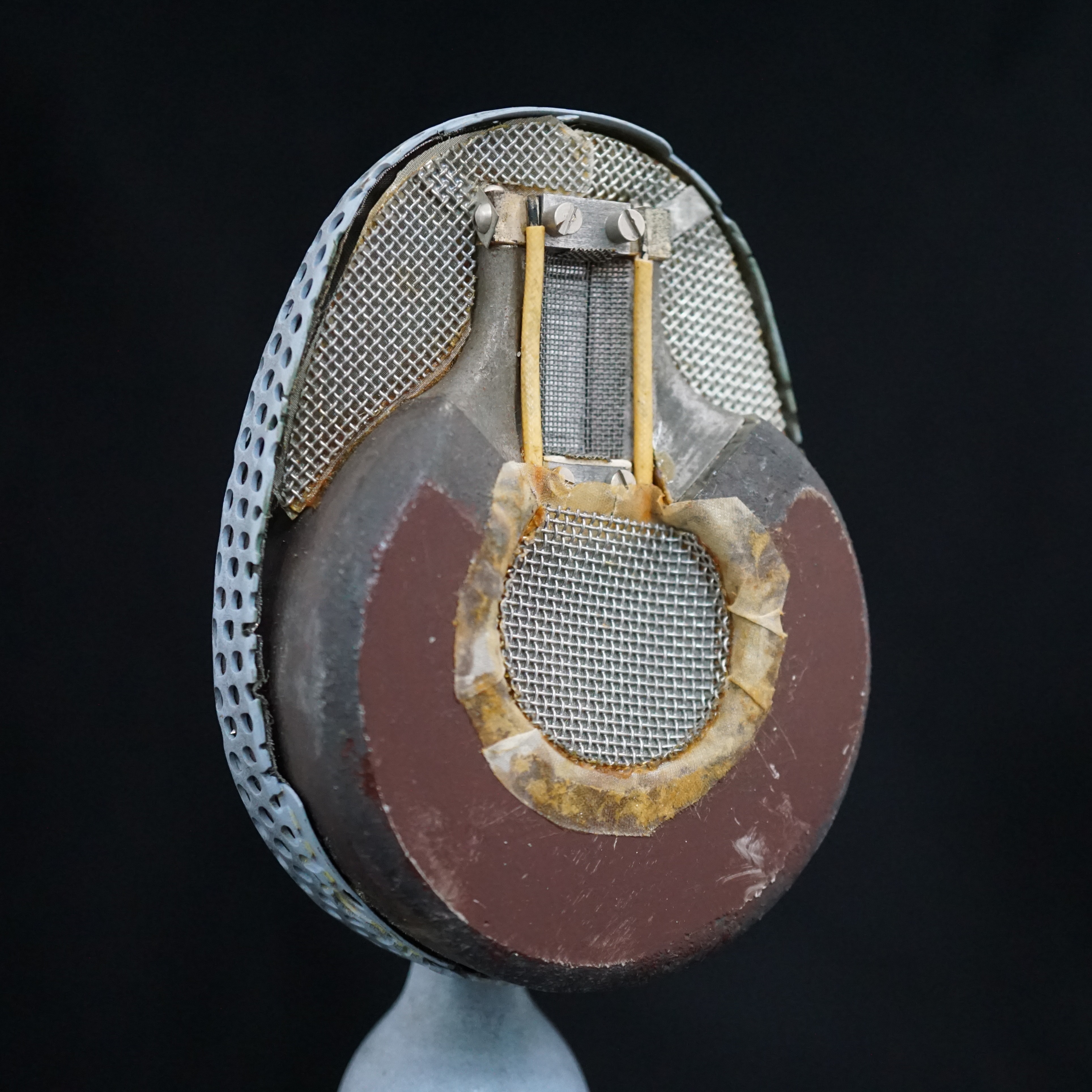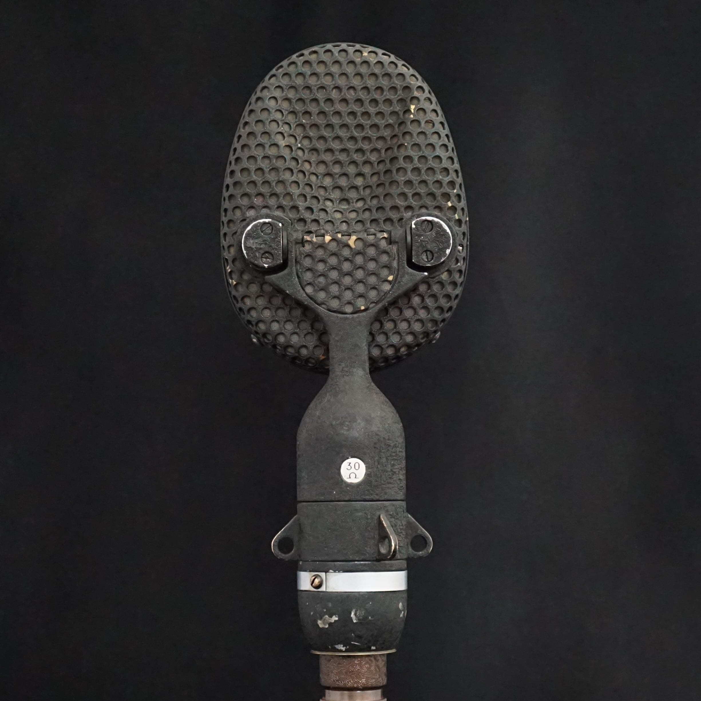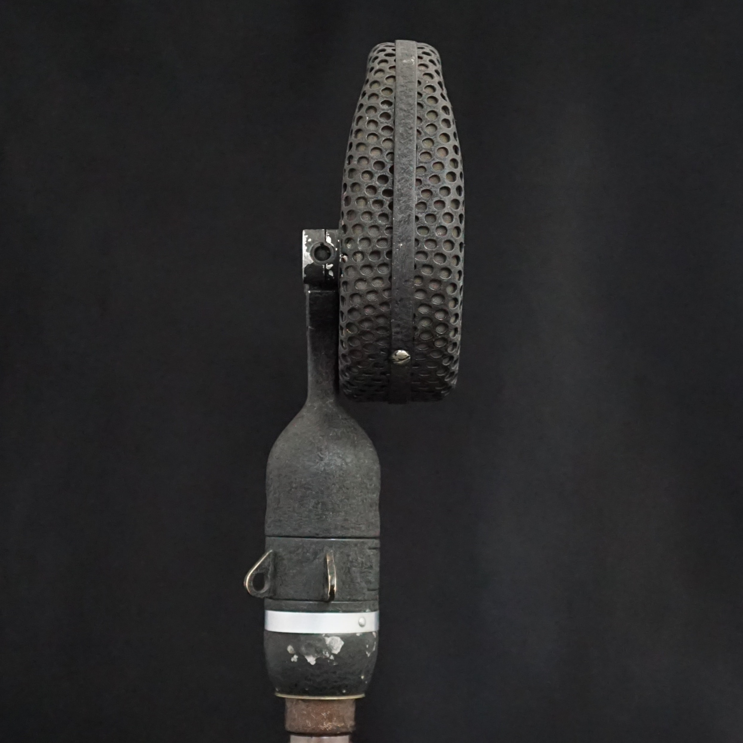 Most of the early STC branded 4038s were either finished in a bronze plating, or a textured black paint. However, ours is pale blue and appears to have been so since it was made - there is no sign of overspray inside the microphone, the paint goes down to the base metal, and it was painted before the inner grills were fitted. We have had two plausible theories, one being that it was a Naval edition, or, more likely, it was for a film or TV set where it needed to be positioned, unseen, against a pale background. Perhaps we will never know the whole story.