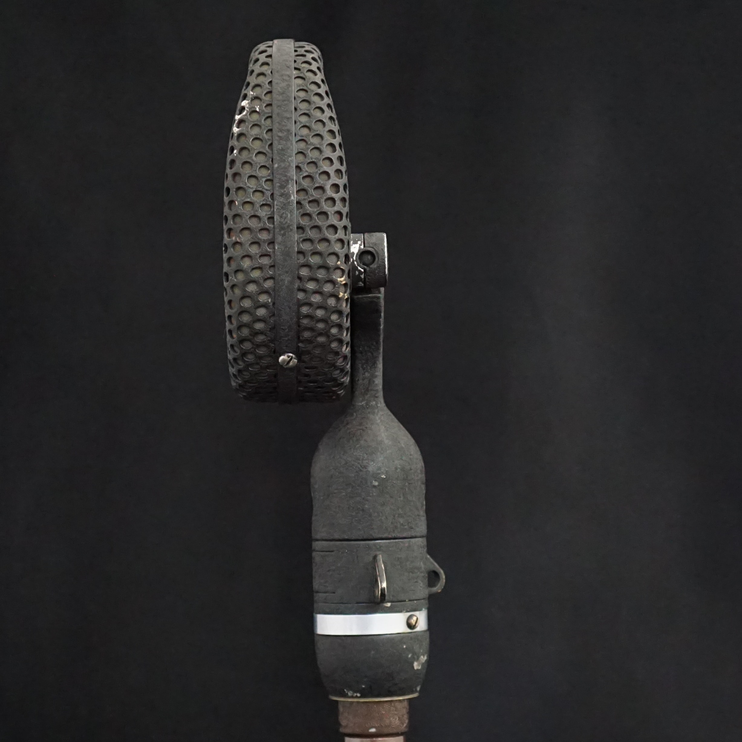 BODY HOUSING: Made of heavy gauge perforated brass backed by finely woven monel mesh. Rotating hinge connection allows microphone to tilt through 90* and turned in any direction when either suspended or free standing.