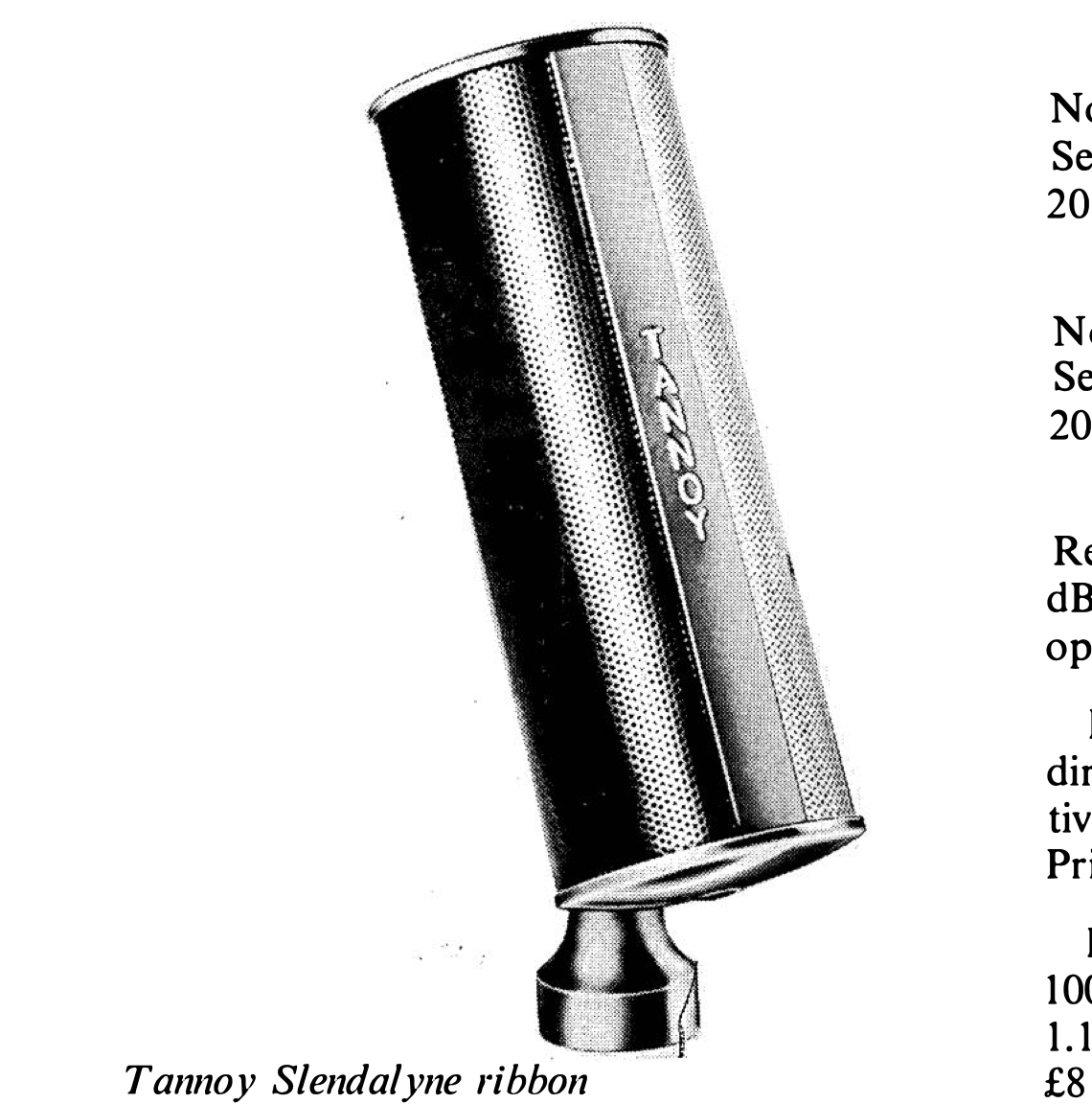 The article announces two new 'Slendalyne' ribbon microphones from Tannoy - a cardioid and a bidirectional version. Yet the cardioid version looks very much like the brass-barrel mic that was supposedly installed into the Houses of Parliament 11 years earlier! This sentence is particularly intriguing: