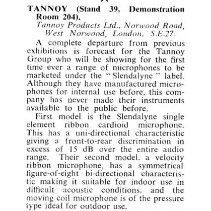 "A complete departure from previous exhibitions is forecast for the Tannoy Group who will be showing for the first time ever a range of microphones to be marketed under the "Slendalyne" label. Although they have manufactured microphones for internal use before, this company has never made their instruments available to the public before. First model is the Slendalyne single element ribbon cardioid microphone. This has a uni-directional characteristic giving a front-to-rear discrimination in excess of 15 dB over the entire audio range. Their second model, a velocity ribbon microphone, has a symmetrical figure-of-eight bi-directional characteristic making it suitable for indoor use in difficult acoustic conditions, and the moving coil microphone is of the pressure type ideal for outdoor use."
