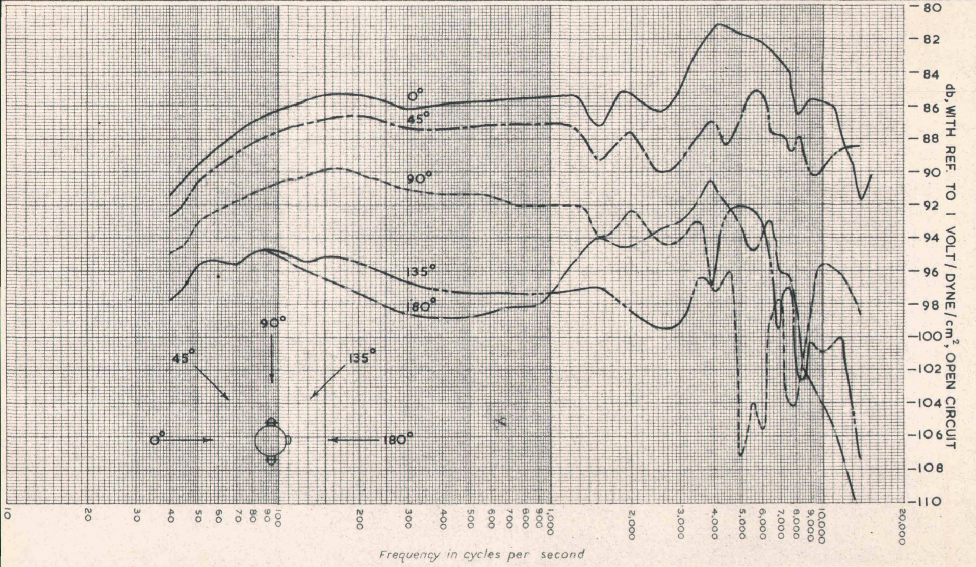 "The axial frequency response, apart from the main rise which can easily be corrected electrically, is quite good. The ratio of front to back response is well maintained over a wide range, but the response characteristics at right angles to the axis are very irregular and fall at high frequencies.