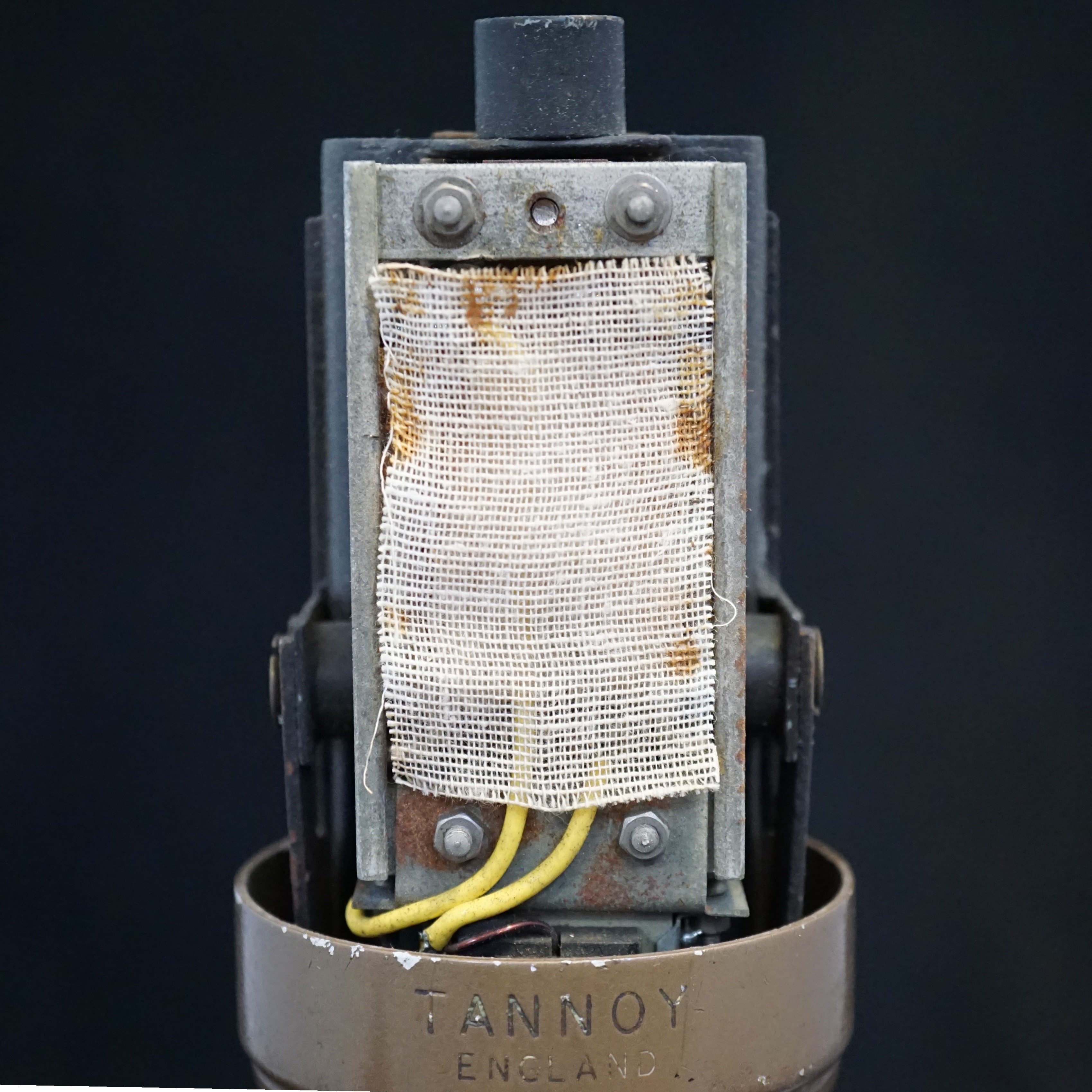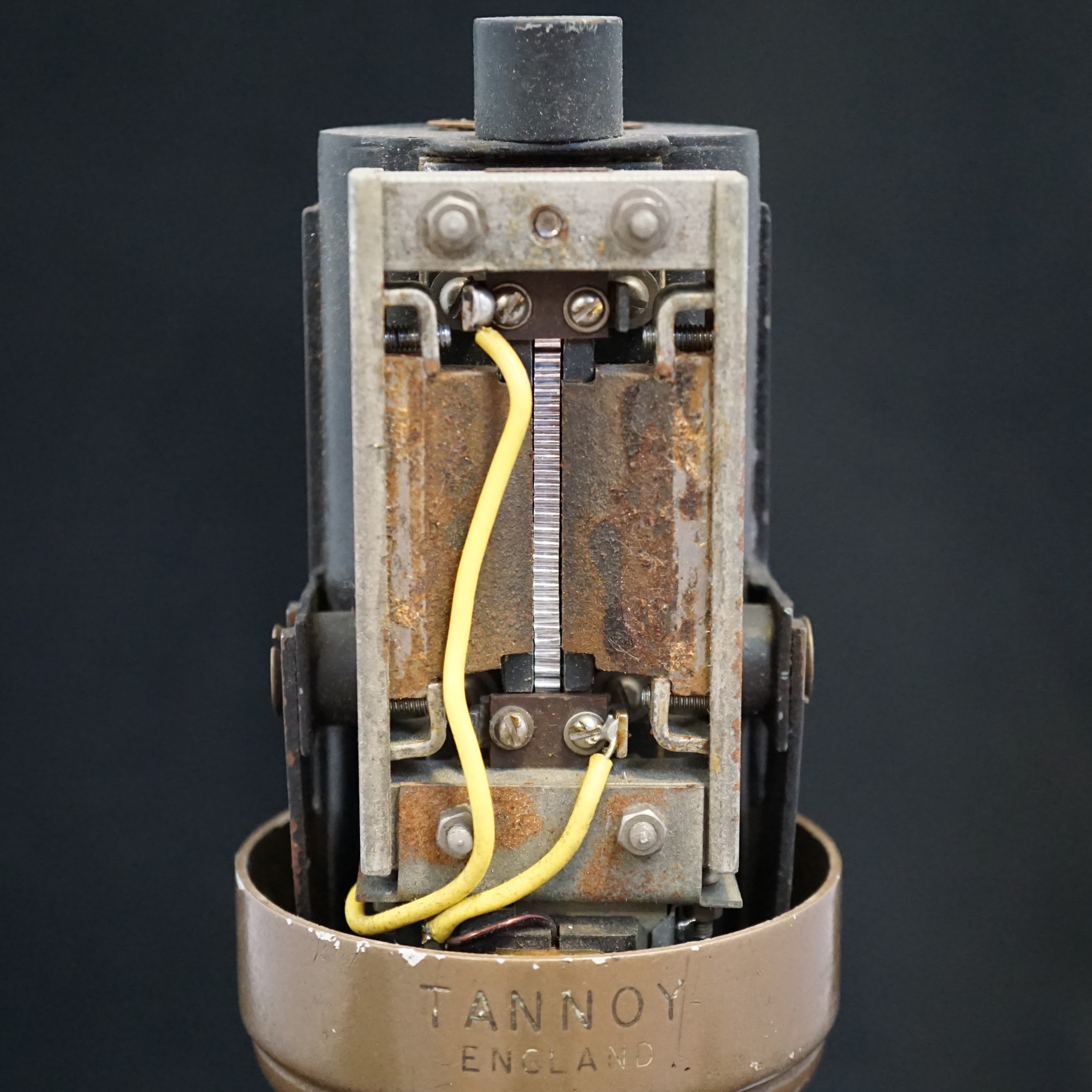 The ribbon and magnet assembly is housed in the upper part of the remaining space, with the ribbon-to-line transformer beneath it. The ribbon is of aluminium foil, 1.5 inches (3.81 cm.) long and approximately 0.1" (0.25 cm.) wide and is mounted between pole pieces 1/8" (0.32 cm) apart.