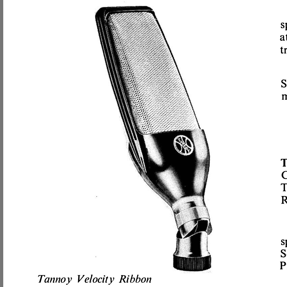 "The most noticeable development in microphones was the widespread emergence of new ribbon designs, of which several were in the low-price category. Improvements in the magnetic system by use of new materials were responsible for one trend. The traditional soft-iron pole pieces with massive energizing magnets at the ends, or covering one face of the ribbon, have disappeared and in their place are bar magnets, magnetized across their width. The result is generally a smaller slimmer structure with, consequently, a better frequency response. Tannoy's Slendalyne and Slendalyne Cardioid use metallic magnets, and the cardioid polar response is obtained by coupling to the back face of the ribbon a tuned and loaded cavity."