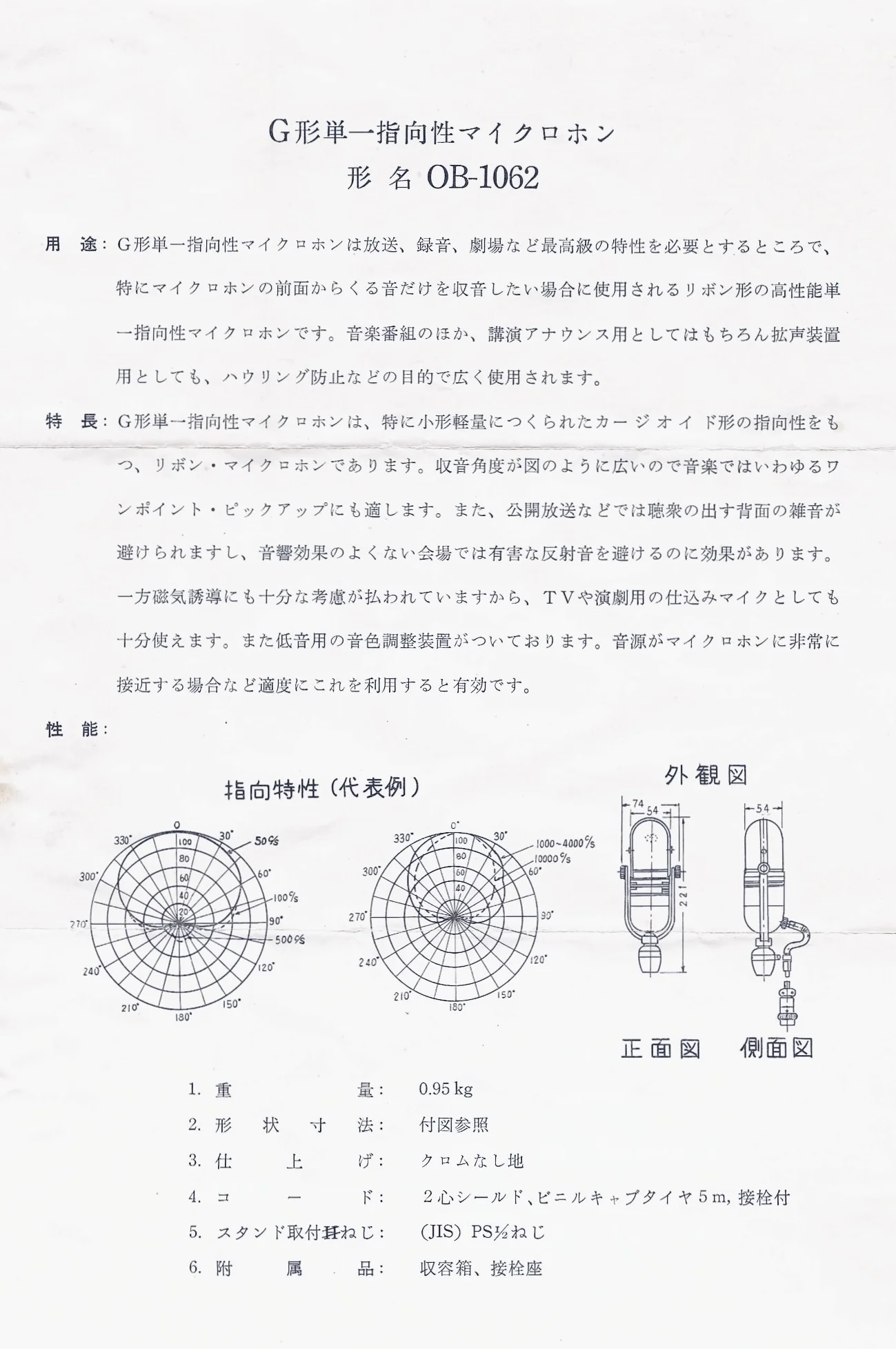 The G-type unidirectional microphone is a particularly small and lightweight ribbon microphone with a cardioid pattern. Its wide pickup angle, as shown in the diagram, makes it suitable for so-called one-point pickup in music. It also helps avoid rear noise from the audience in public broadcasts and is effective in avoiding harmful reflected sound in venues with poor acoustics. Furthermore, careful consideration has been given to magnetic induction, making it suitable for use as a hidden microphone in TV and theater applications. It also comes with a bass tone adjustment device, which can be useful when the sound source is very close to the microphone.