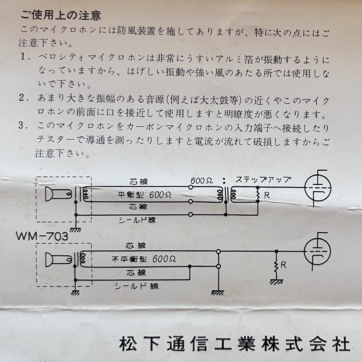 The company that is now known as Panasonic was founded by Konosuke Matsushita, who was born on November 27, 1894 in Wasamura, Japan. He founded that Matshishita Electrical Company in 1917, making electrical sockets and bicycle lights. From 1923 onwards Matsushita traded under the brand 'National', and began manufacturing radio equipment in 1931. The Panasonic brand name appeared on some Matsushita products intended for export from 1955. Today most of their products are sold under the Panasonic brand. Several ribbon microphones appeared under the Matsushita and National brands, including the VM1 and WM series. Many of these mics are quirky with unusual aesthetic and technical features.