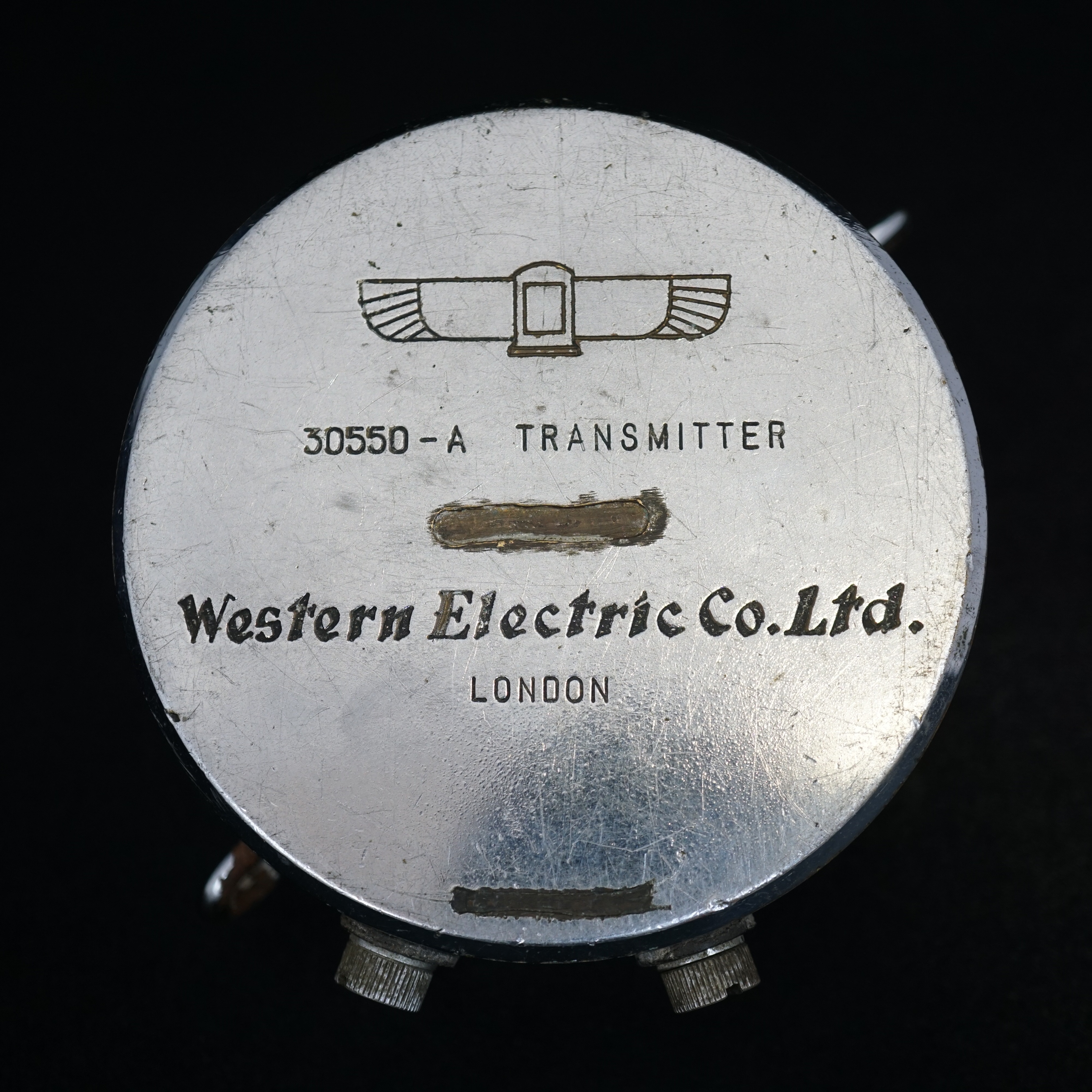 Our microphone is stamped Western Electric Co. Ltd. (London) and so must have been manufactured between 1910 and 1925. It would originally have been suspended in a ring by four springs to reduce vibrations.