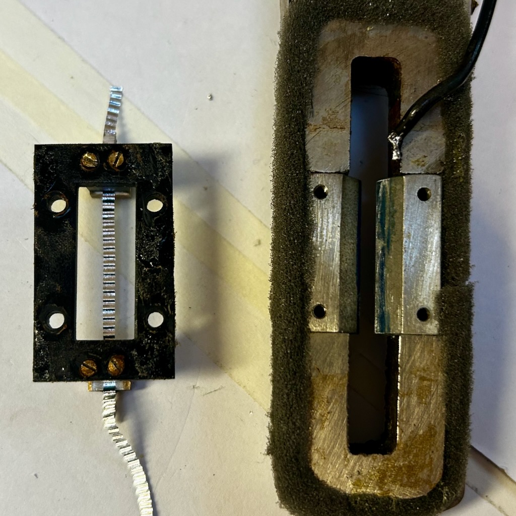 The magnets are still healthy on this one, kicking out around 2500 Gauss between the pole pieces. The ribbon is 2.5 mm wide and 28 mm long, similar in scale to a Reslo RBL or Grampian microphone.