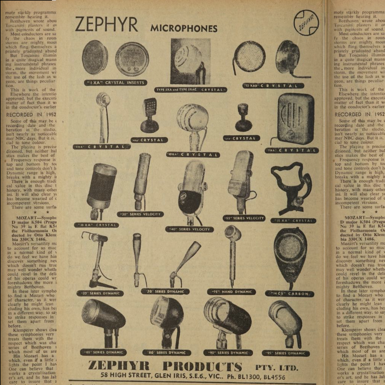Zephyr were an Australian company based in Victoria who manufactured various audio equipment. They built a surprisingly wide range of microphones in the 1950s and 60s, and also imported products from other brands. They published widely in Australian amateur radio magazines in the 1950s, but by the late 1960s they concentrataed on selling imported models from Japanese brands.